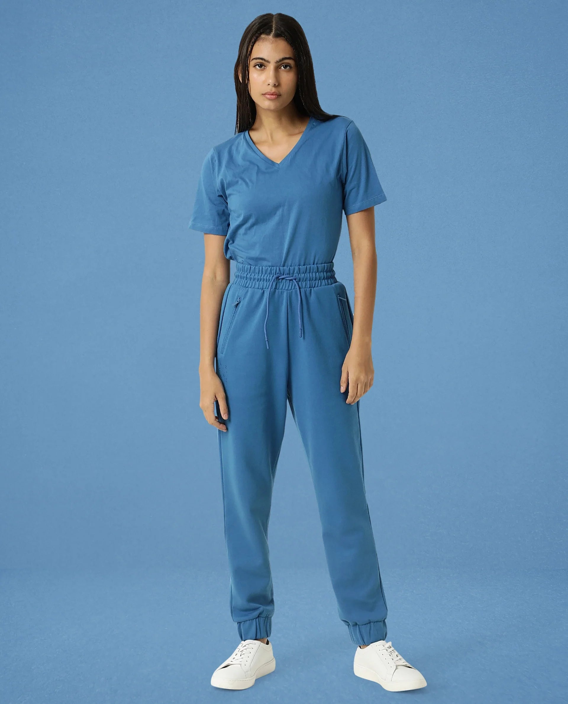 Rareism Women Creta Petrol Cotton Blend Fabric Relaxed Fit Solid Mid Rise Ankle Length Track Pant