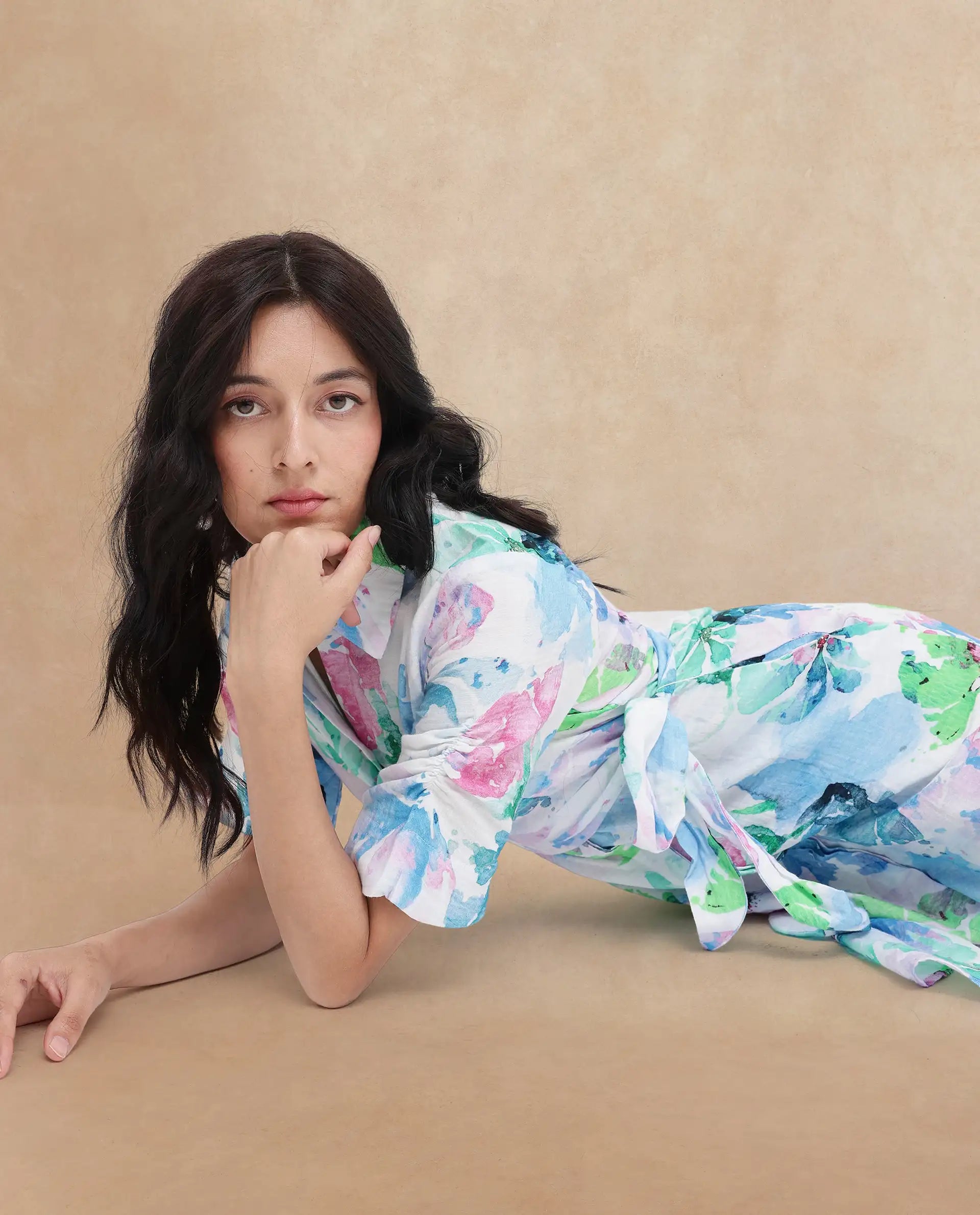 Rareism Women Dyusa Multi Cotton Fabric Short Sleeve Collared Neck Floral Print Longline Dress