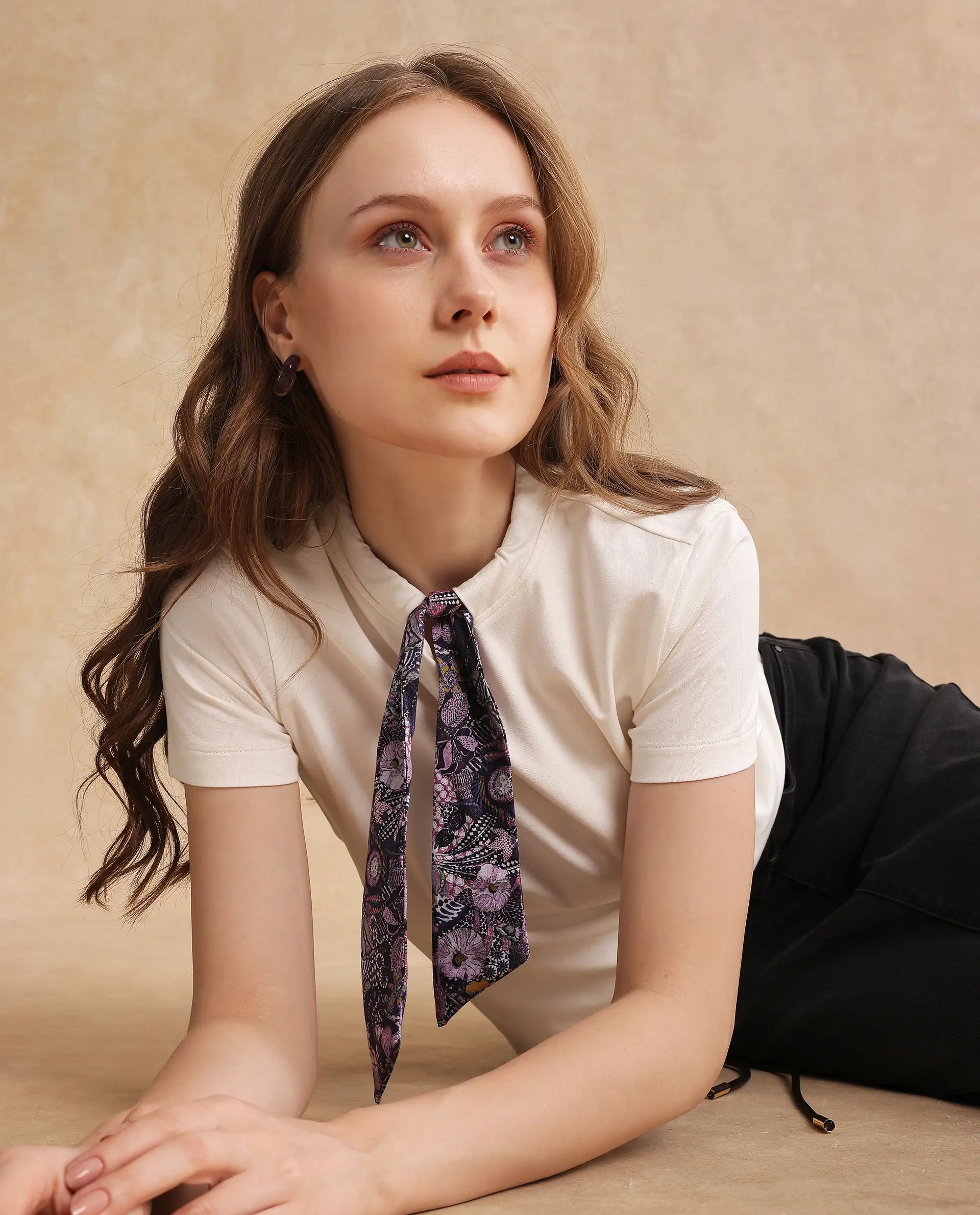 Rareism Women Hosta Off White Cotton Blend Fabric Short Sleeve Crew Neck T-Shirt