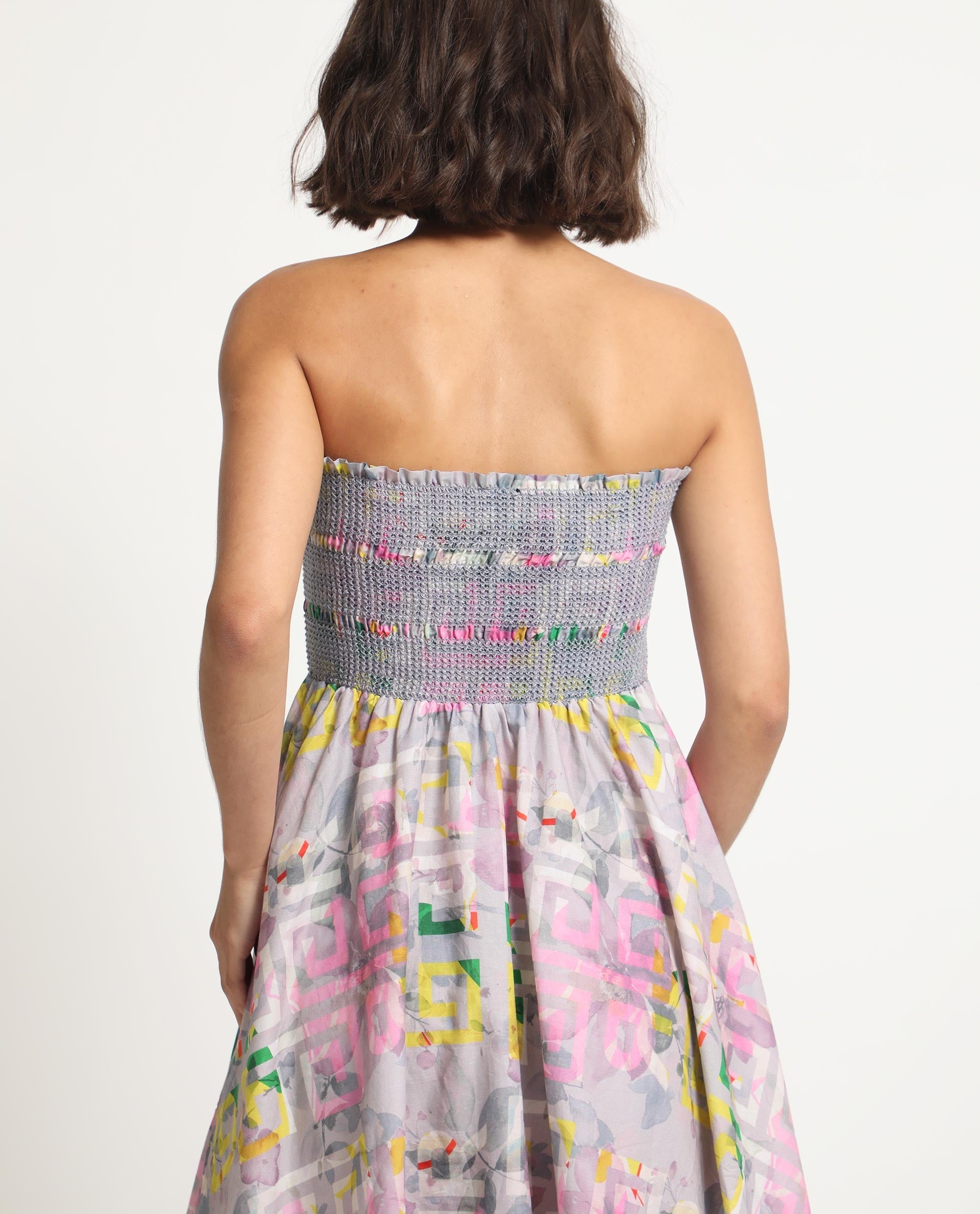 1. Unveil the charm of our Floral Geometric Print Tube Dress, a blend of elegance and playfulness.