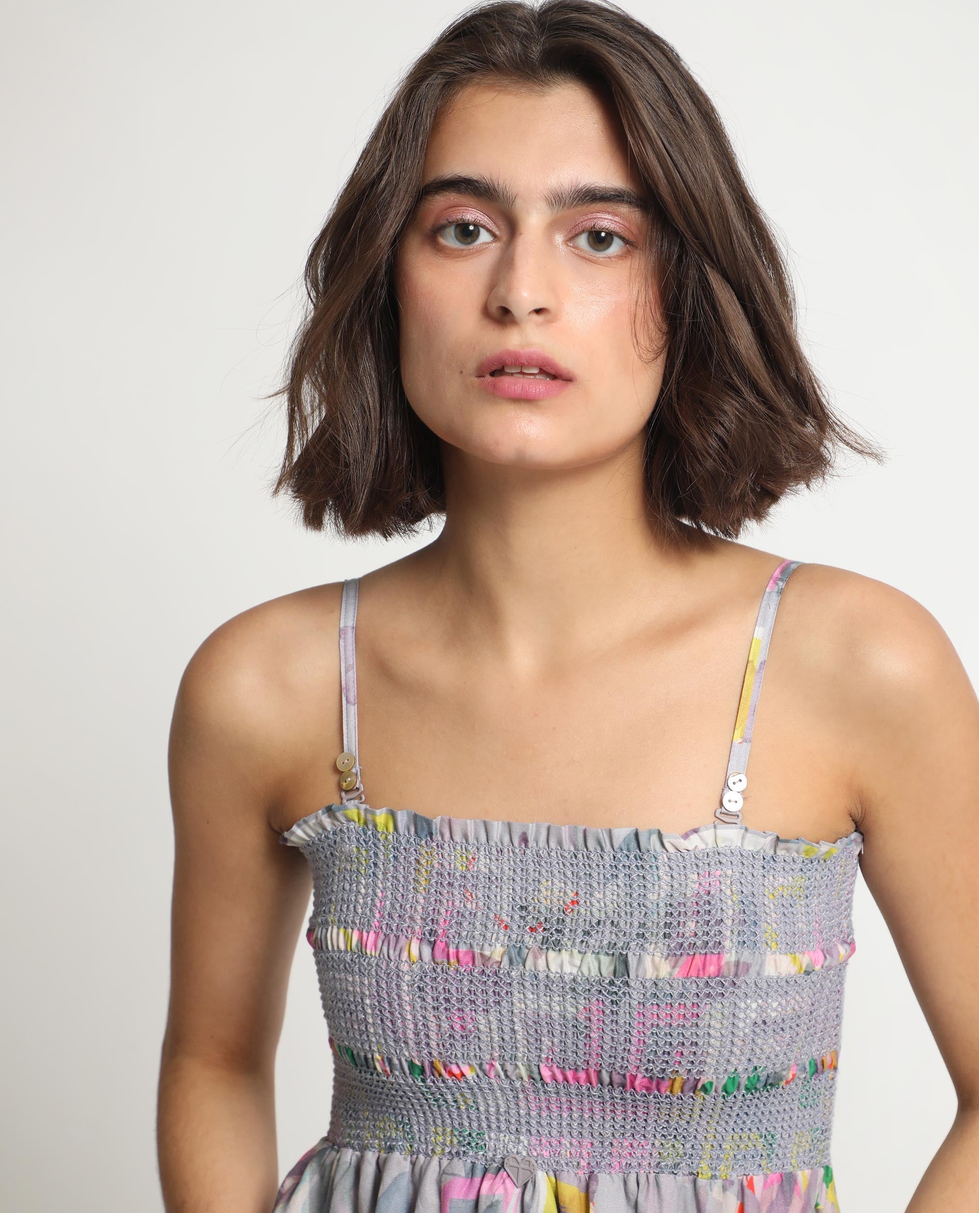 2. Detachable straps offer versatile styling options, allowing for a strapless or strapped look. 3. Intricate smocking details add a touch of sophistication and a flattering silhouette.