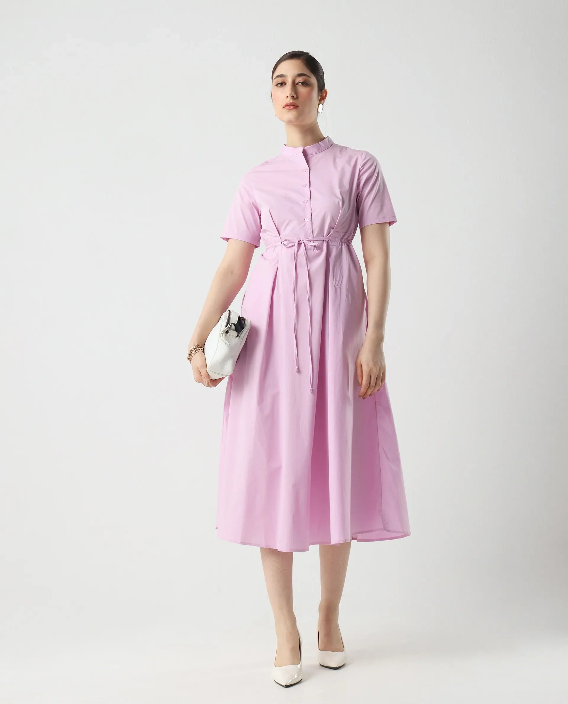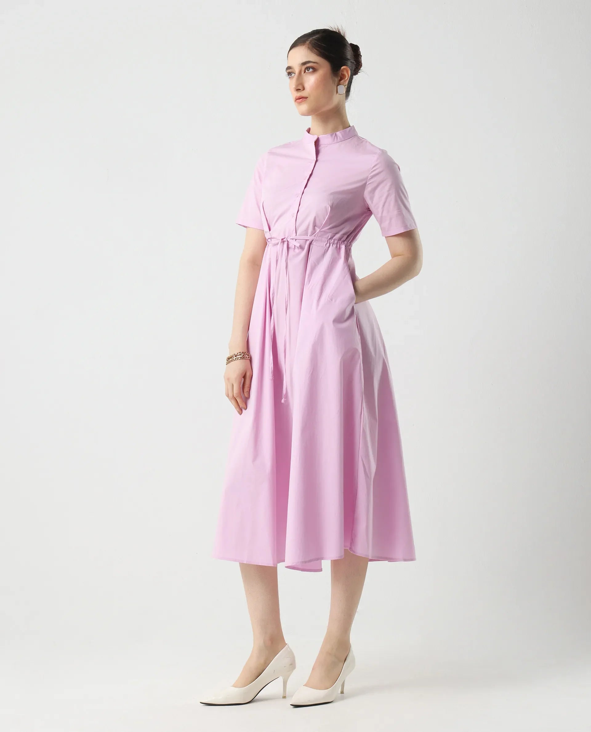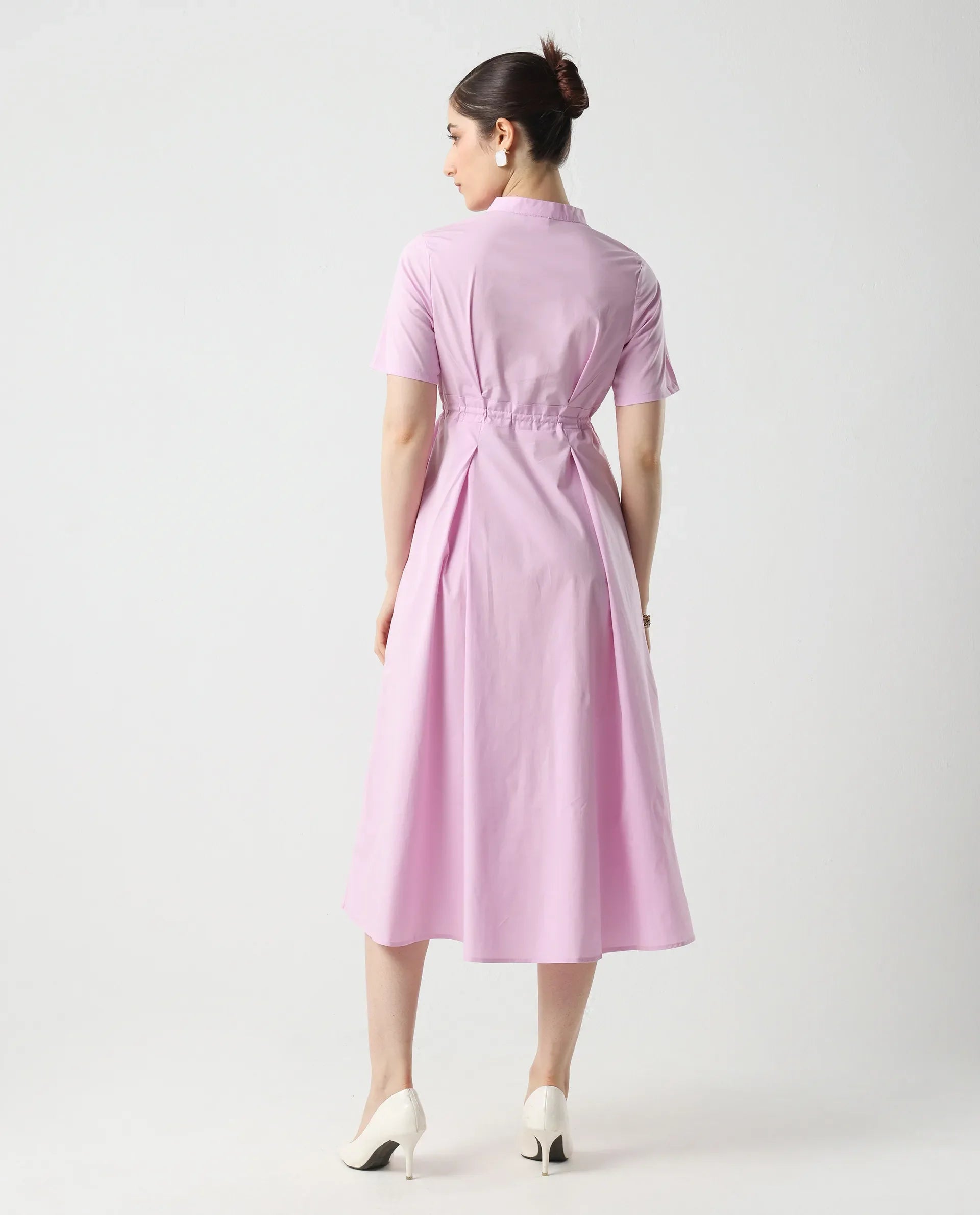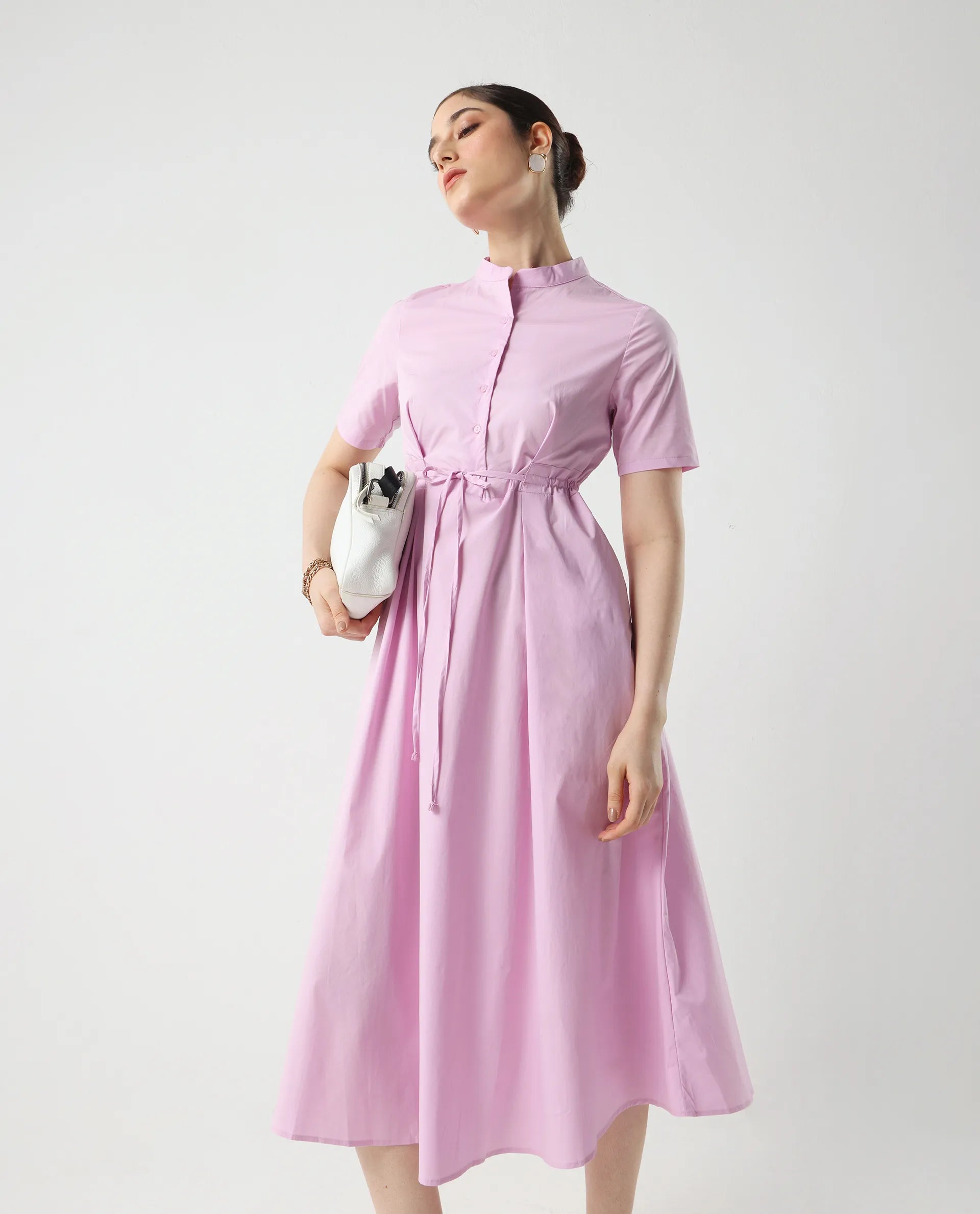 Rareism Women's Sede Pink Cotton Blend Fabric Mandarin Collar Tie-Up Closure Half Sleeve Plain Flared Midi Dress