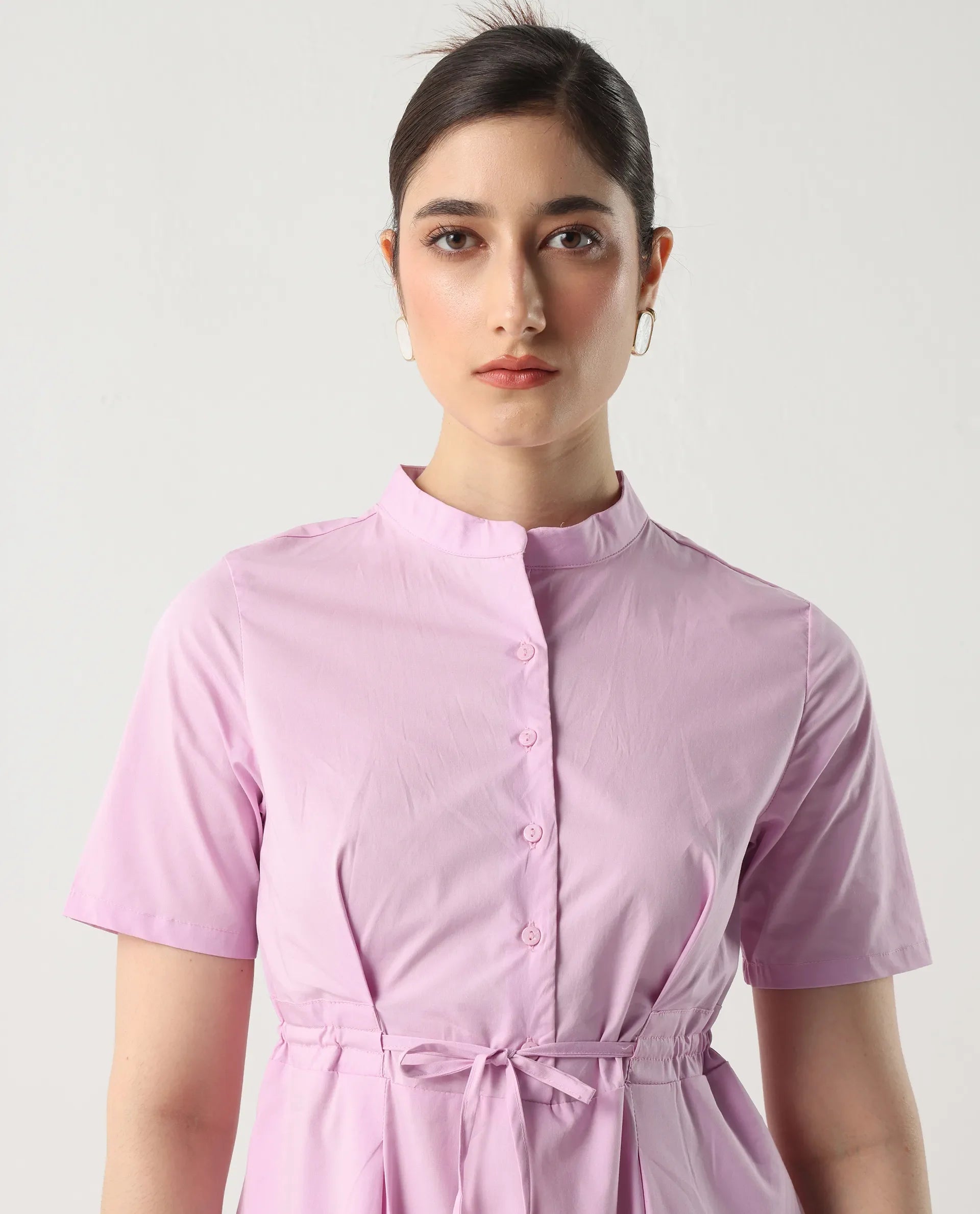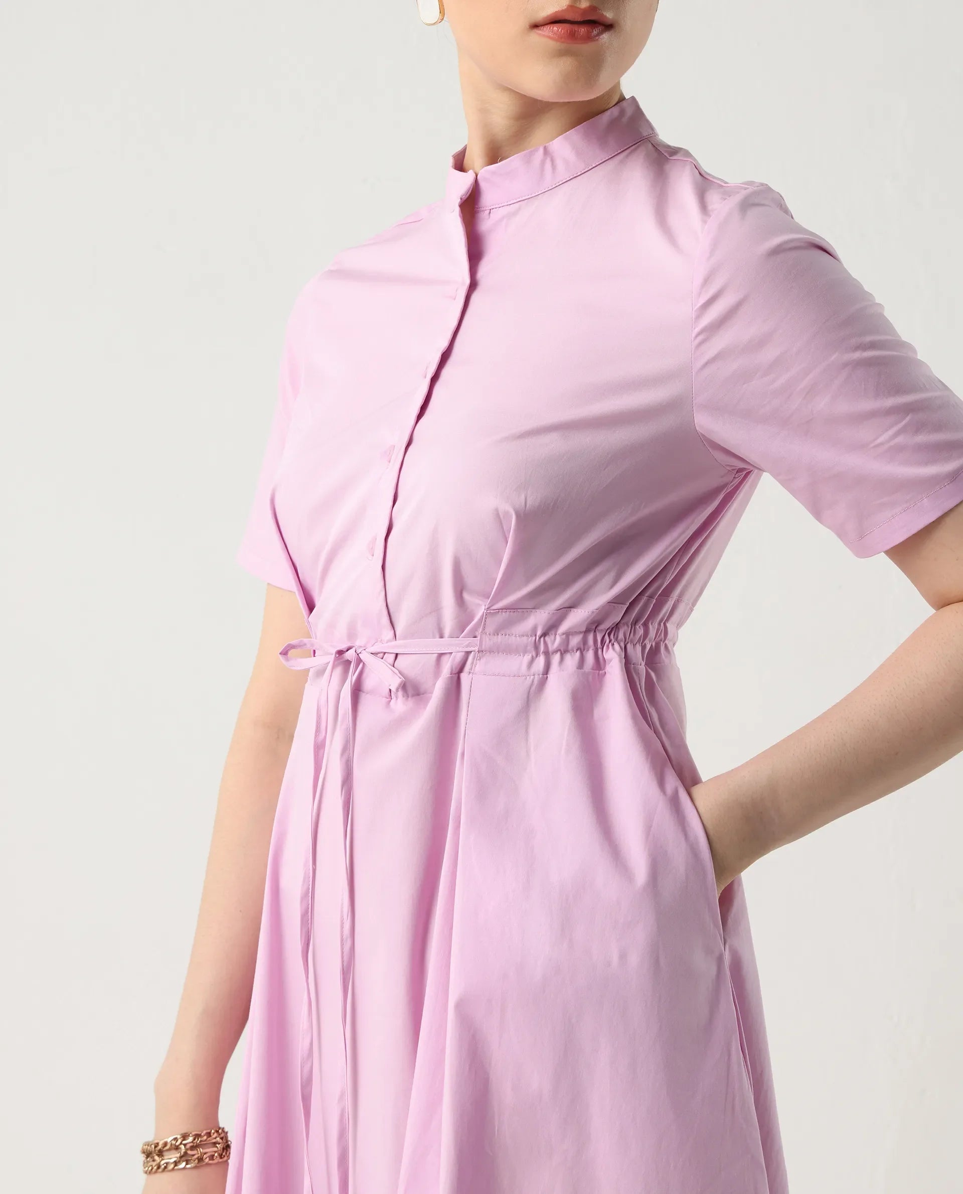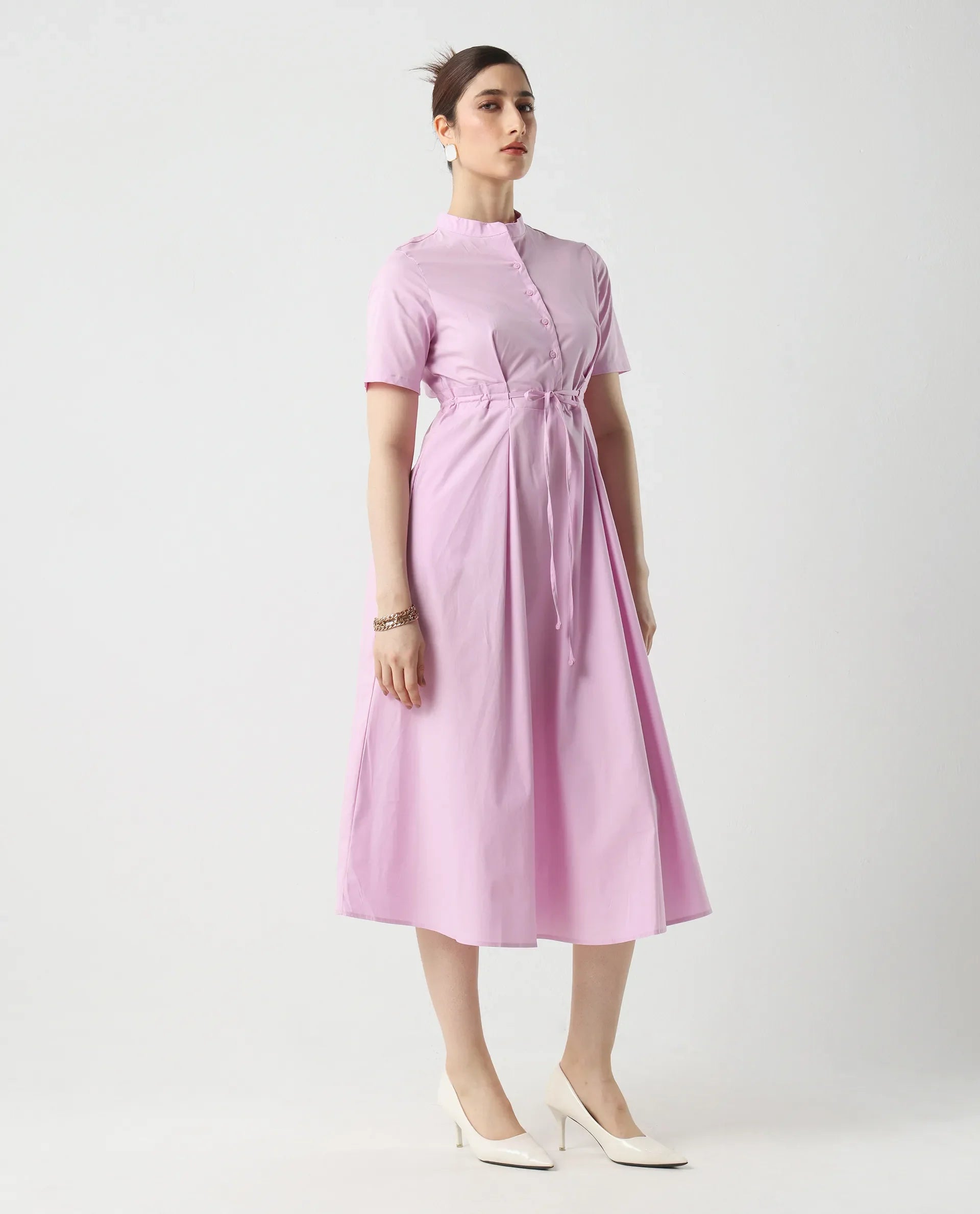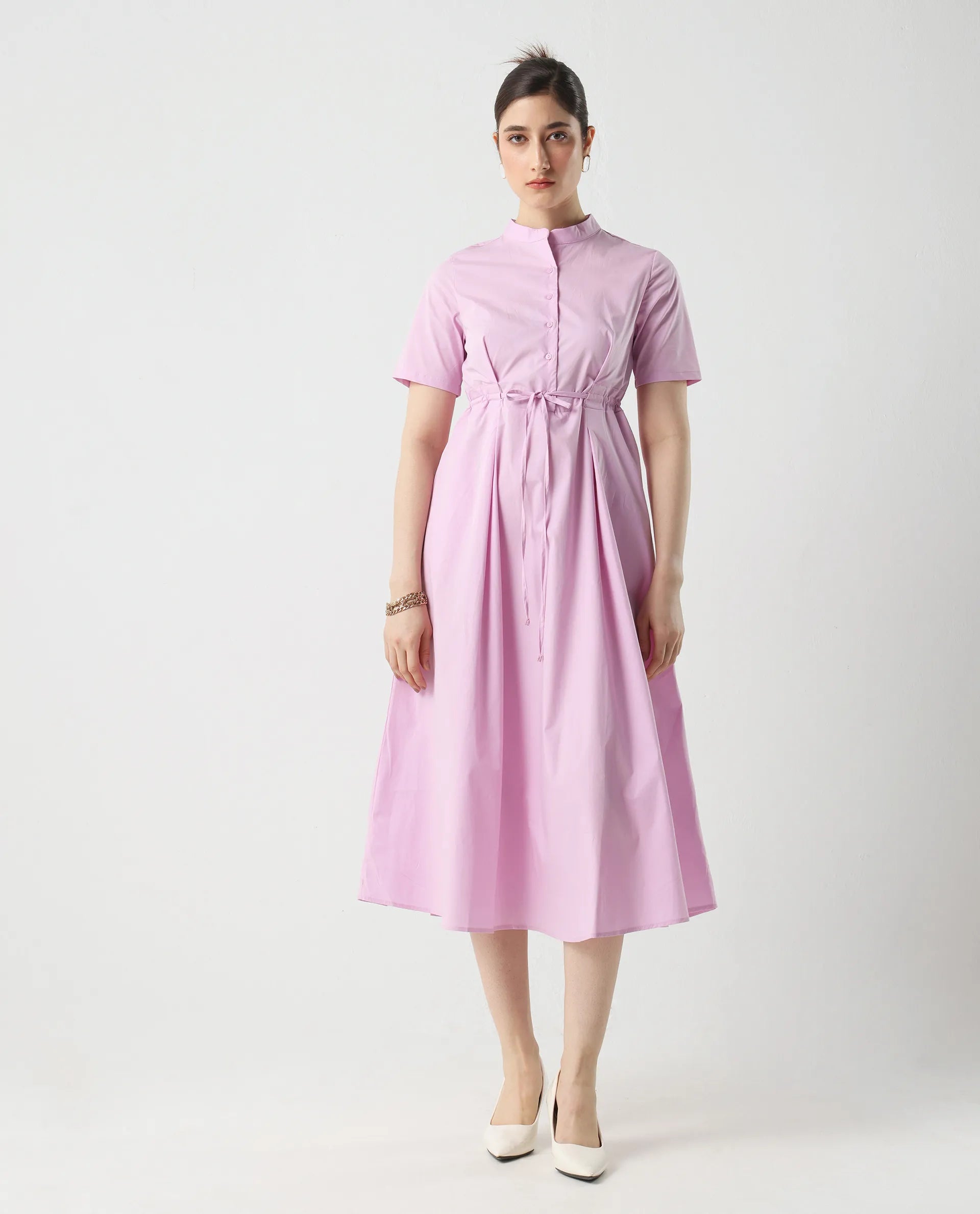 Rareism Women's Sede Pink Cotton Blend Fabric Mandarin Collar Tie-Up Closure Half Sleeve Plain Flared Midi Dress