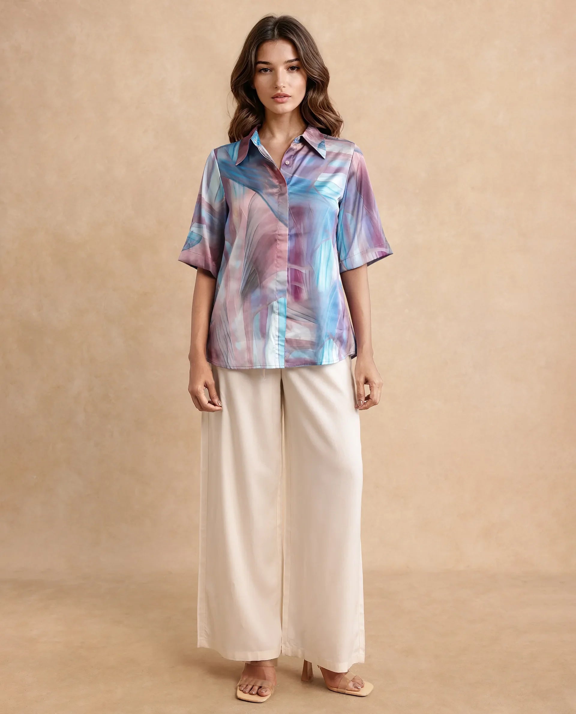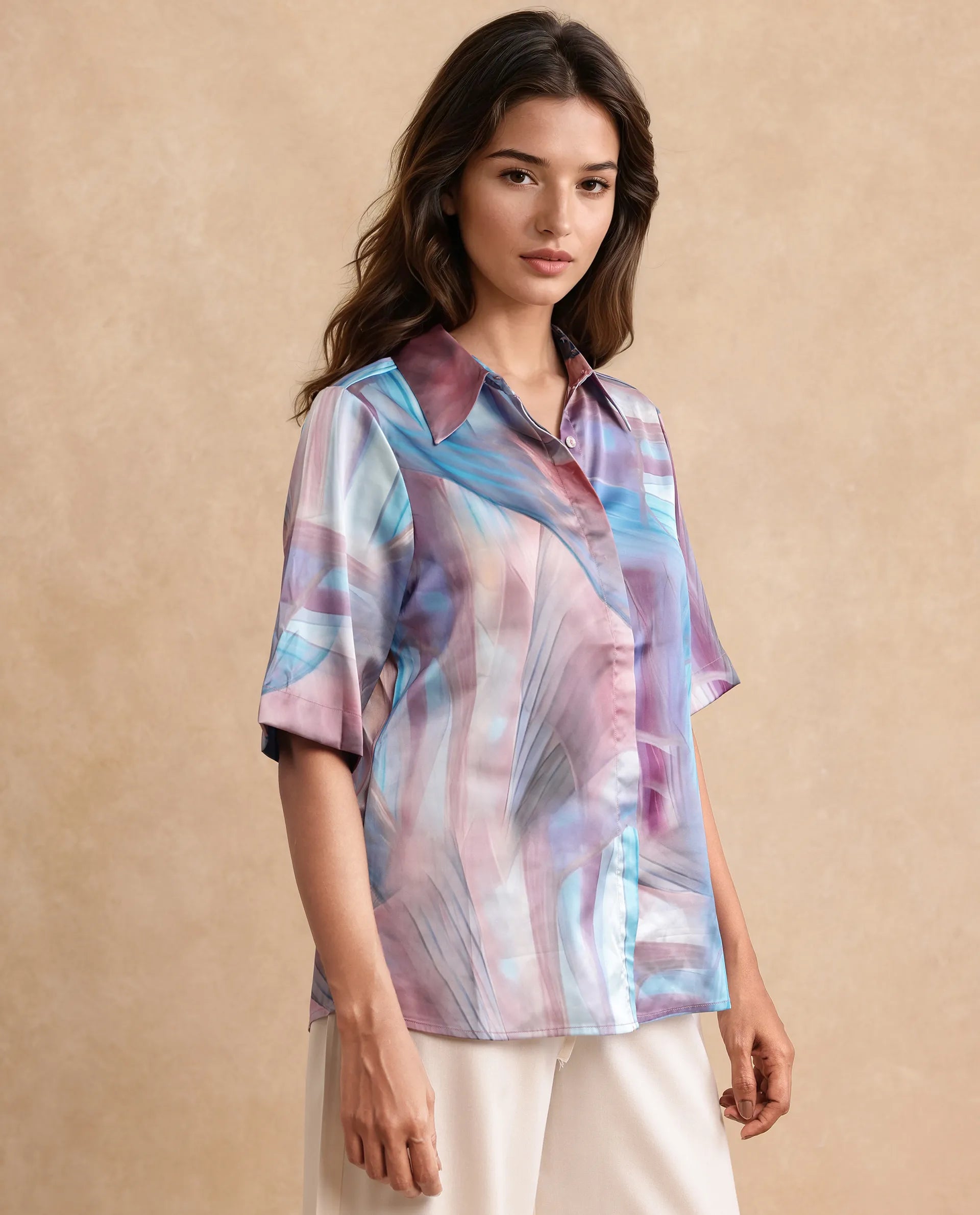 Rareism Women Setimio Multi Satin Short Sleeve Collared Neck Button Closure Abstract Print Shirt