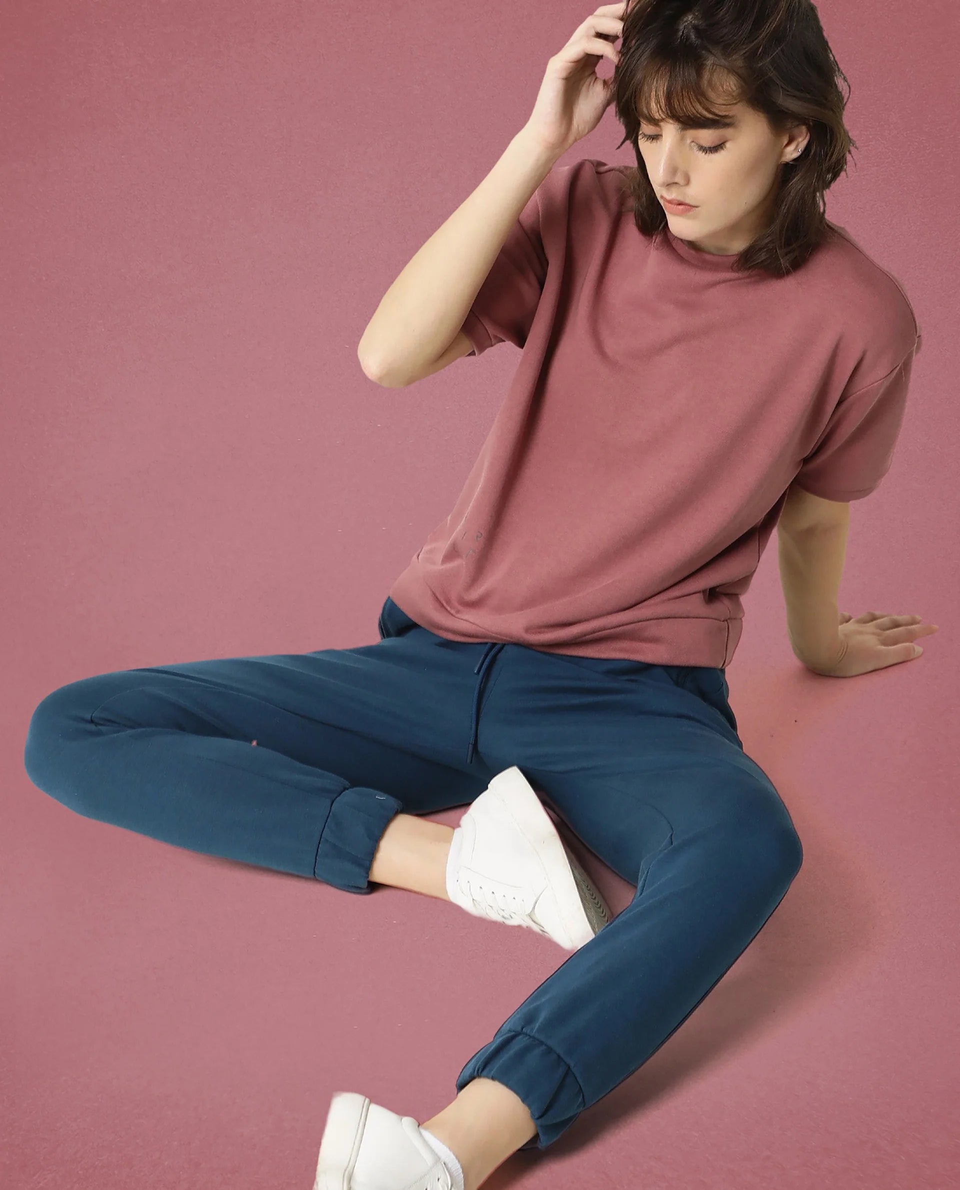 Rareism Women Coco Dark Pink Cotton Fabric Half Sleeves Relaxed Fit Solid Round Neck Sweat Tee