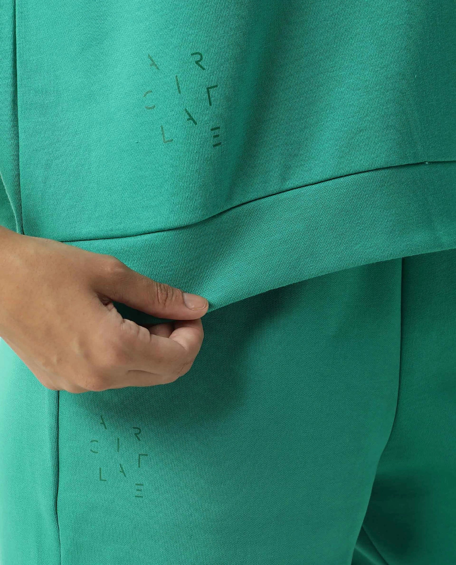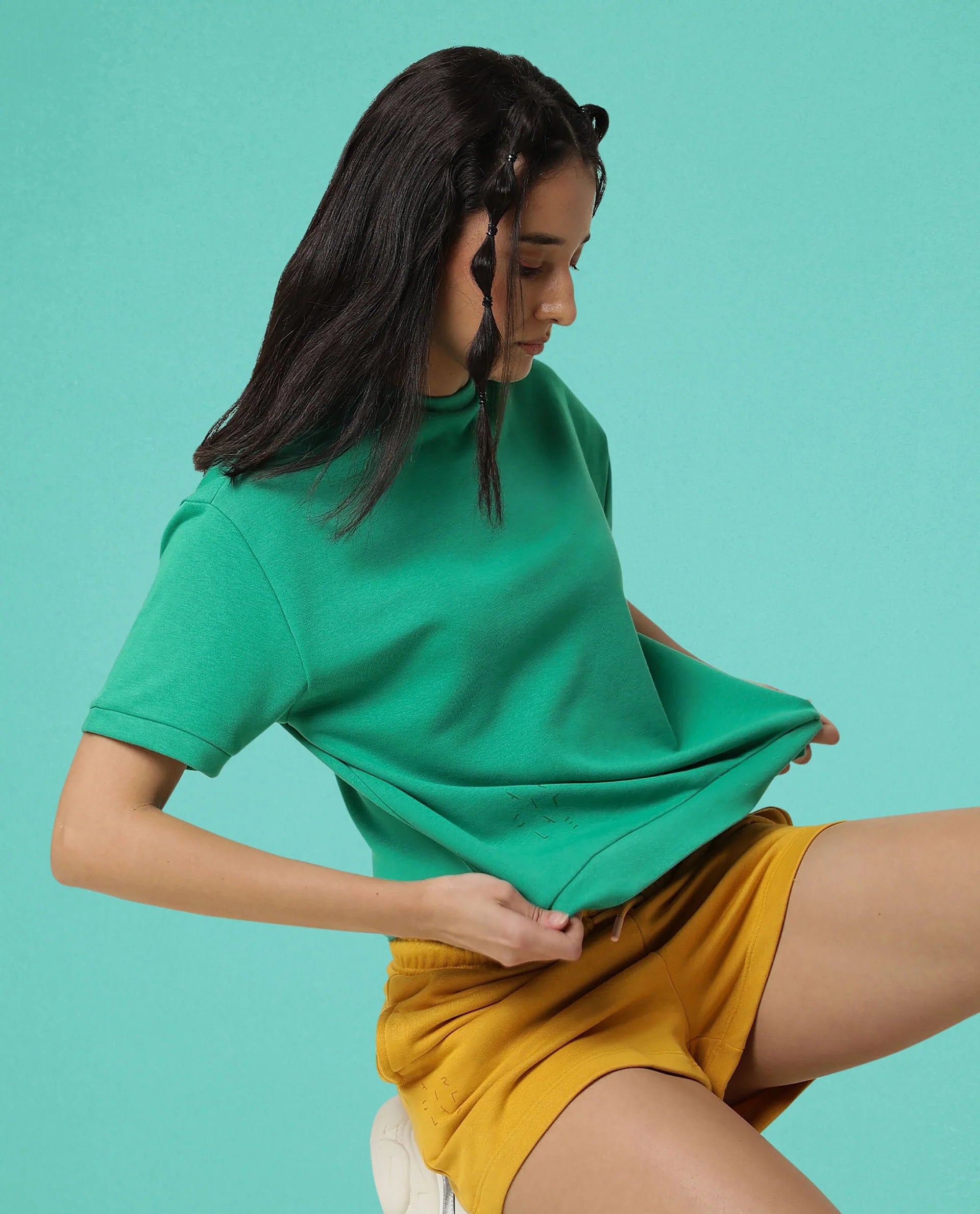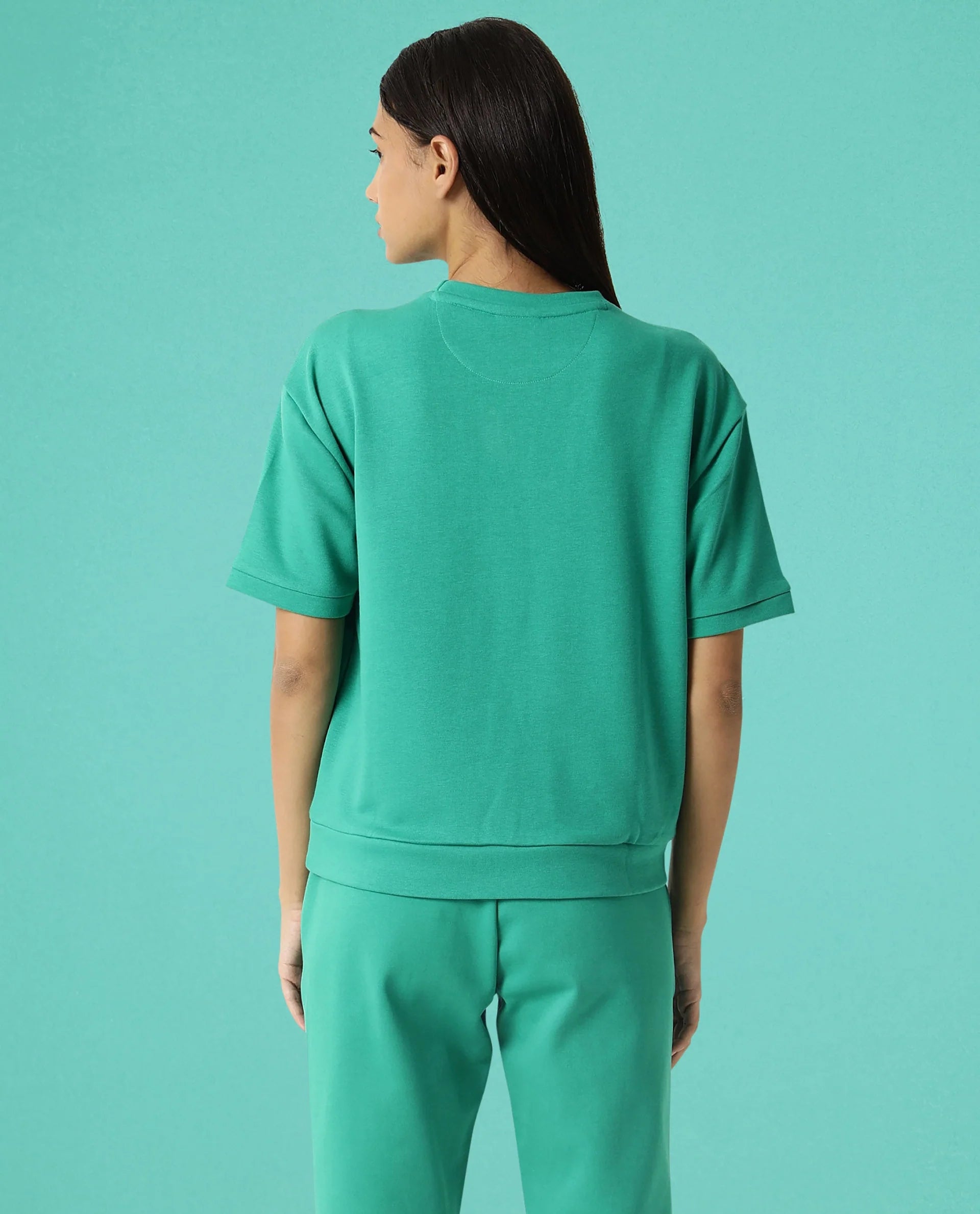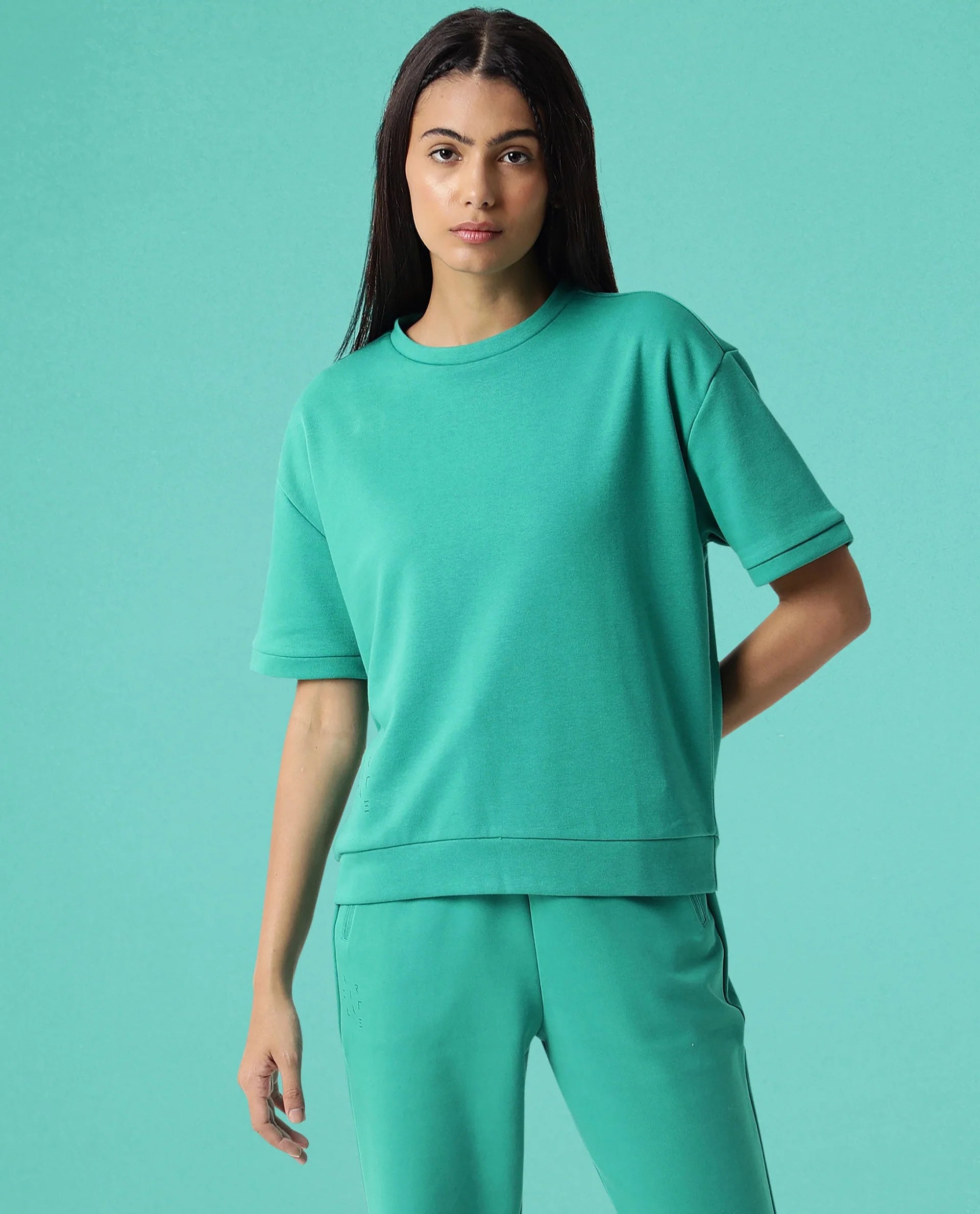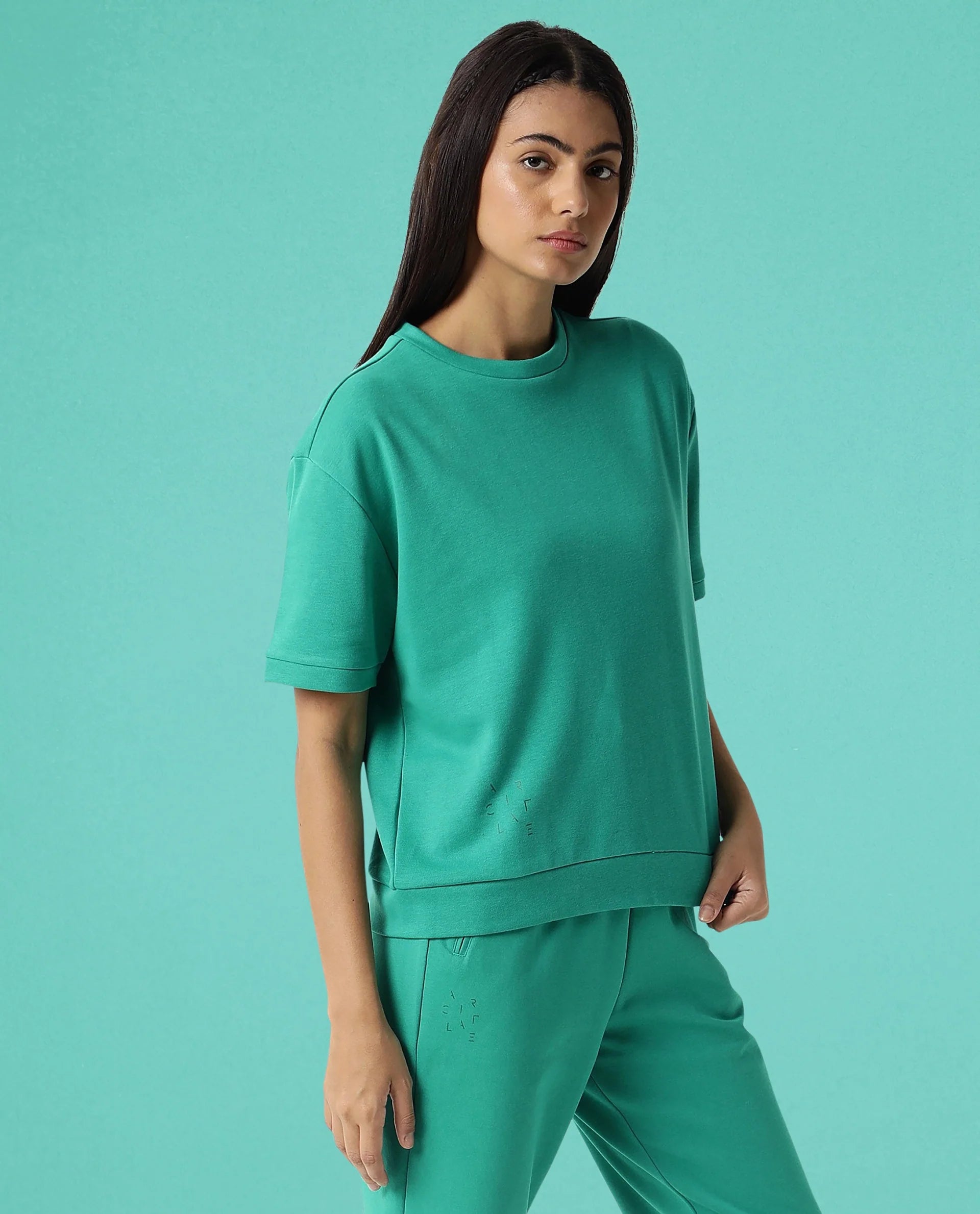 Rareism Women Coco Green Cotton Fabric Half Sleeves Relaxed Fit Solid Round Neck Sweat Tee