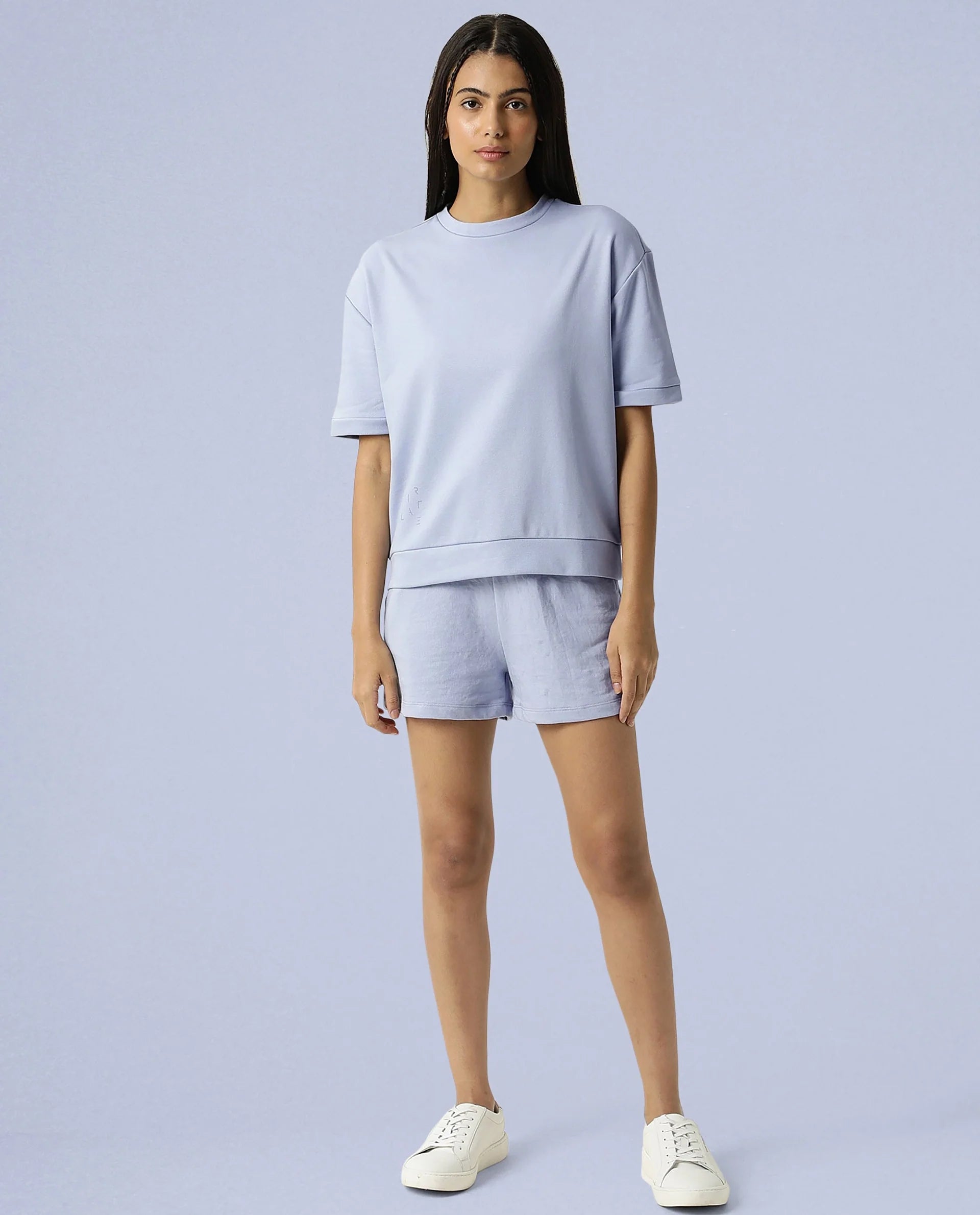 Rareism Women Coco Light Blue Cotton Fabric Half Sleeves Relaxed Fit Solid Round Neck Sweat Tee