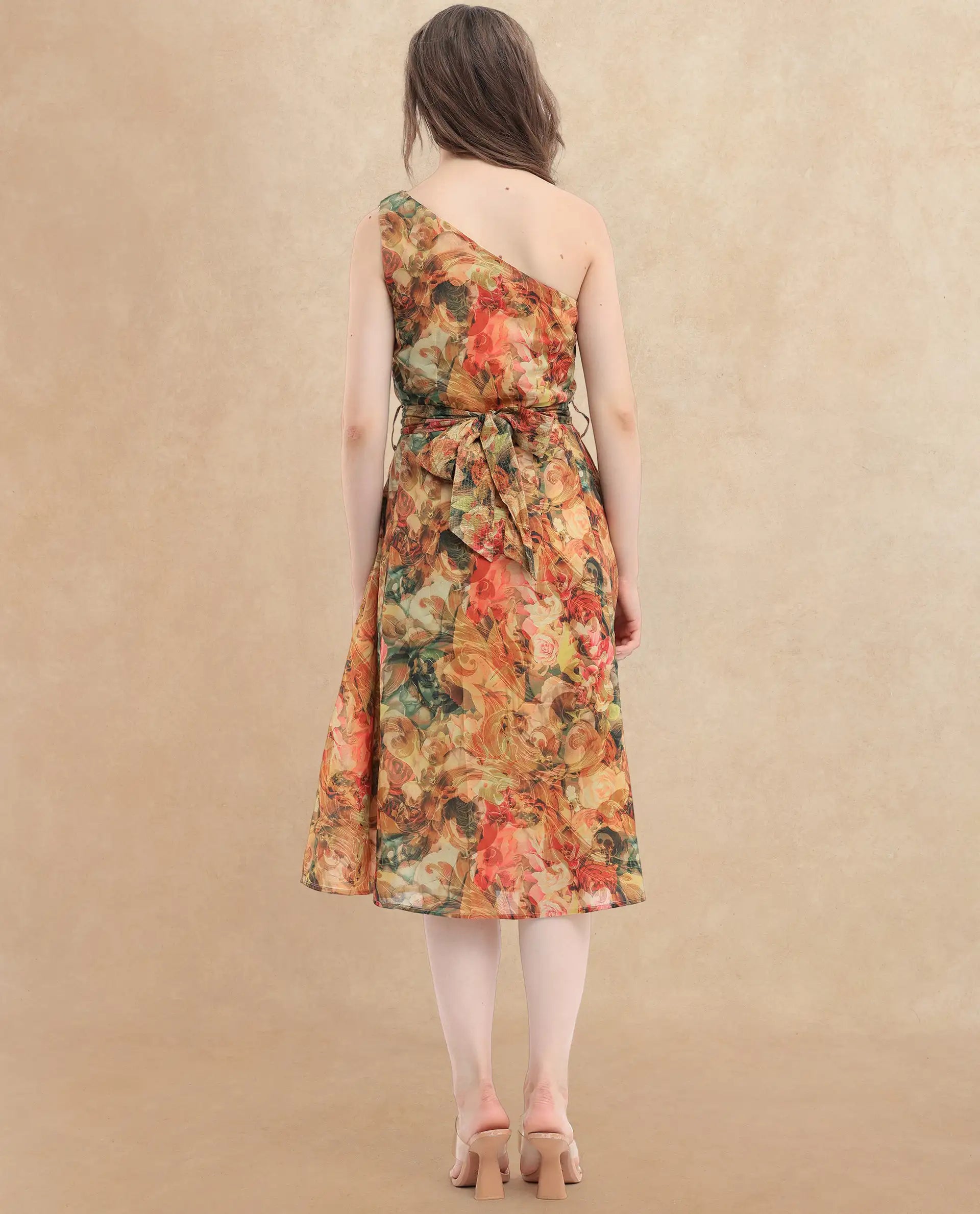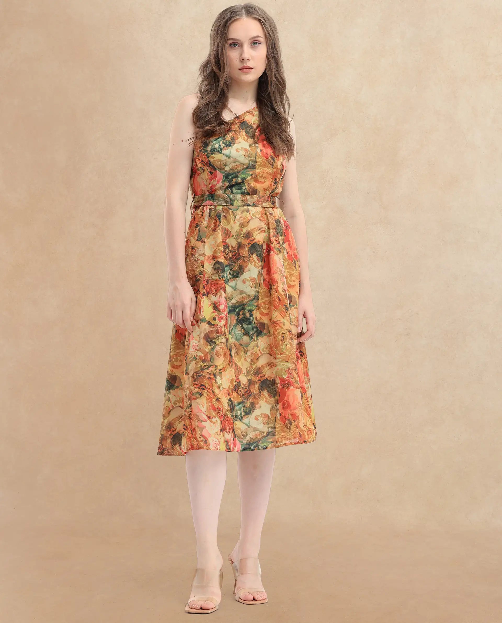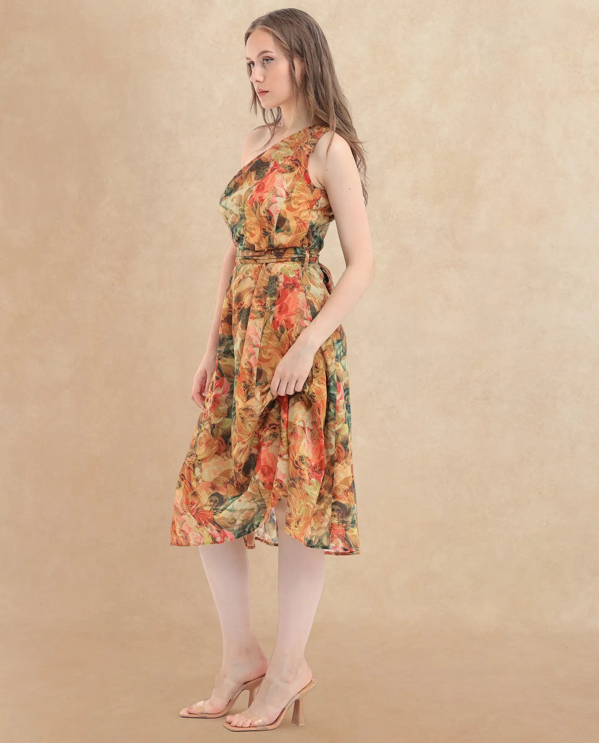 Rareism Women Barney Multi Cotton Fabric Sleeveless Tie-Up Closure One Shoulder One Shoulder Regular Fit Abstract Print Midi Dress