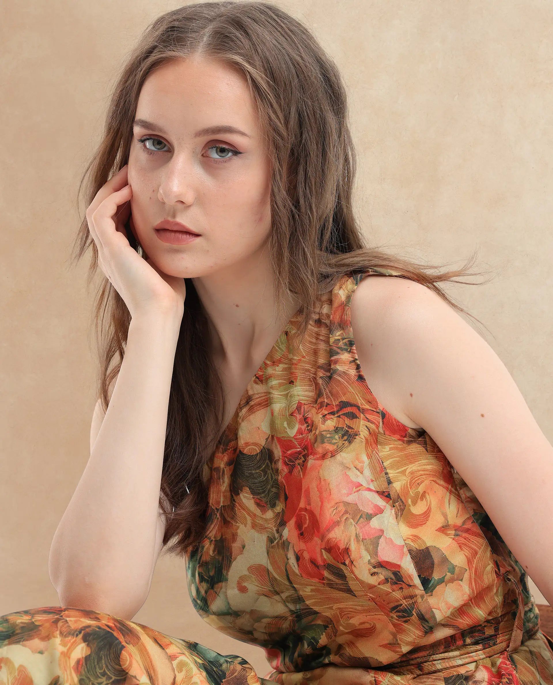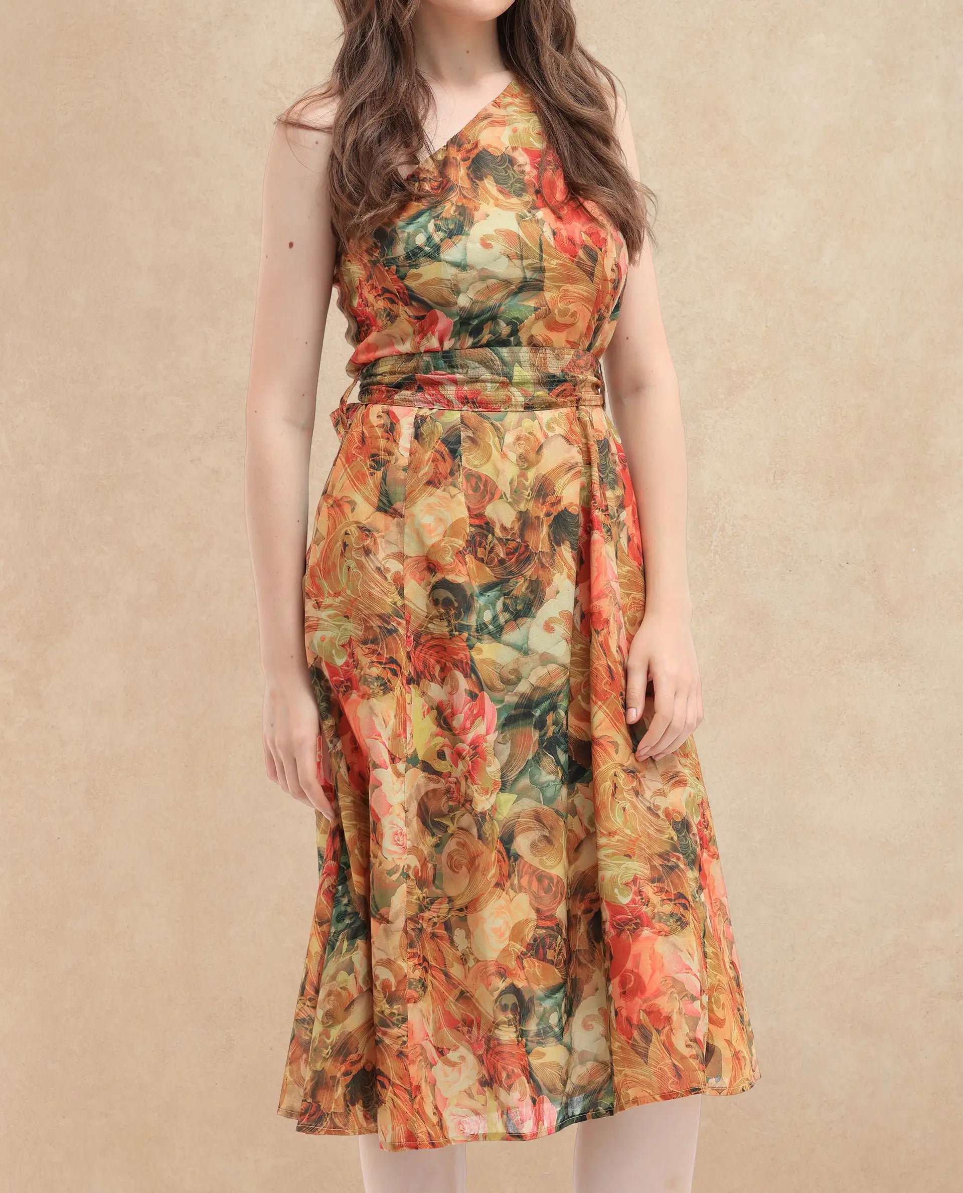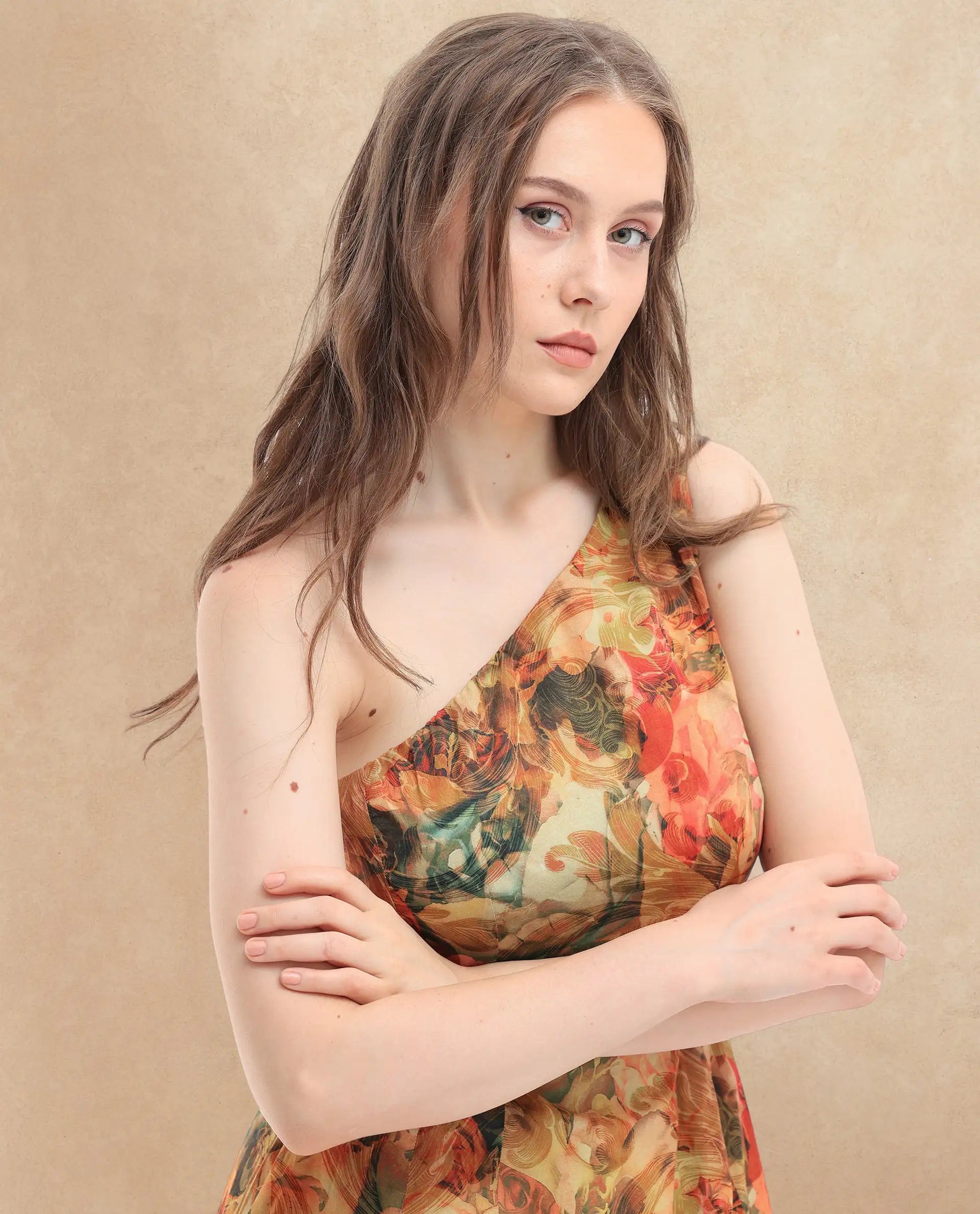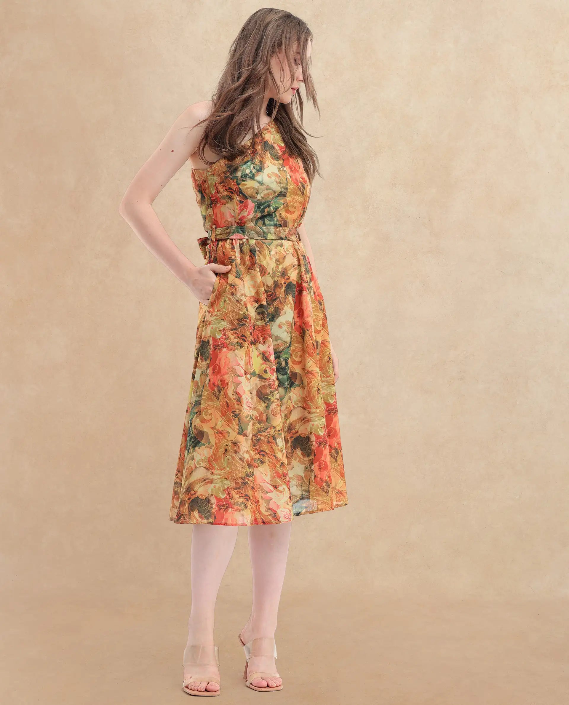 Rareism Women Barney Multi Cotton Fabric Sleeveless Tie-Up Closure One Shoulder One Shoulder Regular Fit Abstract Print Midi Dress