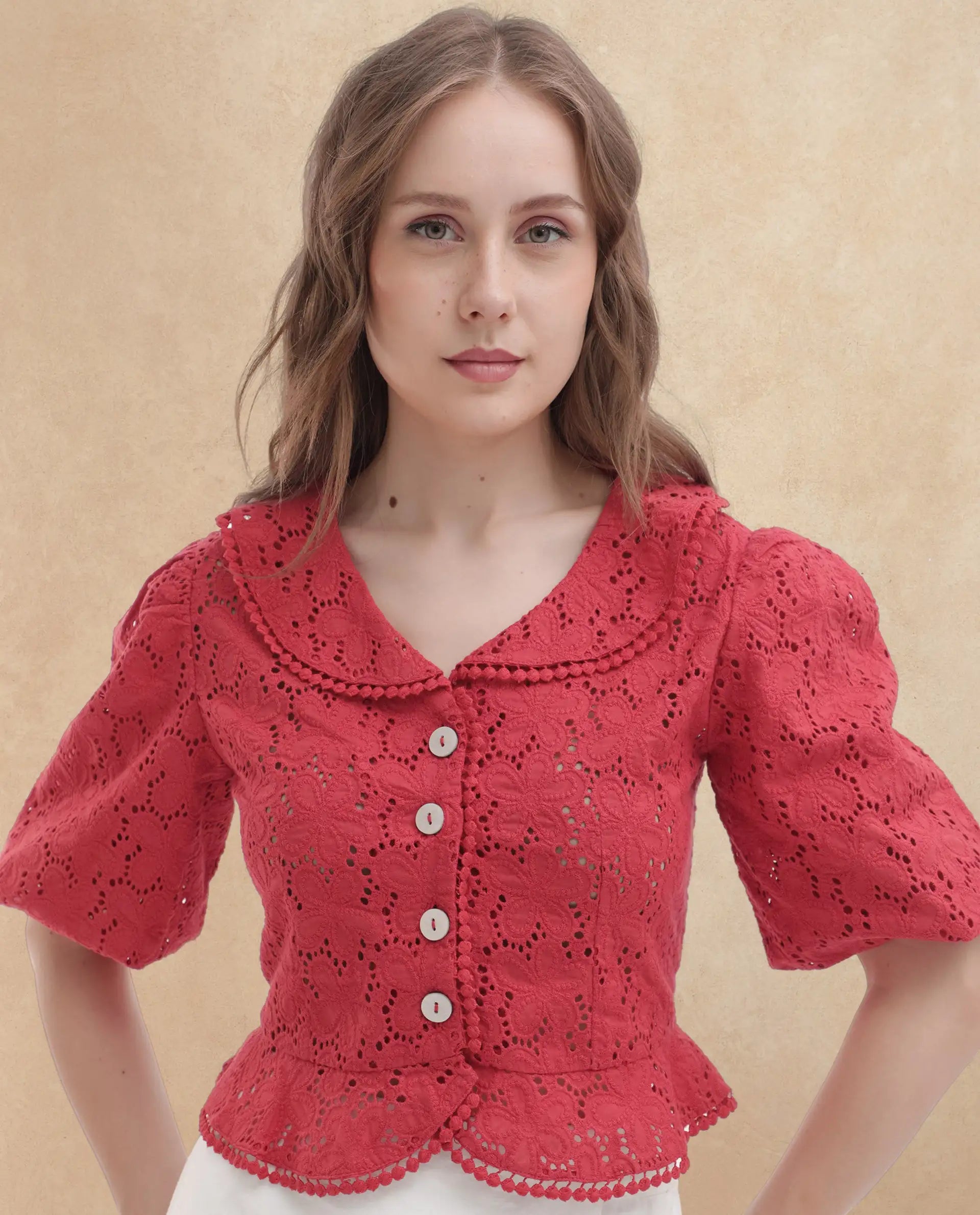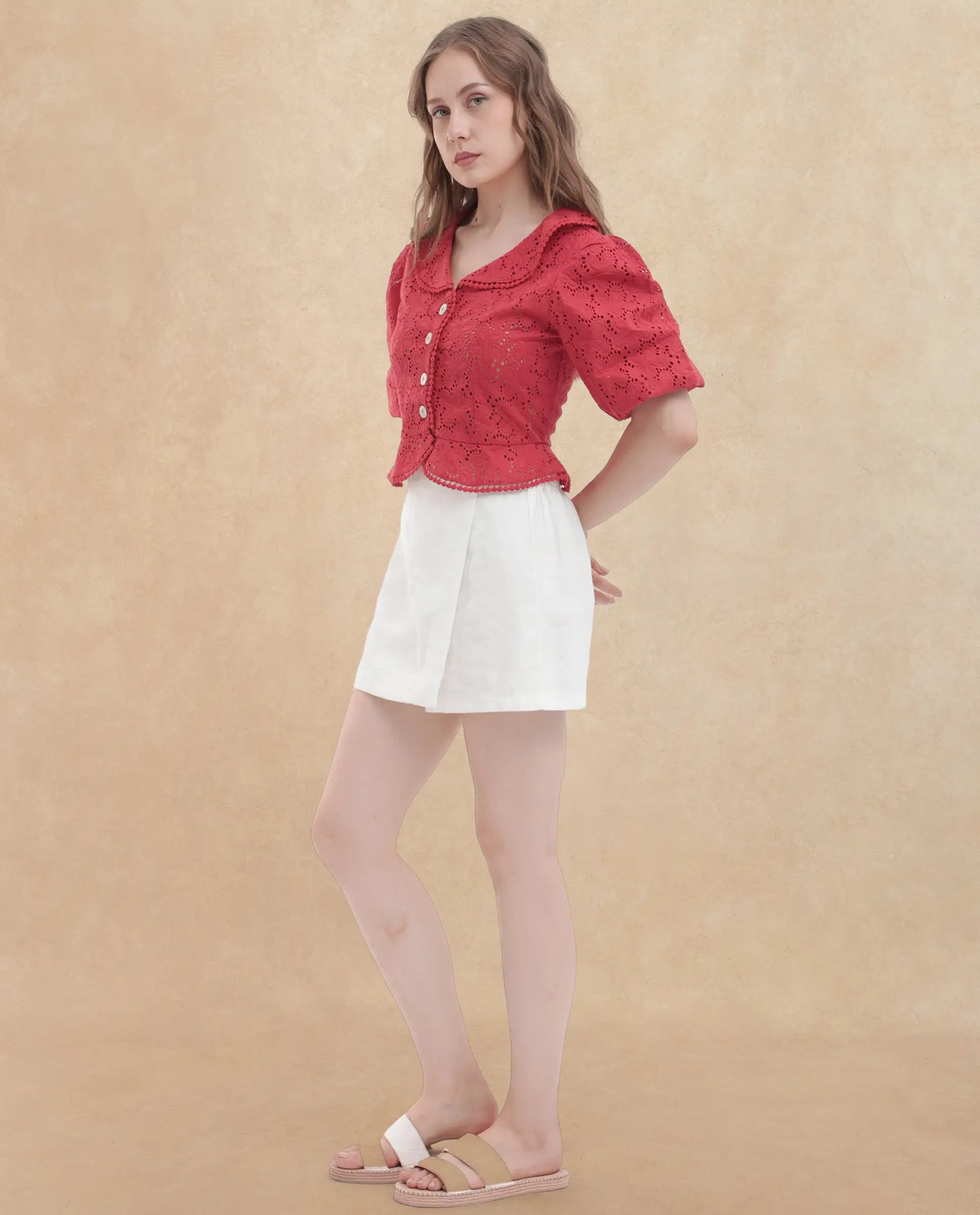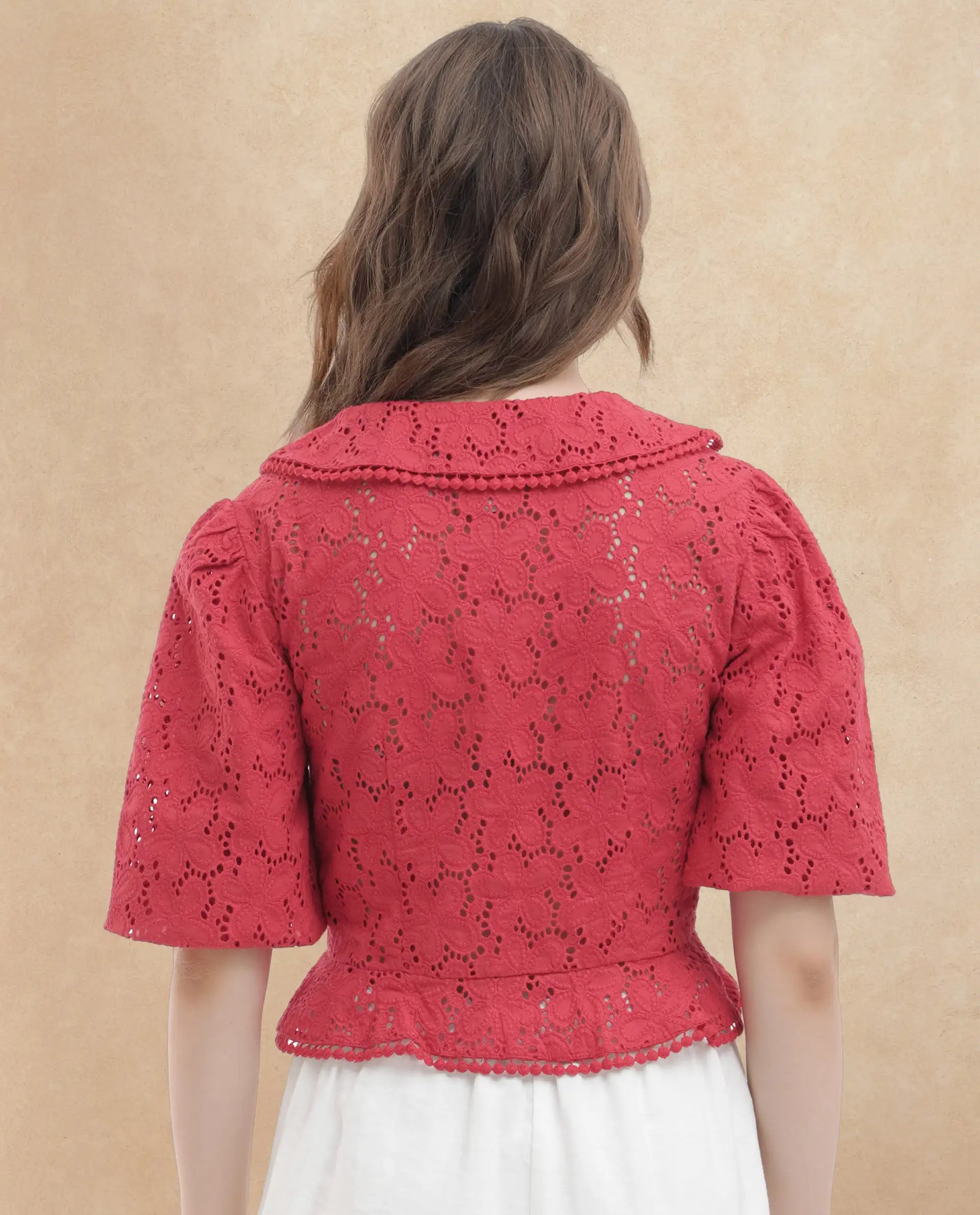 Elevate your style with our Boho Glam Schiffli Crop Button-Down Top. This trendy piece features whimsical balloon sleeves, intricate collar detail, and a fashionable bottom panel, all in delicate schiffli fabric for a touch of romance.