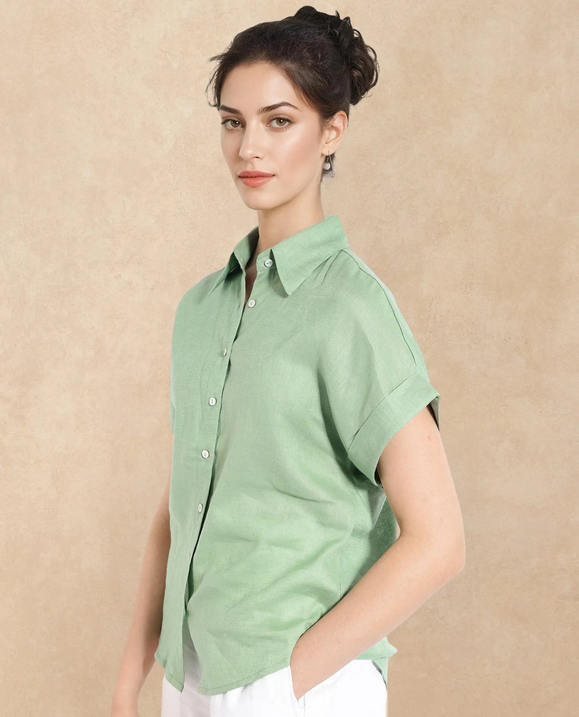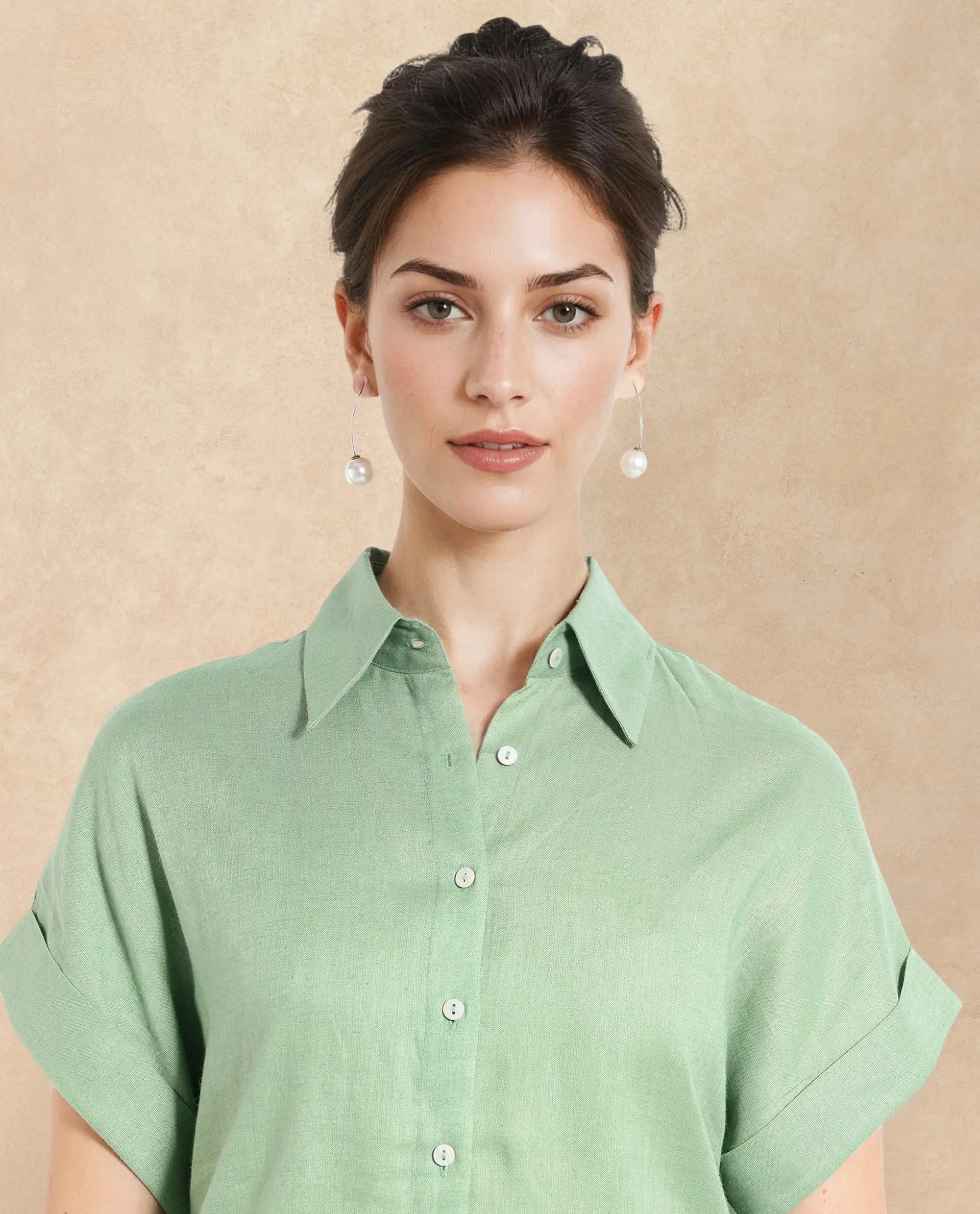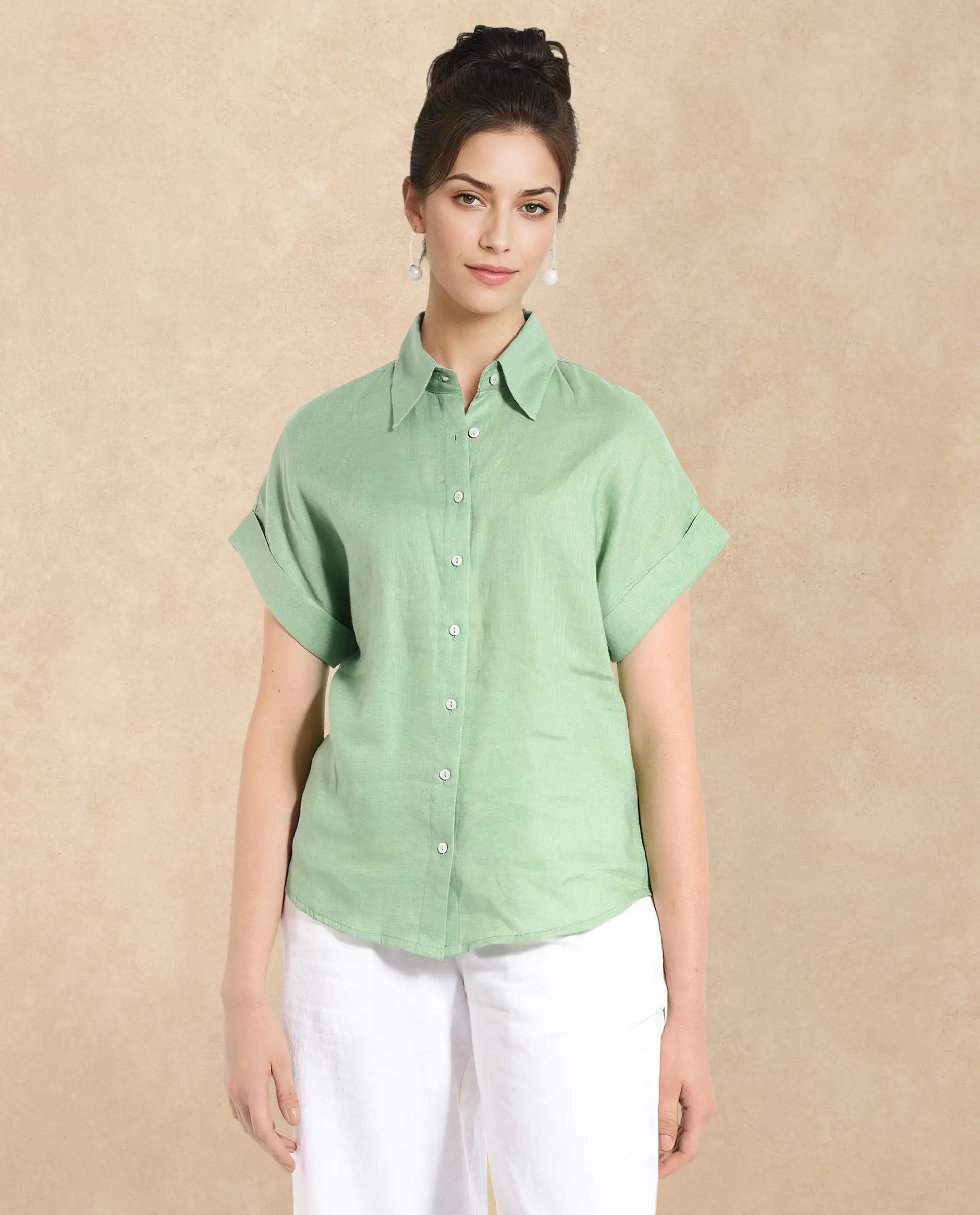 Rareism Women Venezuela Pastel Green Cotton Linen Fabric Collared Neck Solid Boxy Fit Shirt