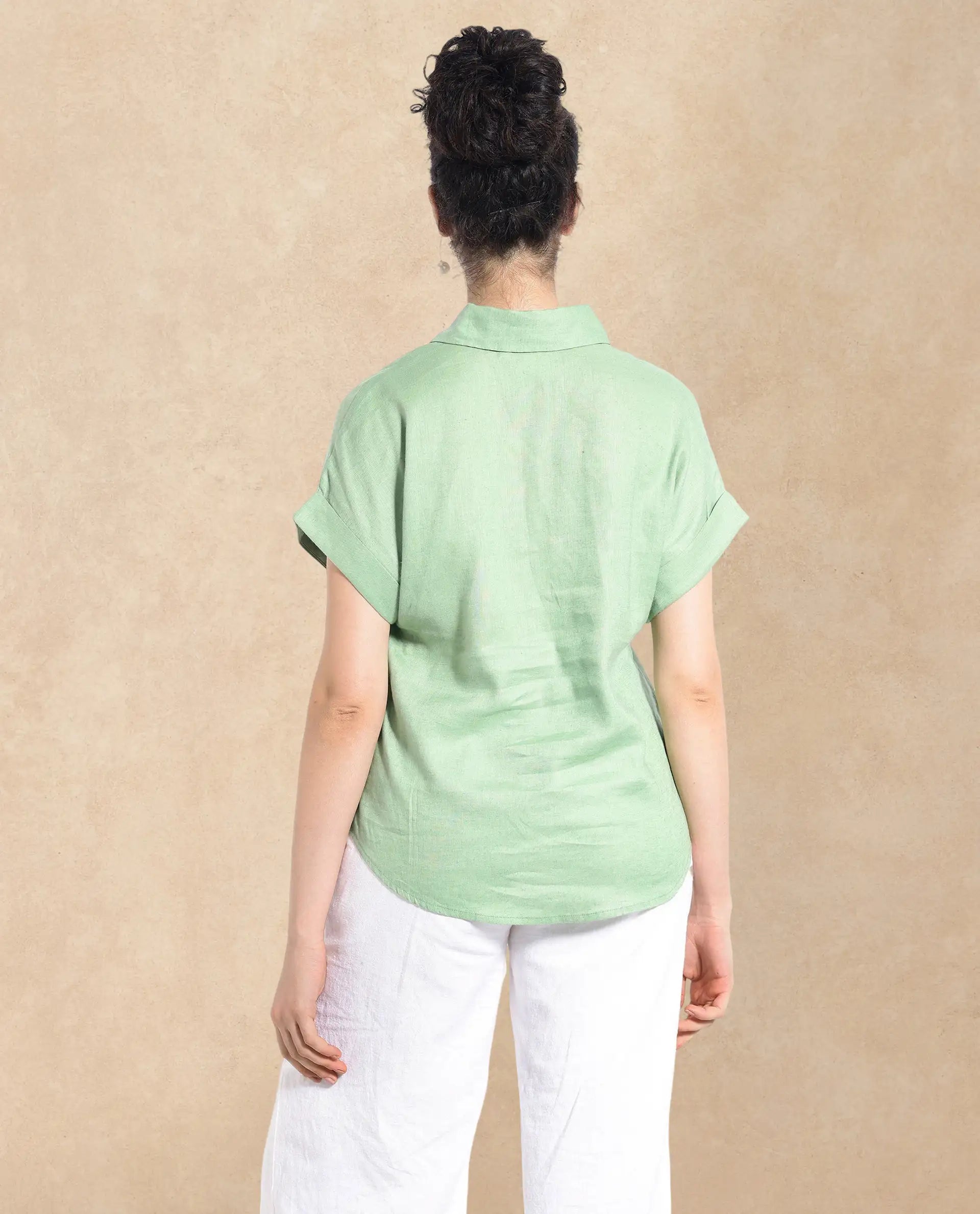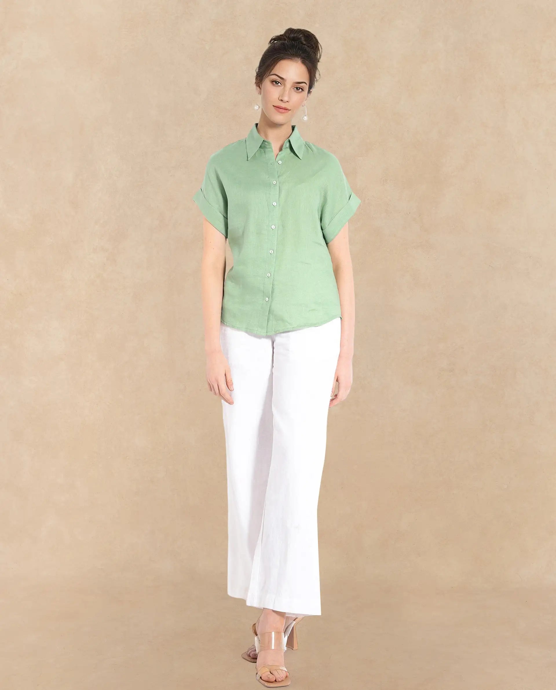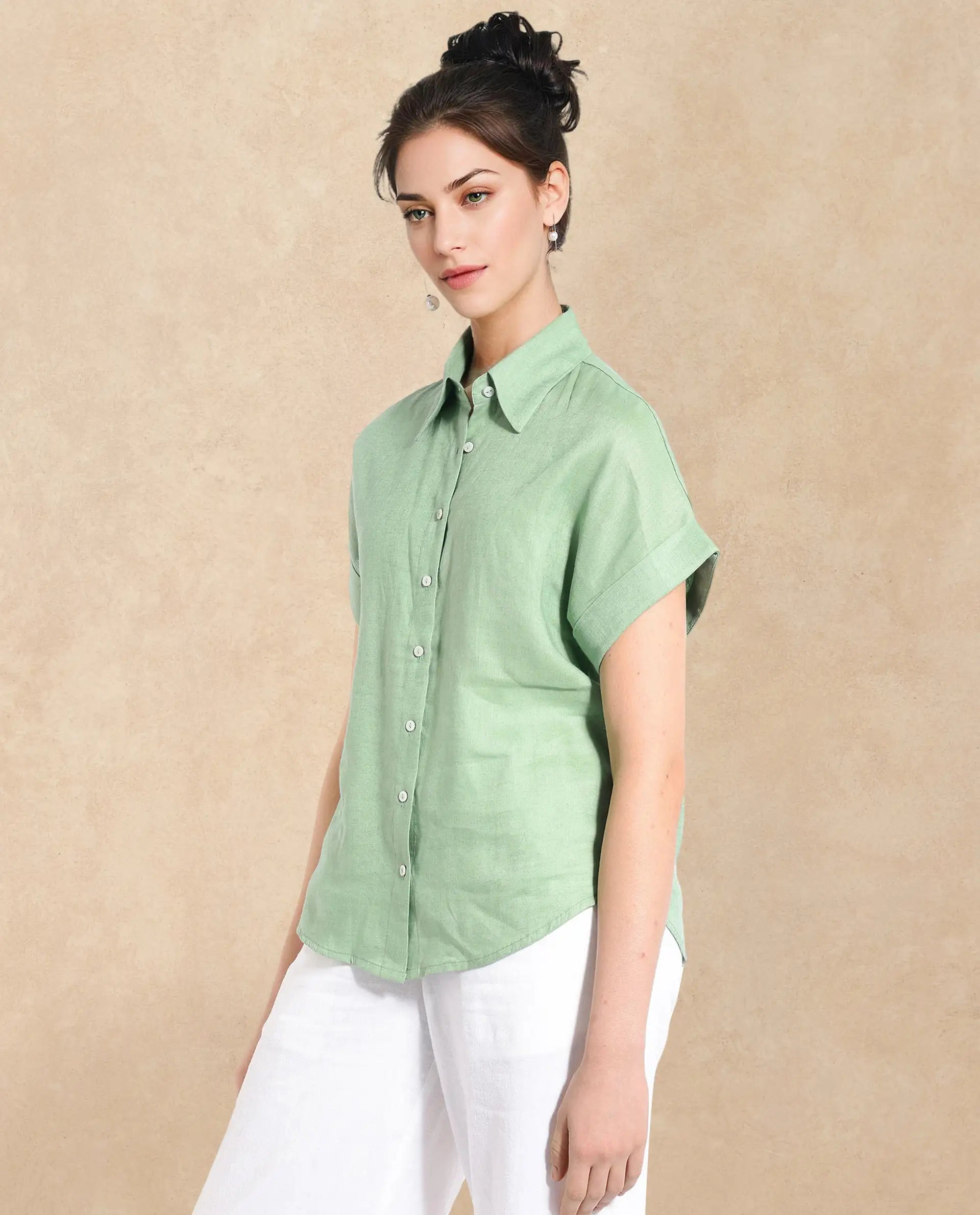 Rareism Women Venezuela Pastel Green Cotton Linen Fabric Collared Neck Solid Boxy Fit Shirt