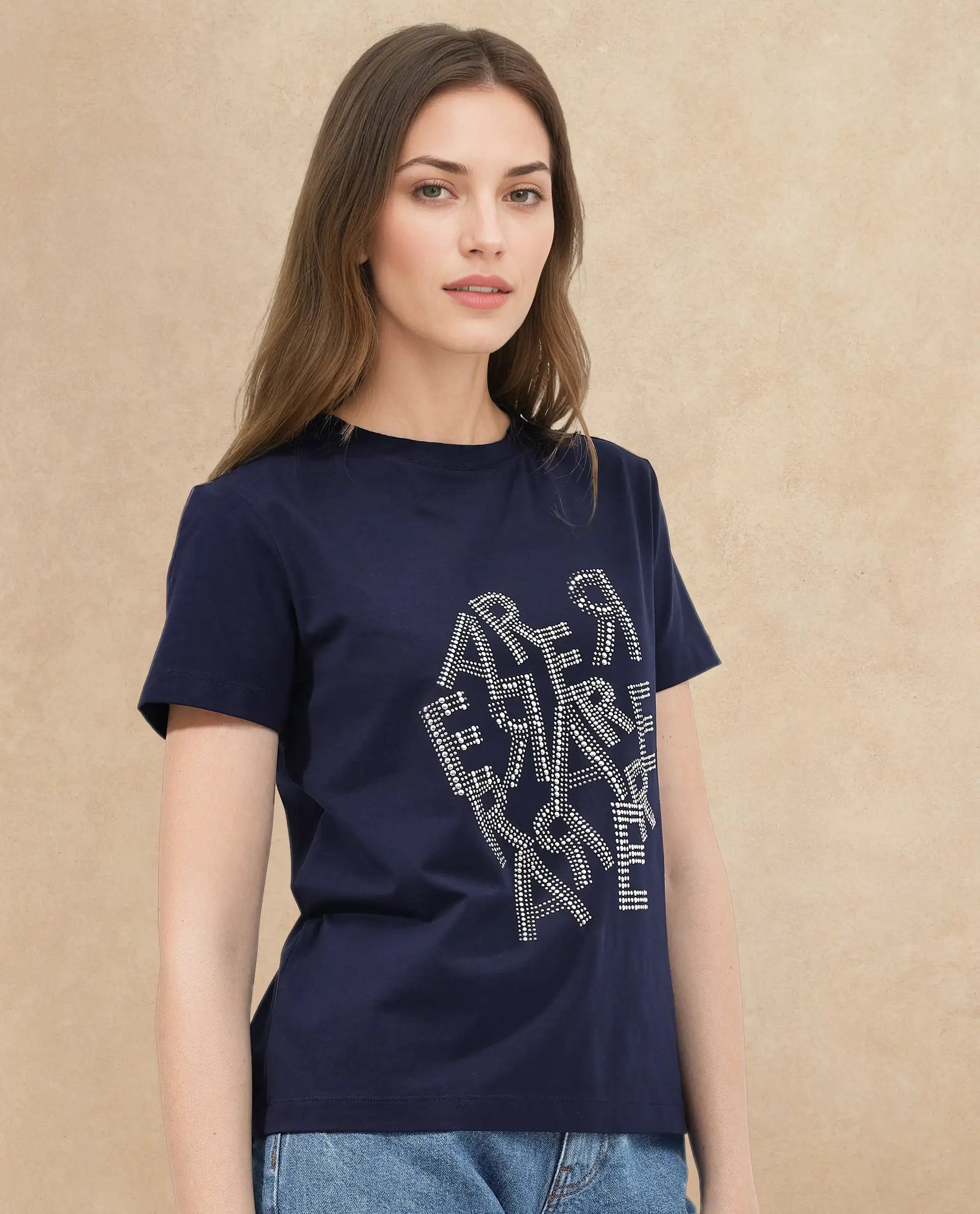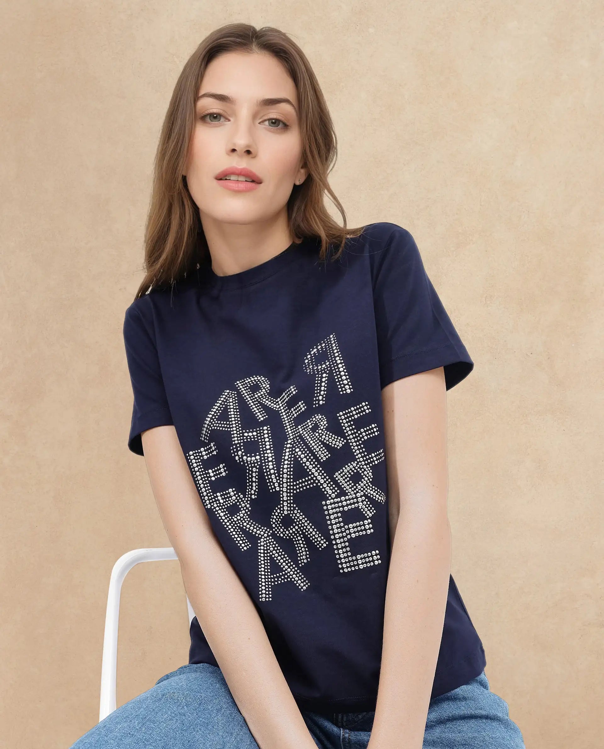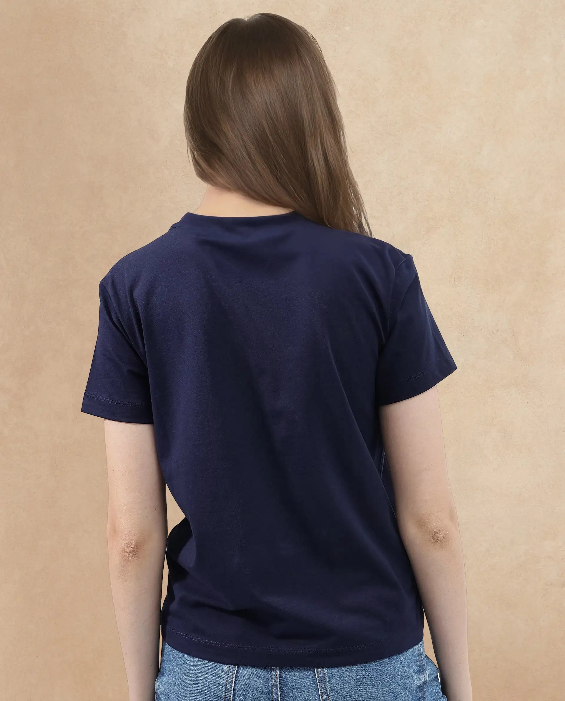 Rareism Women Flank Dark Navy Cotton Elastane Fabric Crew Neck Knit Solid T-Shirt