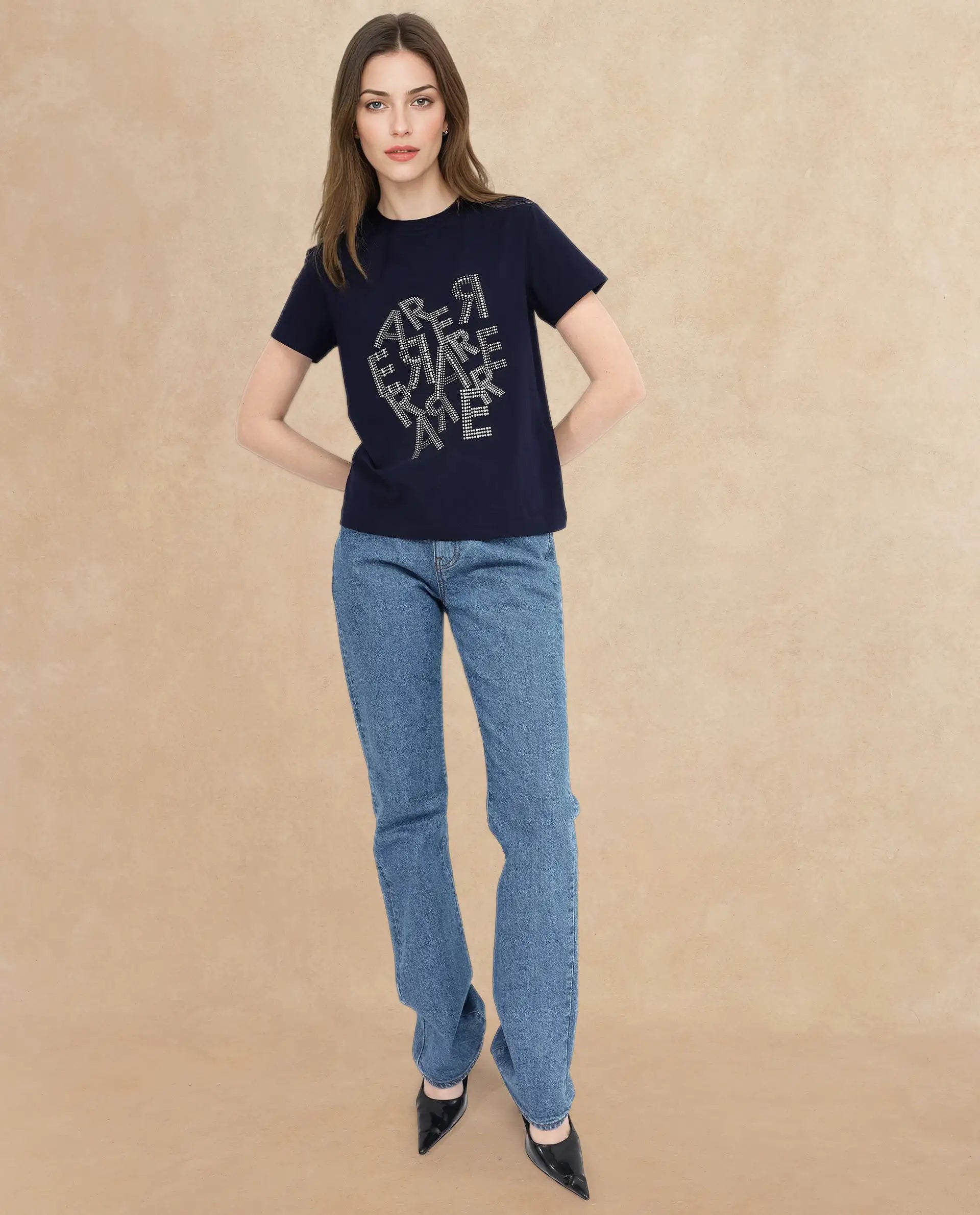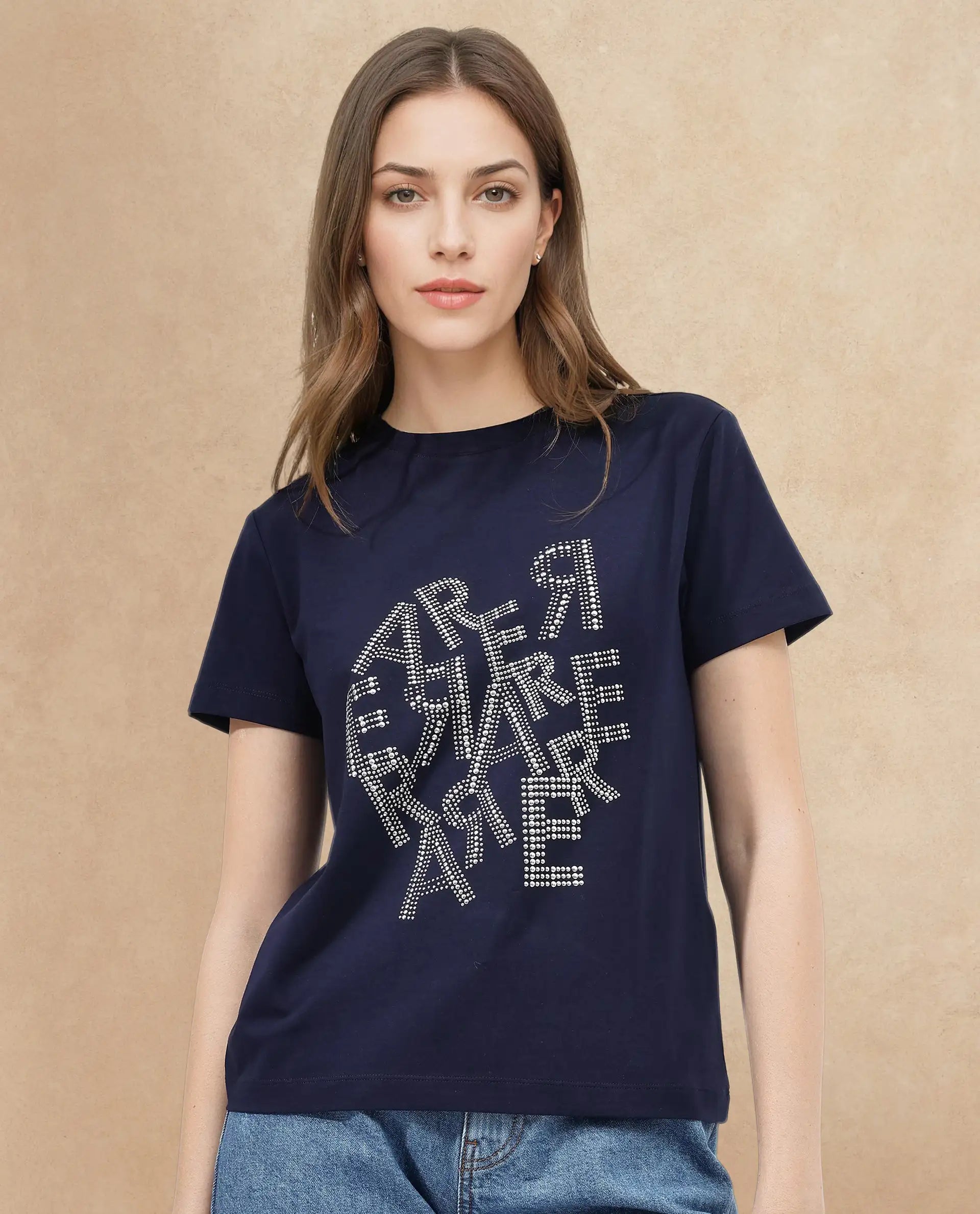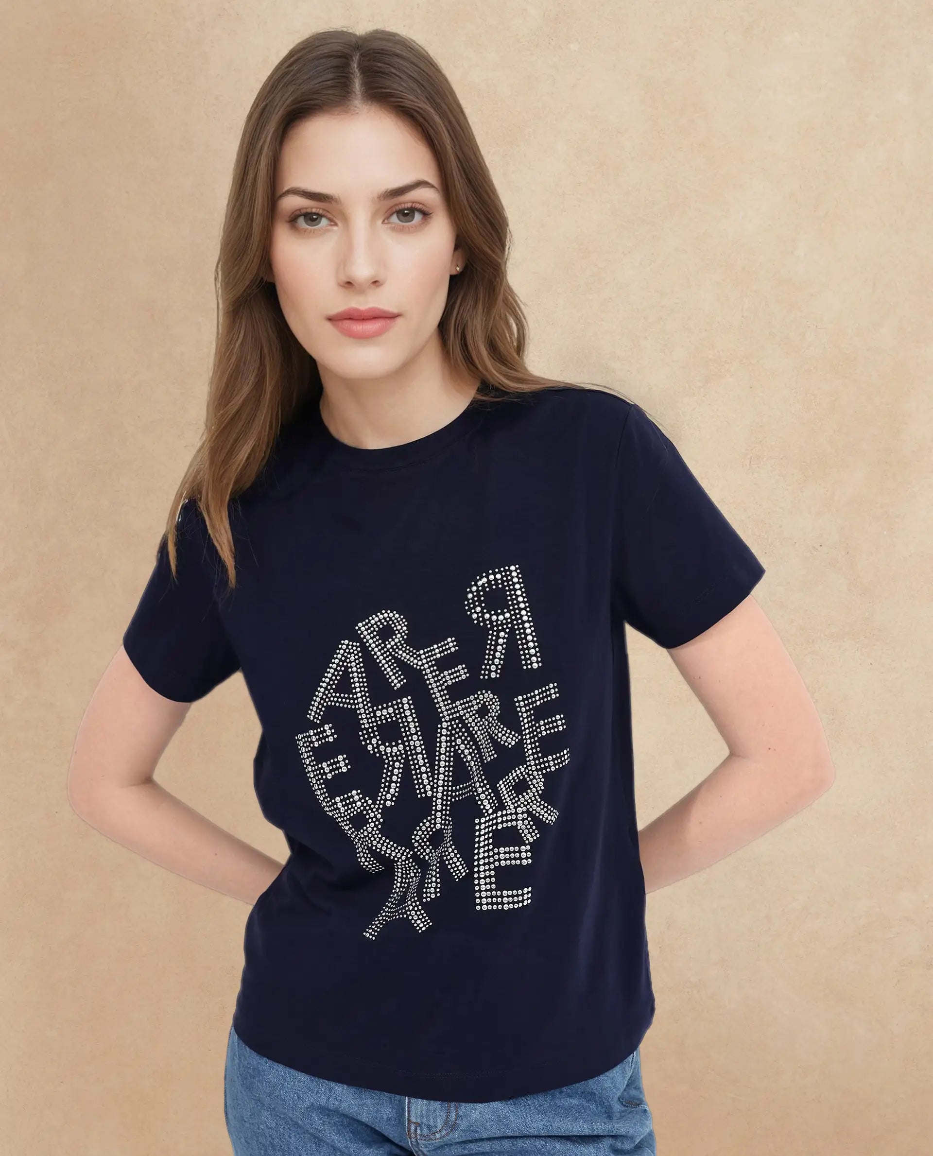 Rareism Women Flank Dark Navy Cotton Elastane Fabric Crew Neck Knit Solid T-Shirt
