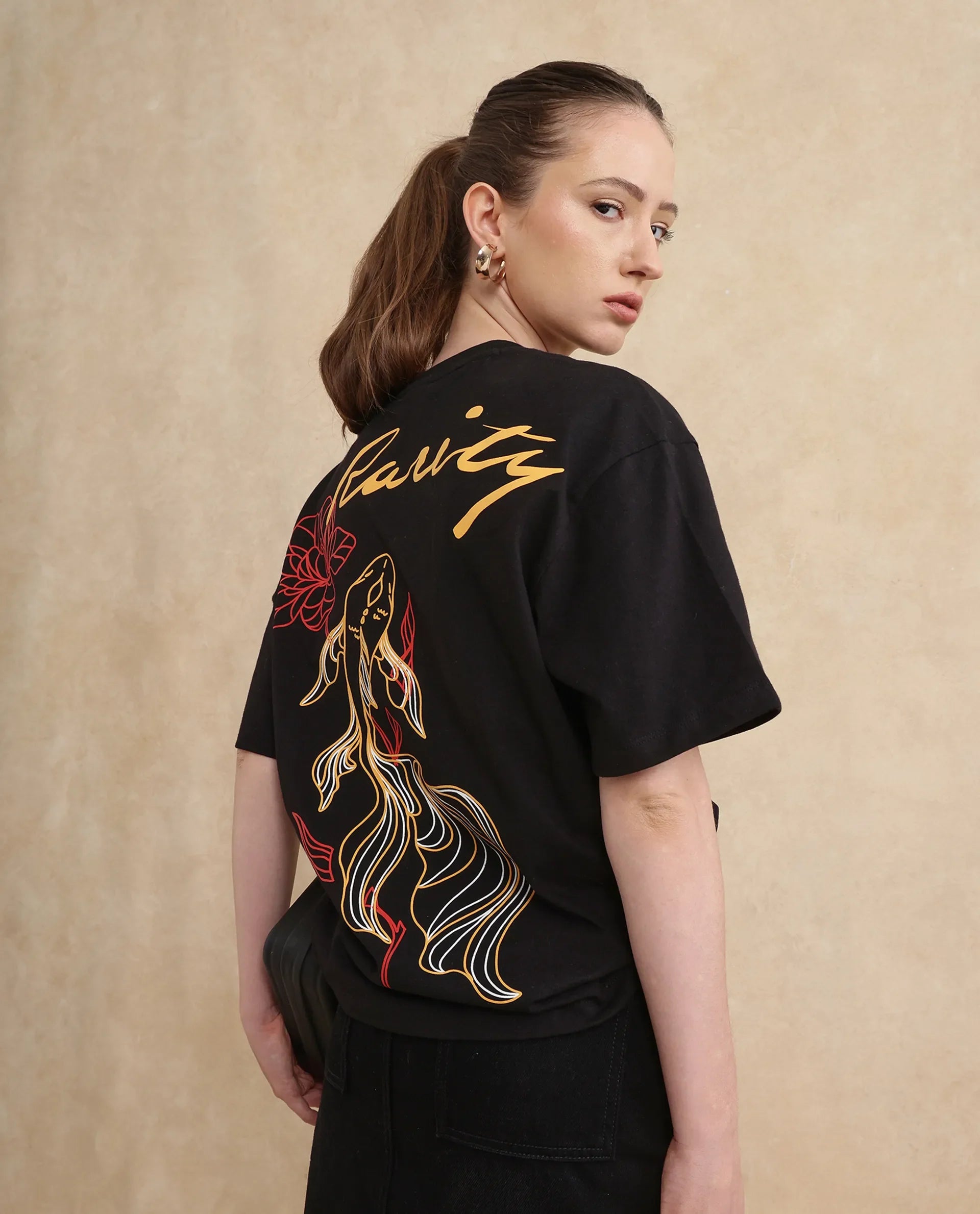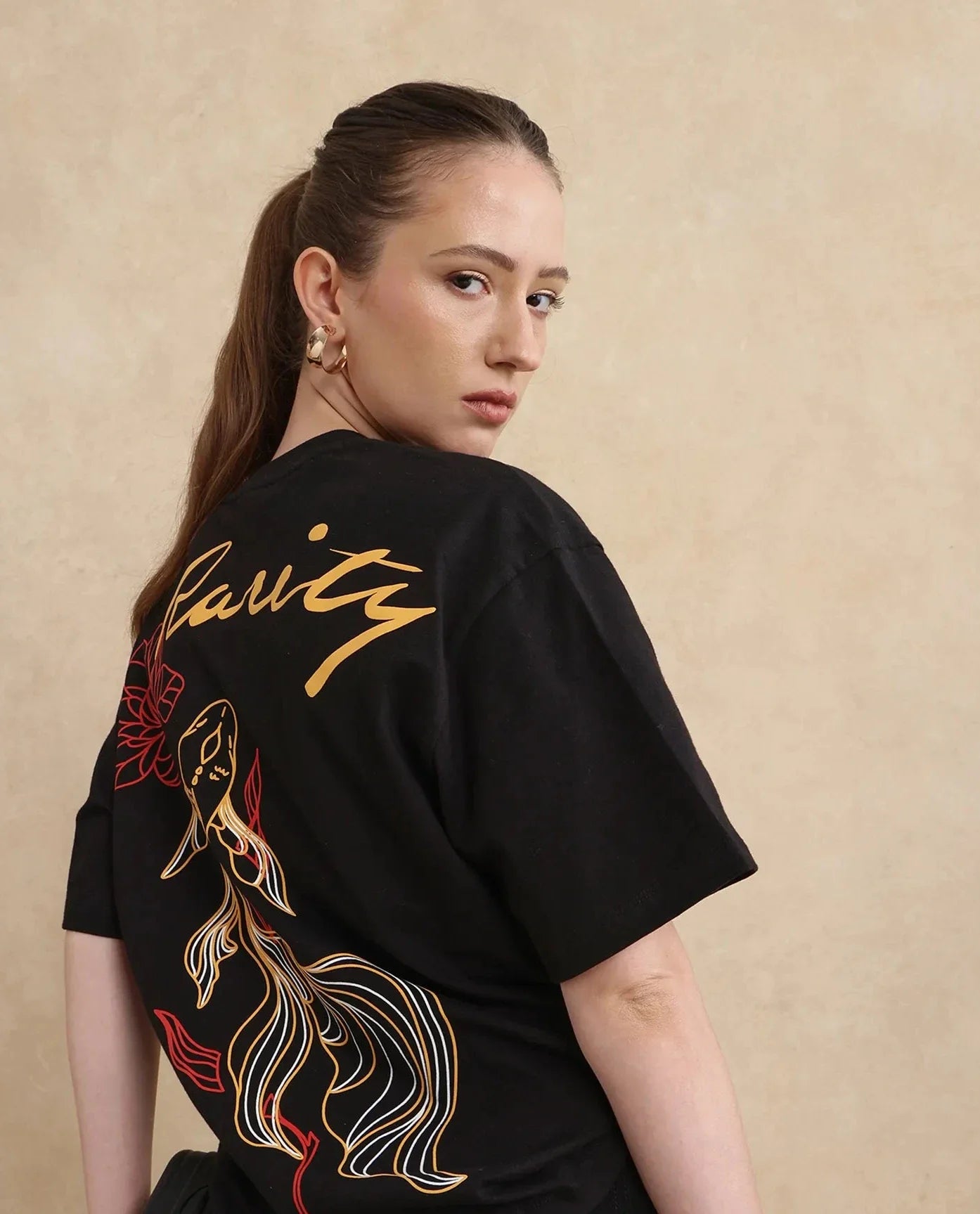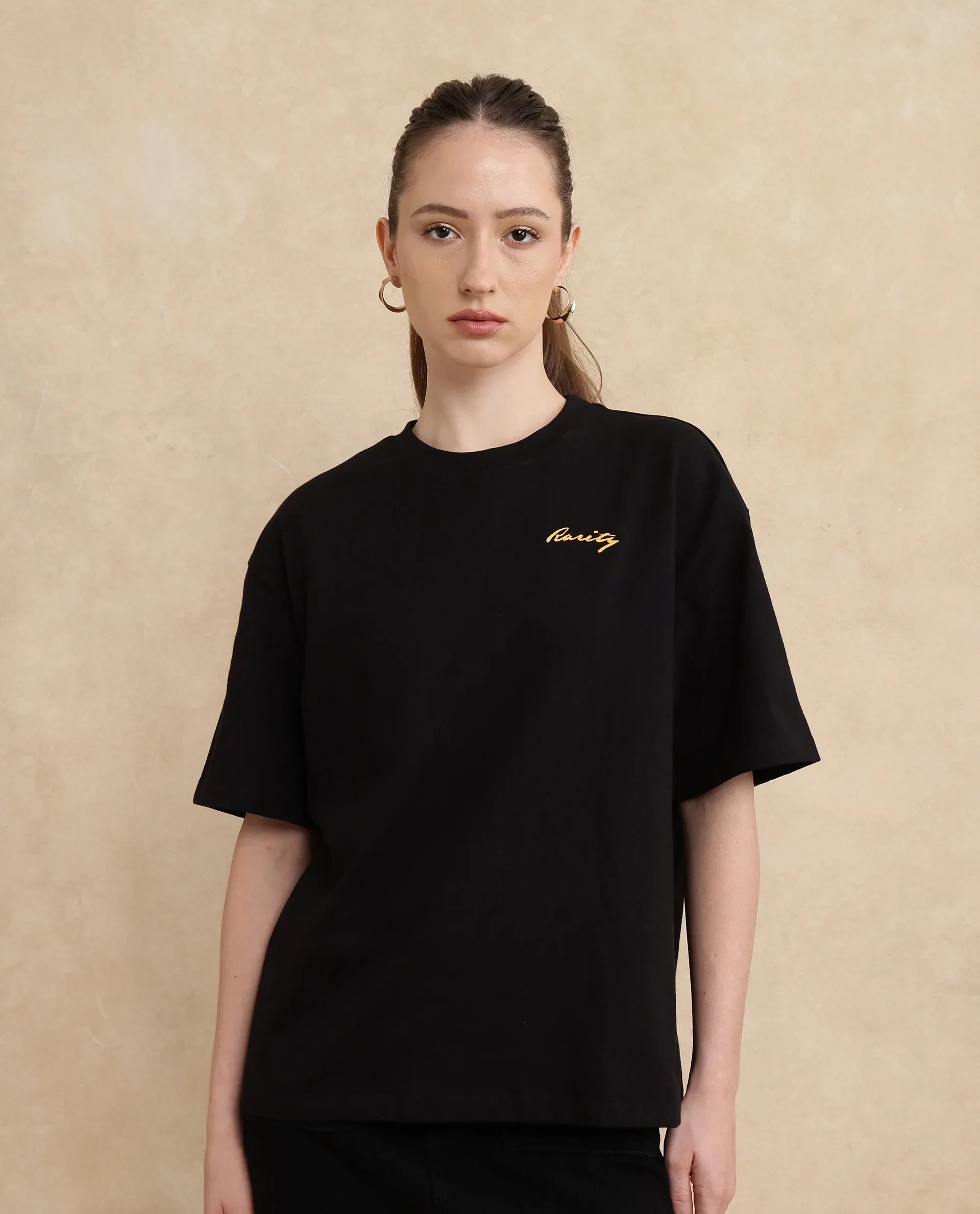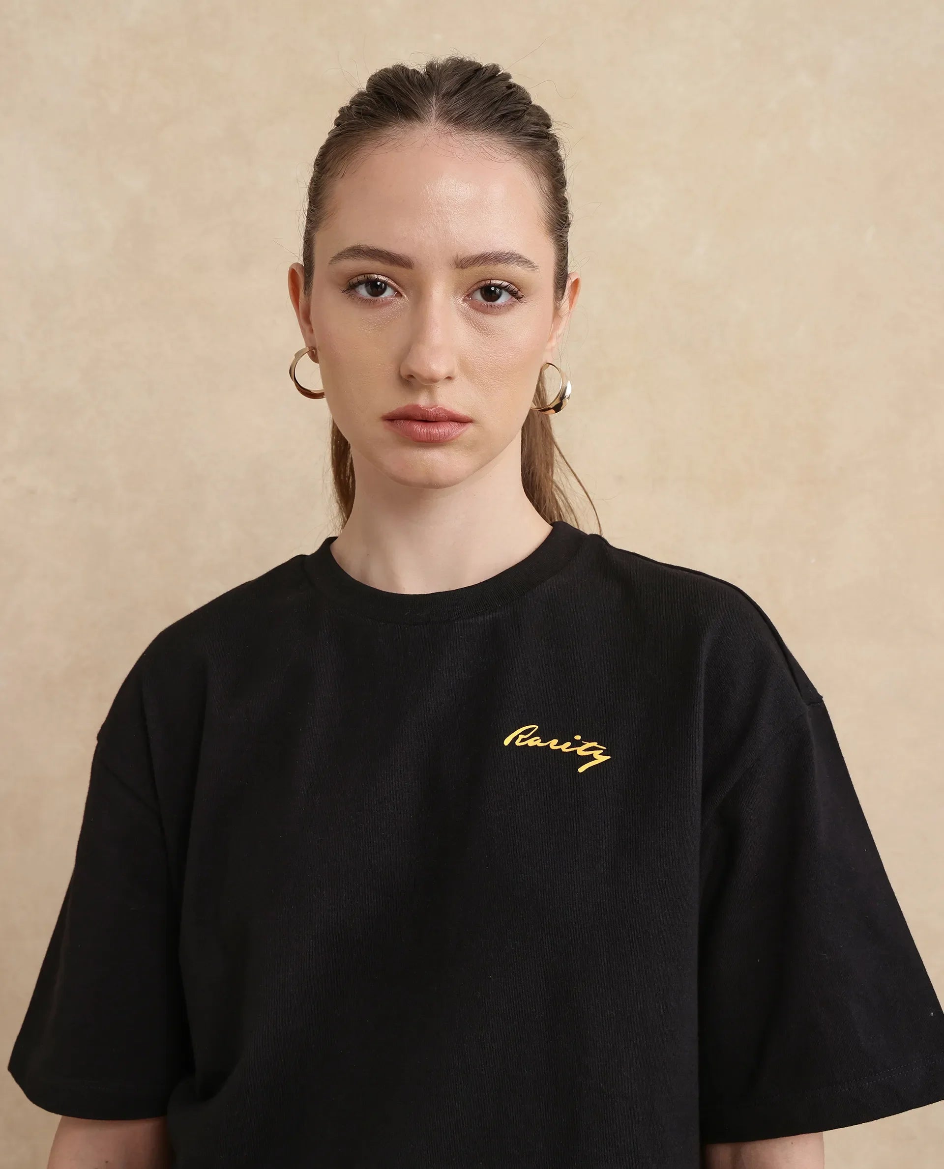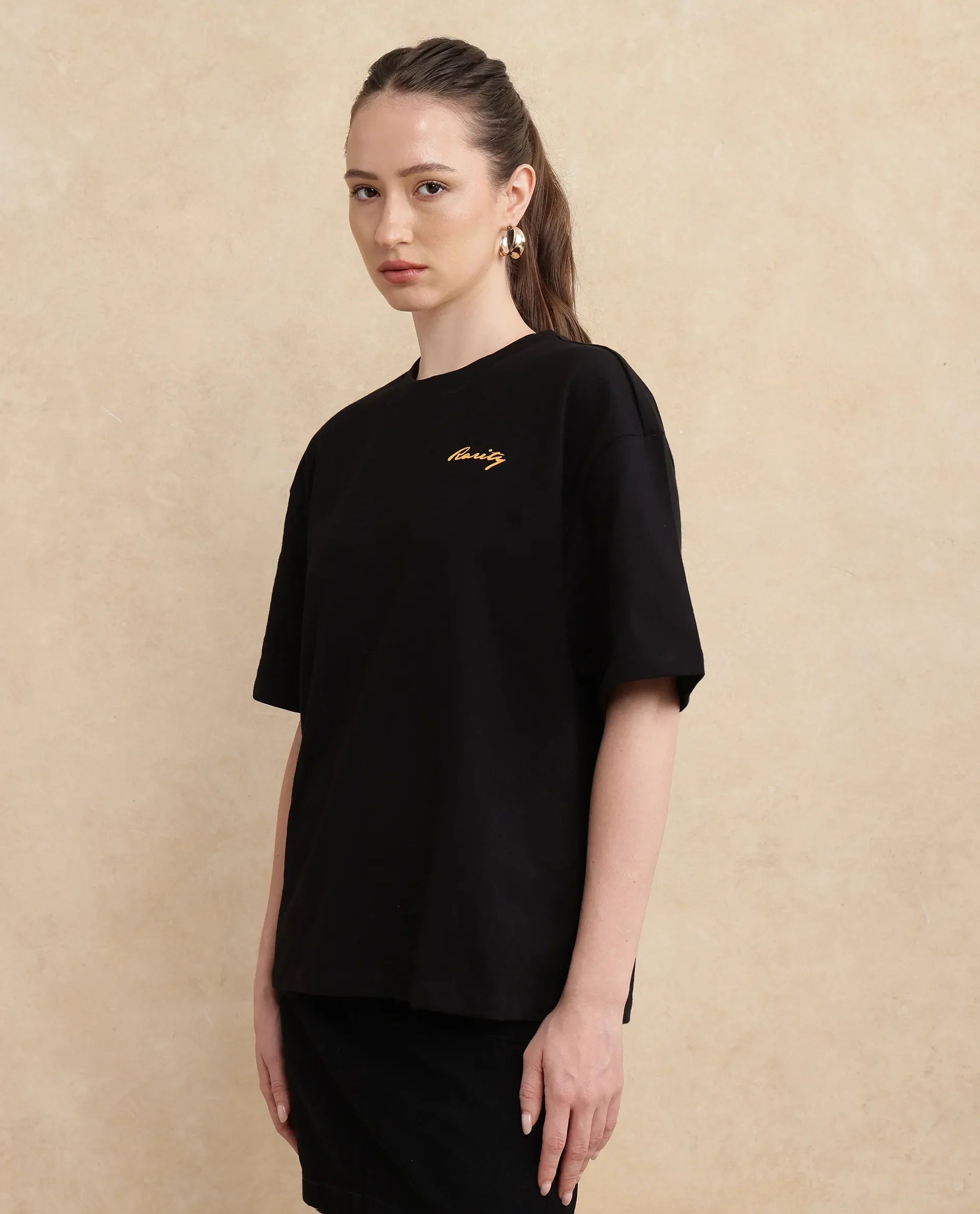 Rareism Women Flex Black Cotton Lycra Fabric Short Sleeve Crew Neck Slip-On Oversized Fit Graphic Print T-Shirt
