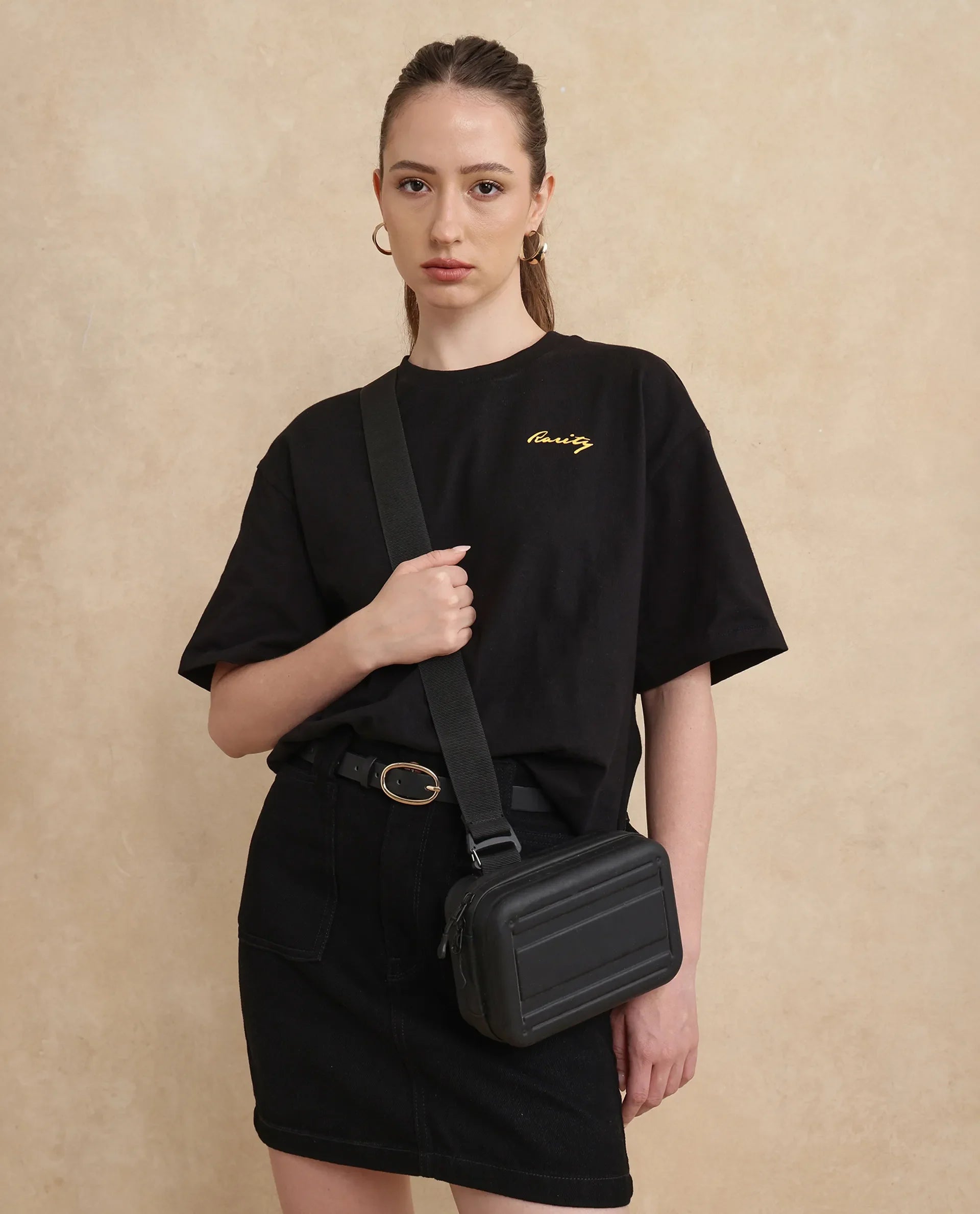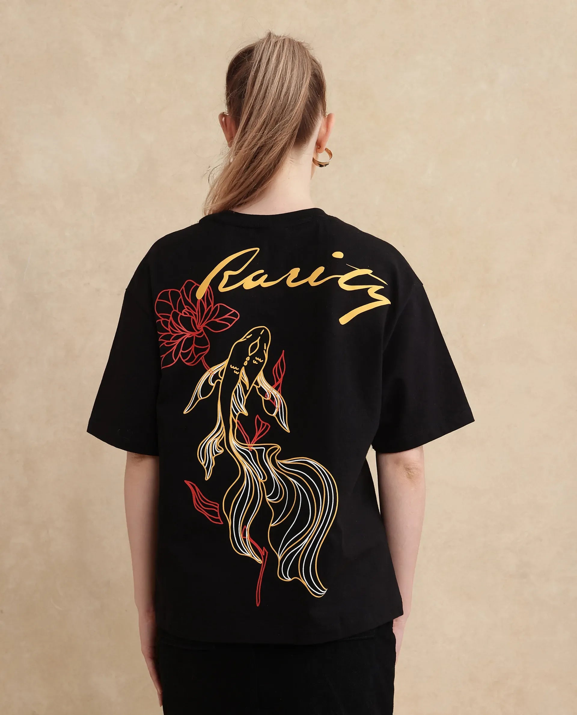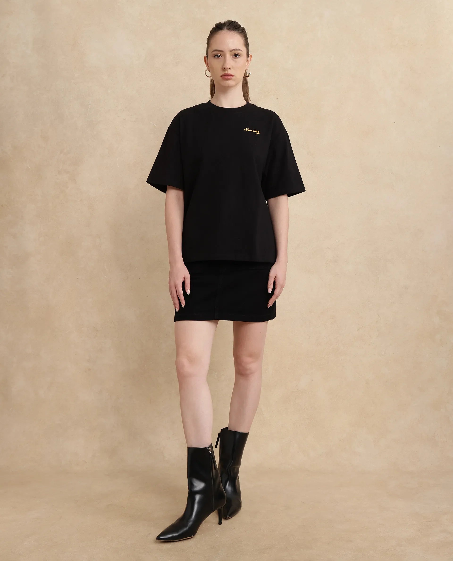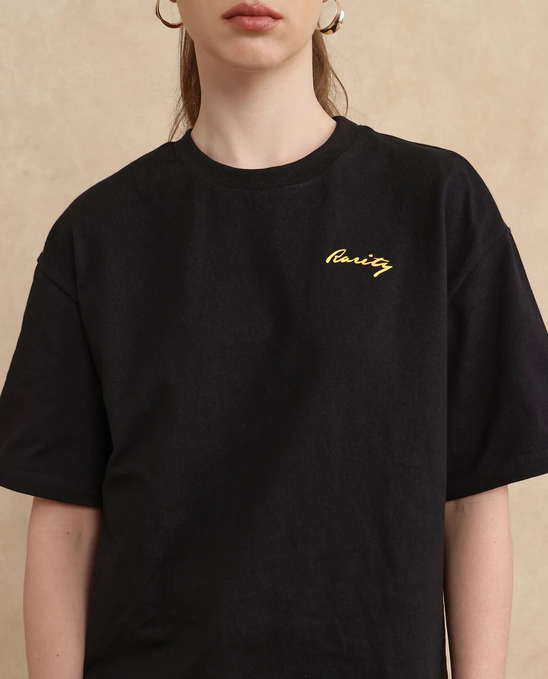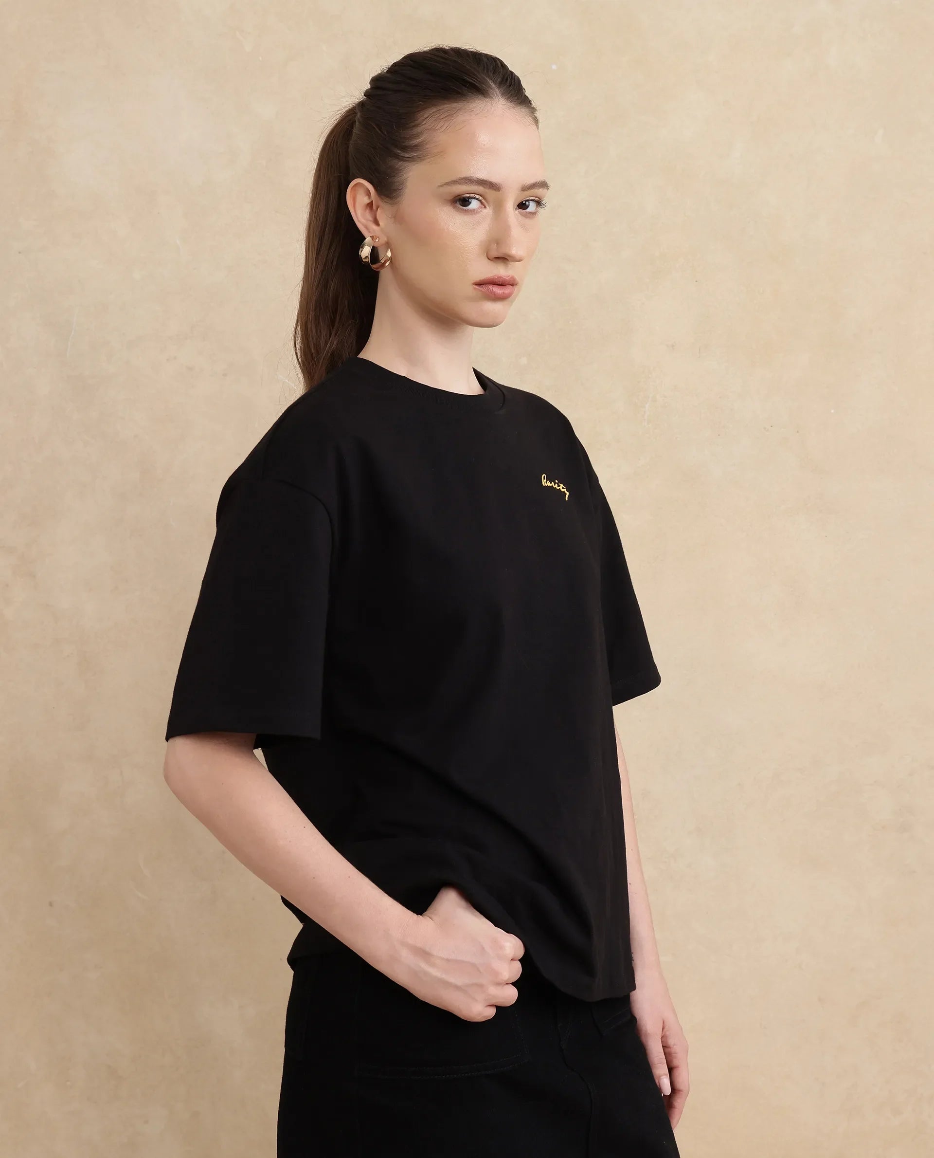 Rareism Women Flex Black Cotton Lycra Fabric Short Sleeve Crew Neck Slip-On Oversized Fit Graphic Print T-Shirt