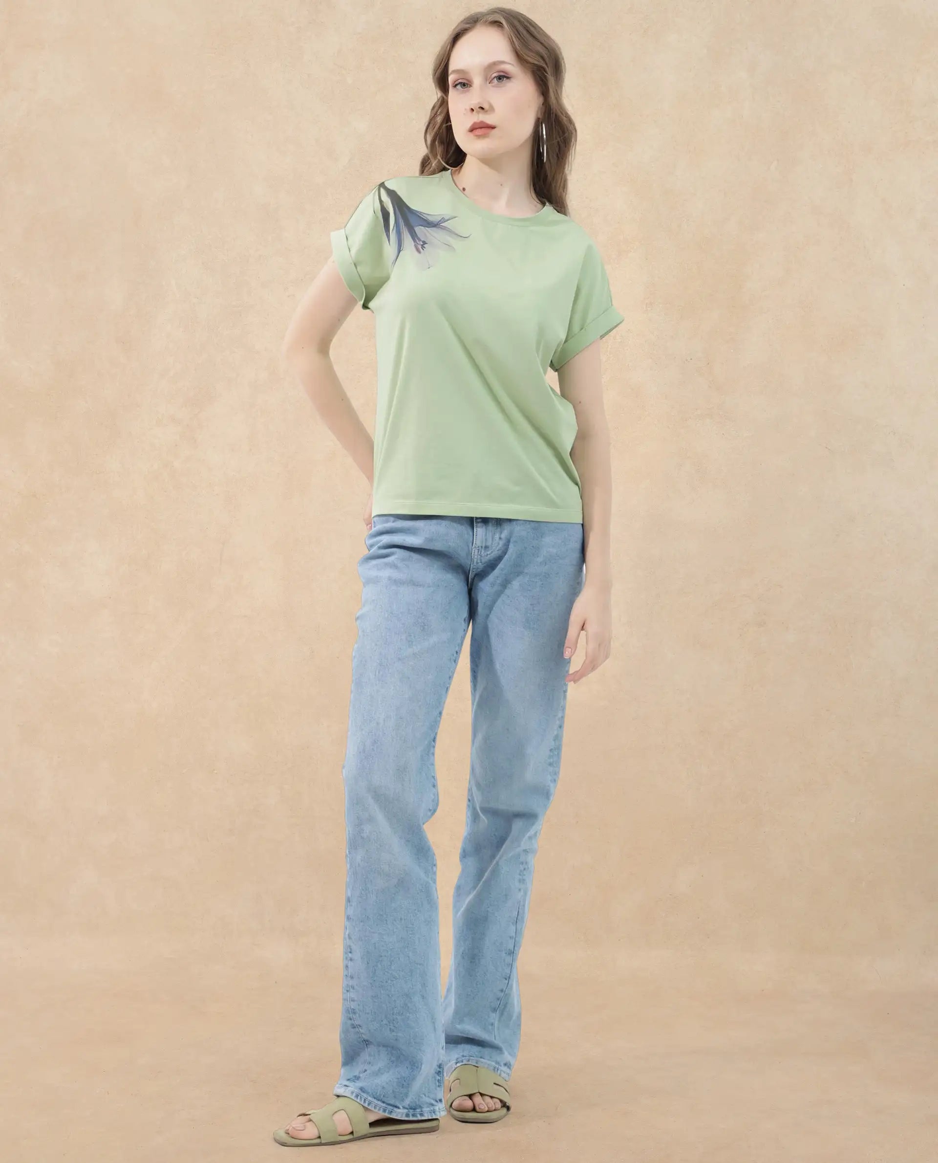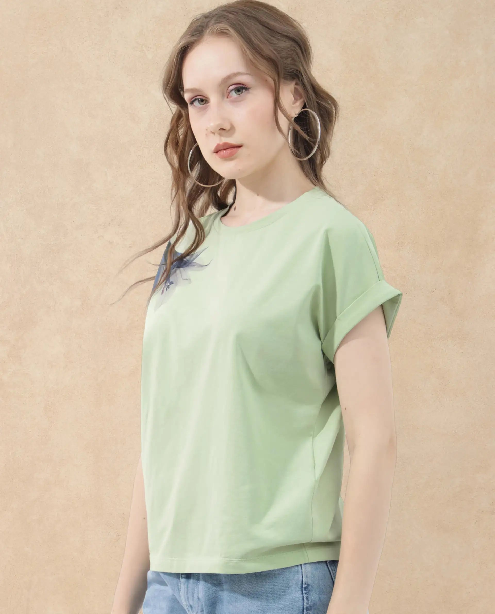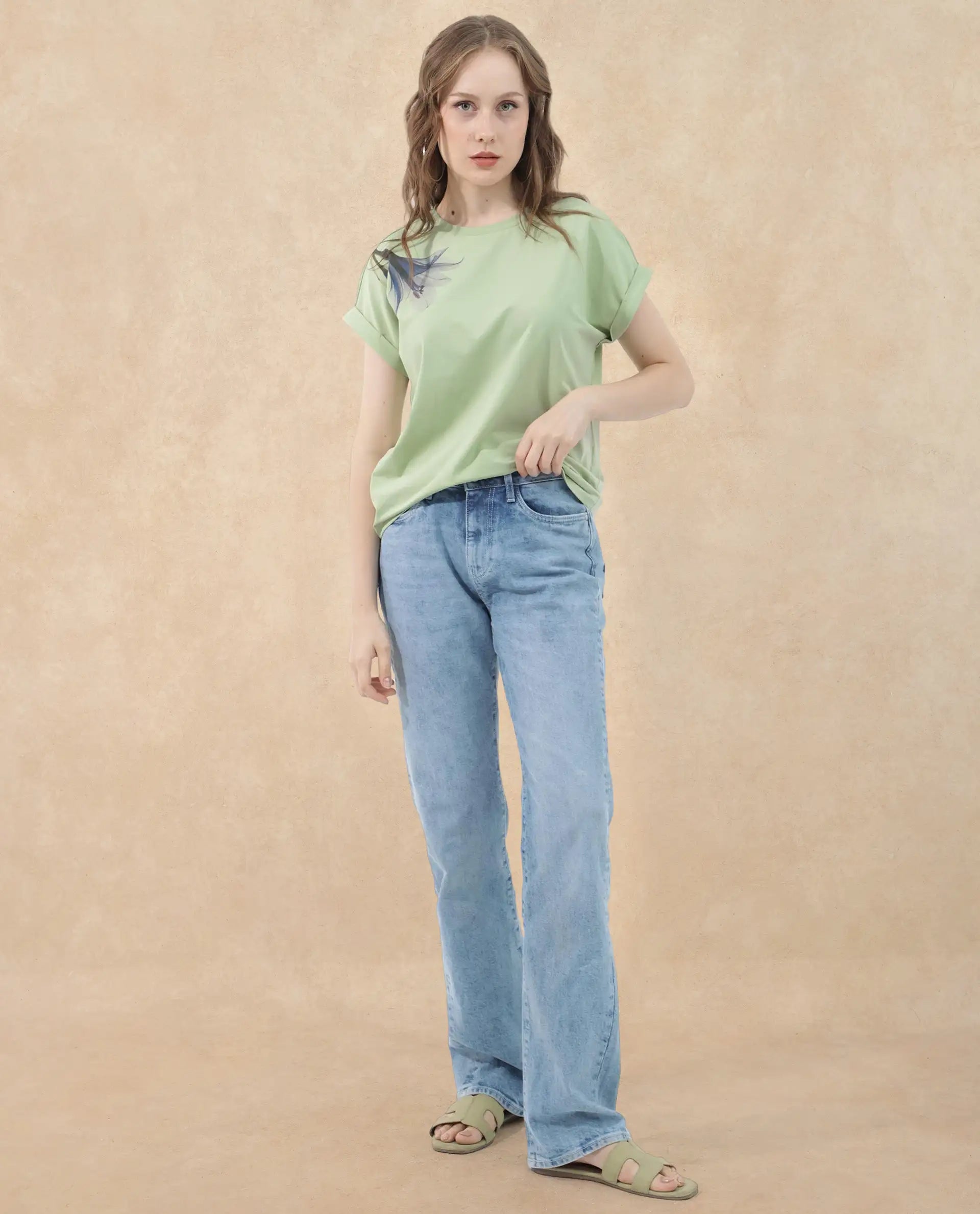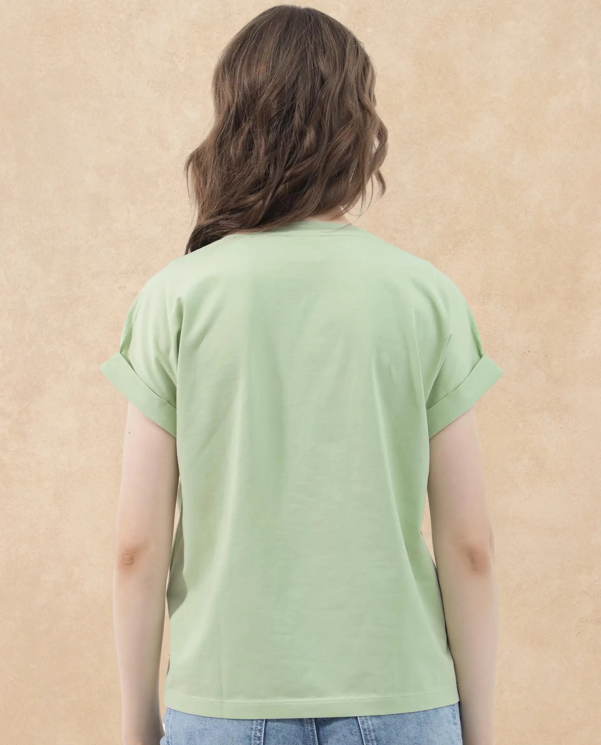 Rareism Women Mattadu Pastel Green Cotton Elastane Fabric Crew Neck Knit Solid T-Shirt