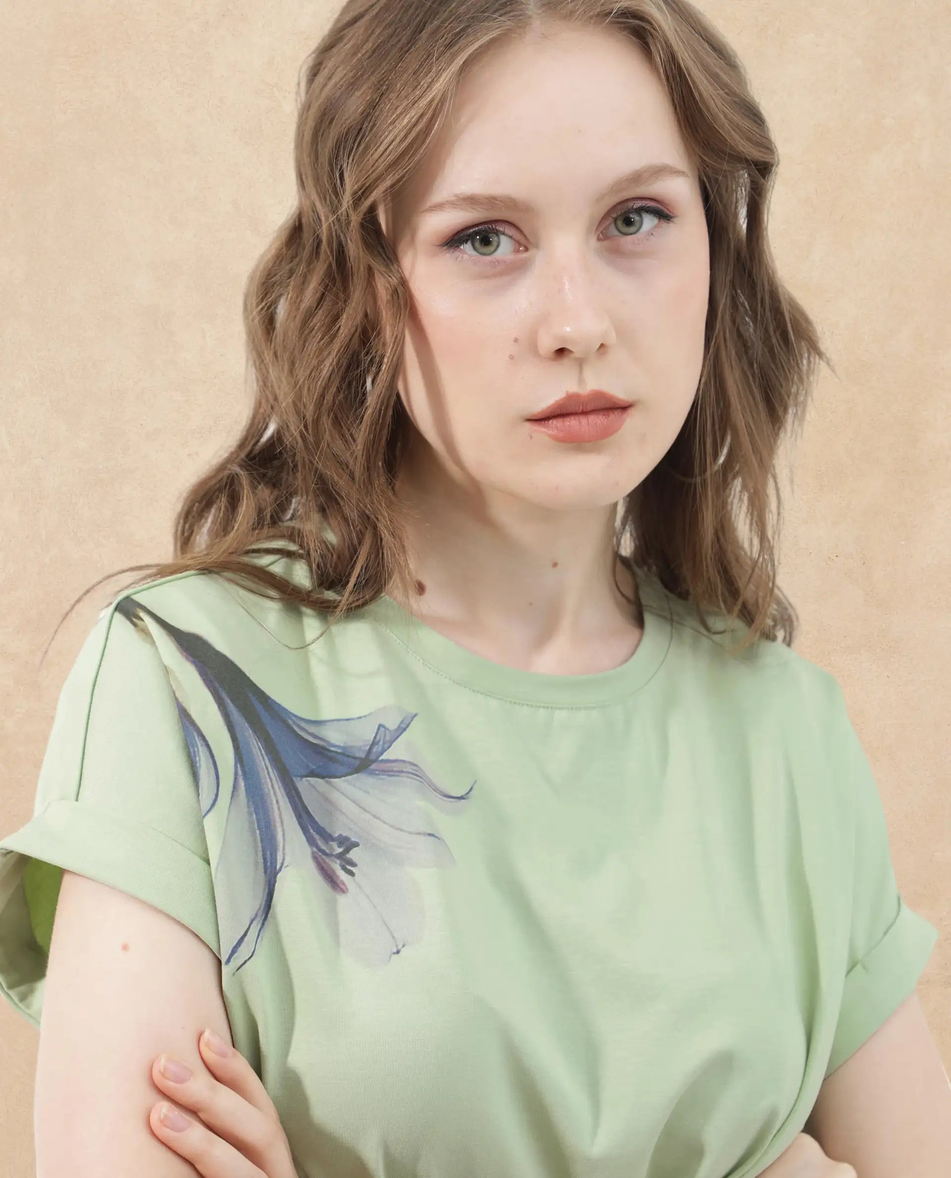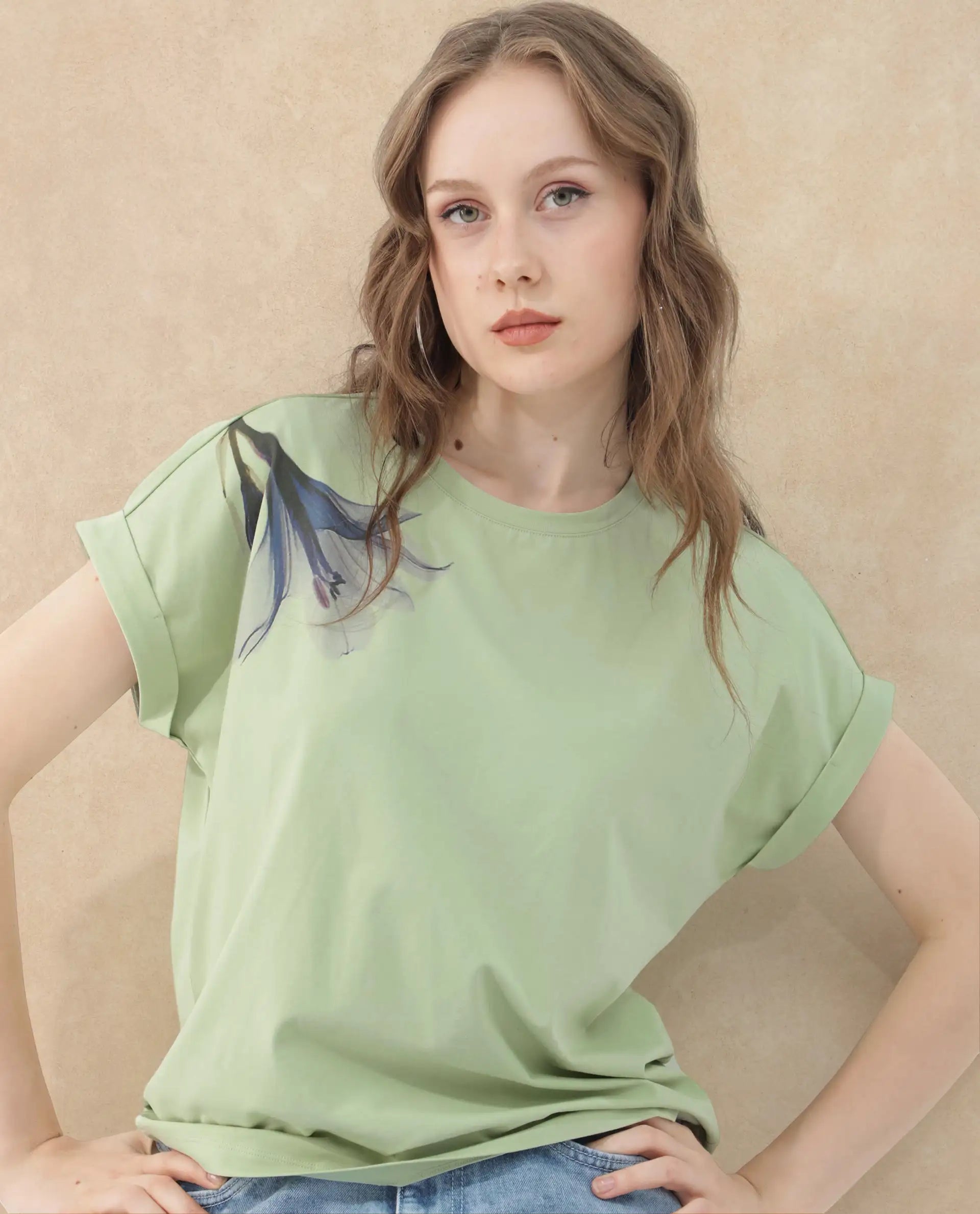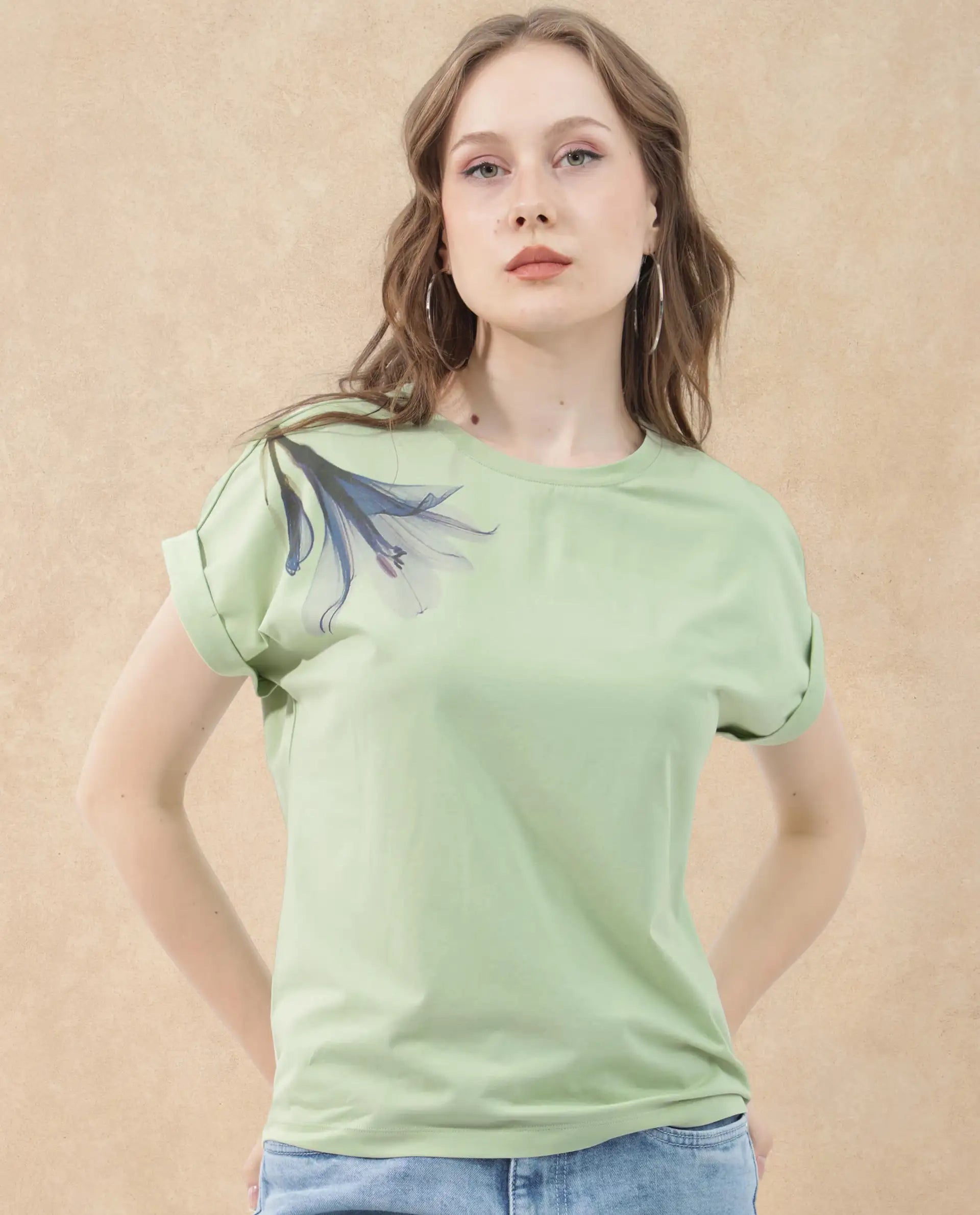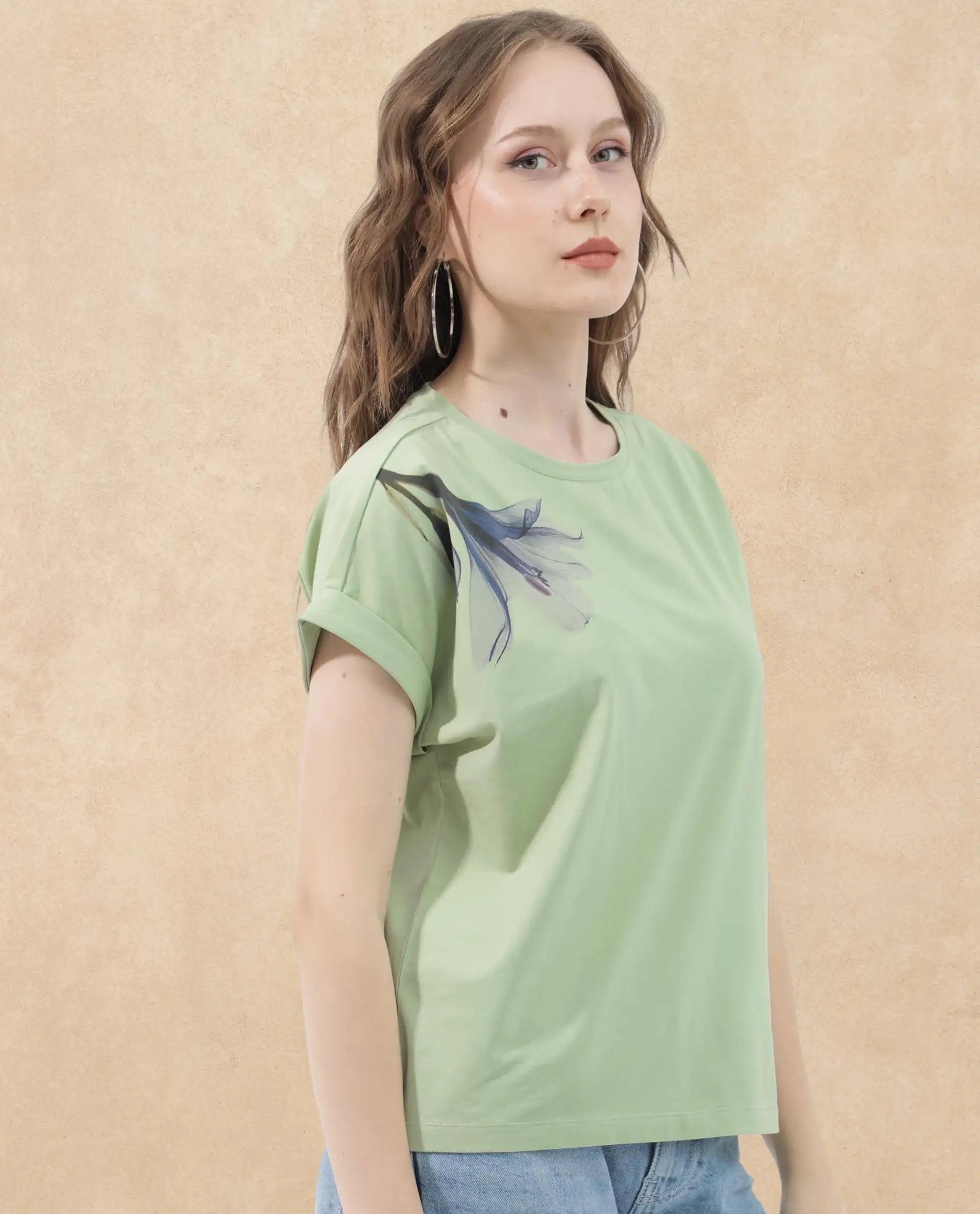 Rareism Women Mattadu Pastel Green Cotton Elastane Fabric Crew Neck Knit Solid T-Shirt