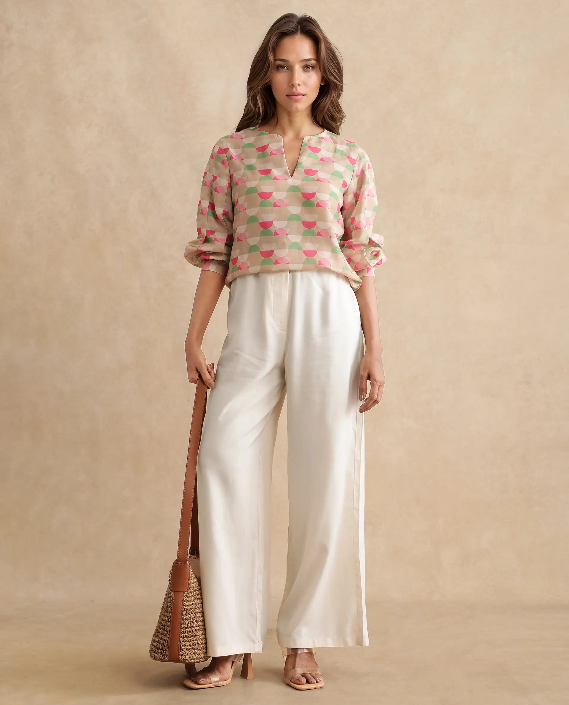 Rareism Women Amaris Multi Linen Fabric Full Sleeve V-Neck Button Closure Geometric Print Regular Fit Top