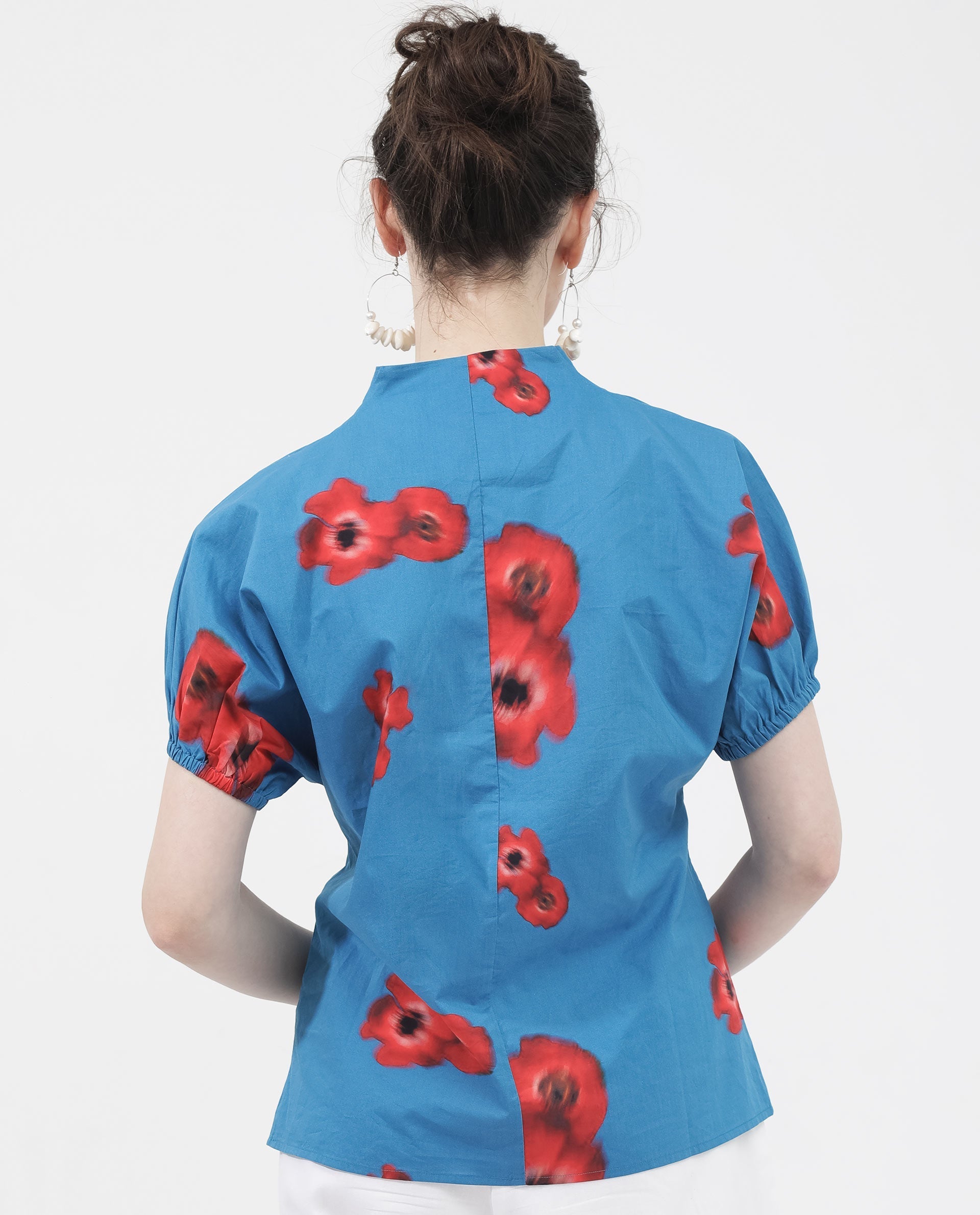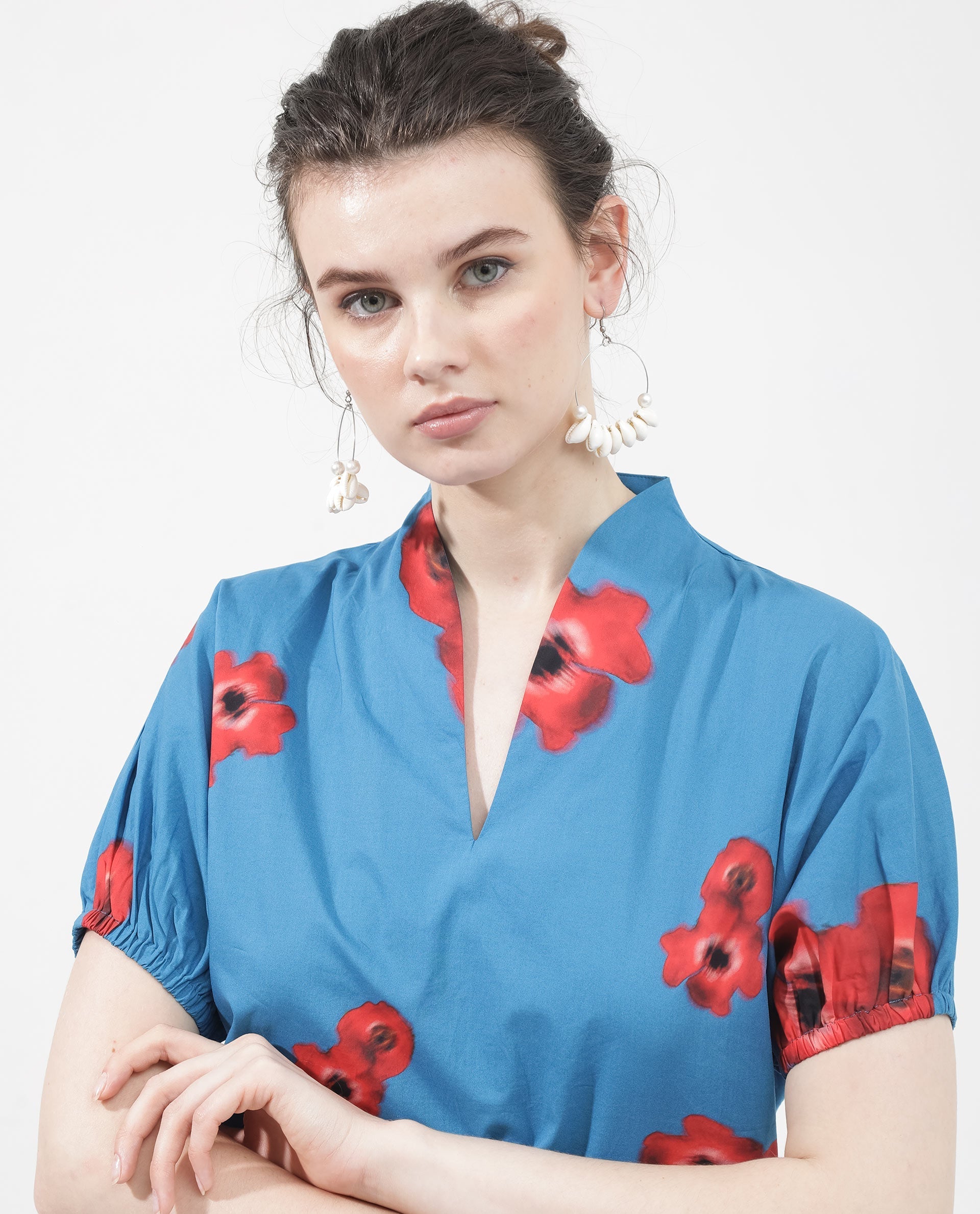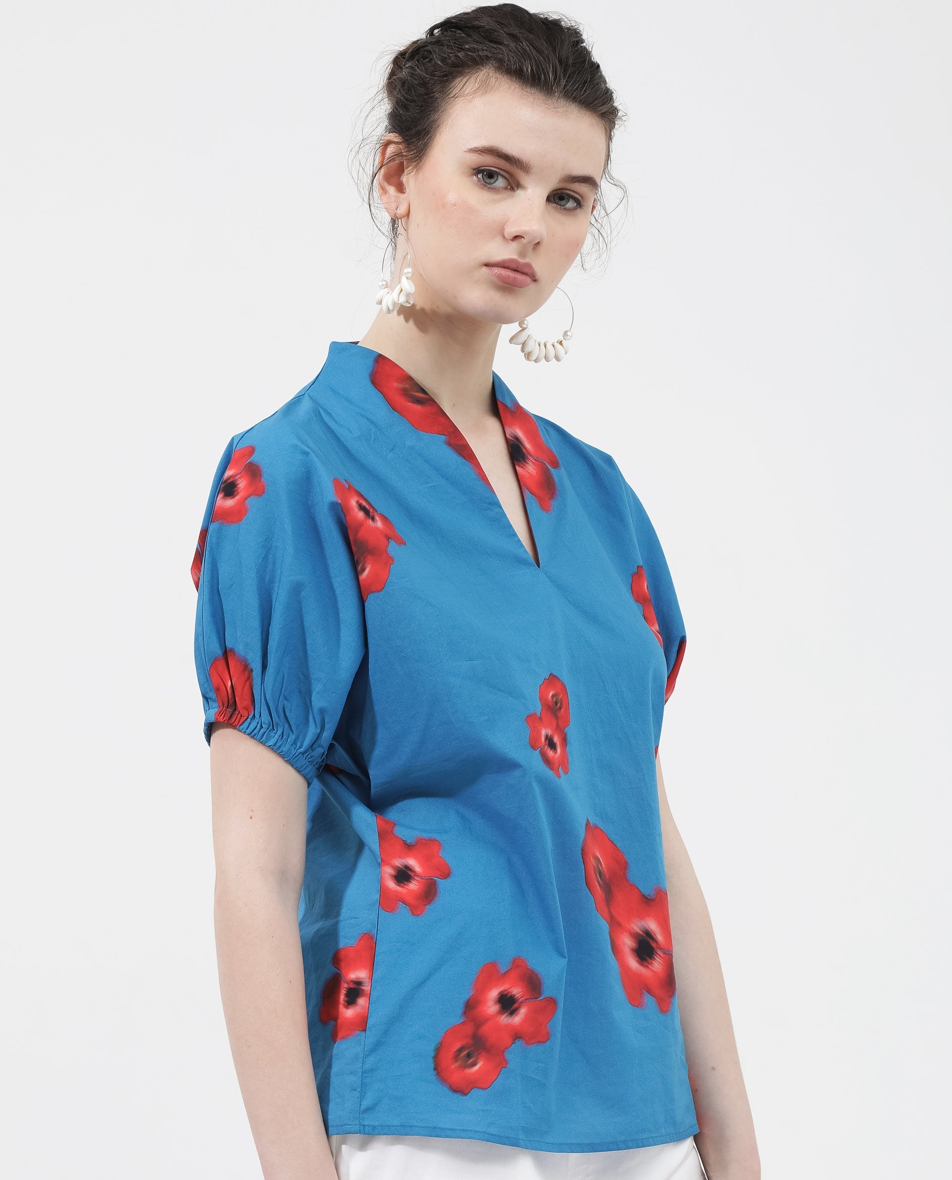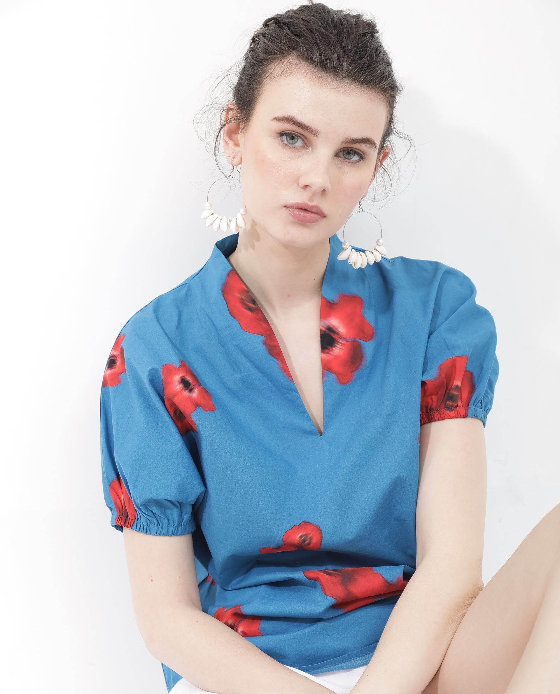 FLORAL PRINTED V-NECK TOP WITH SHORT ELASTIC SLEEVES