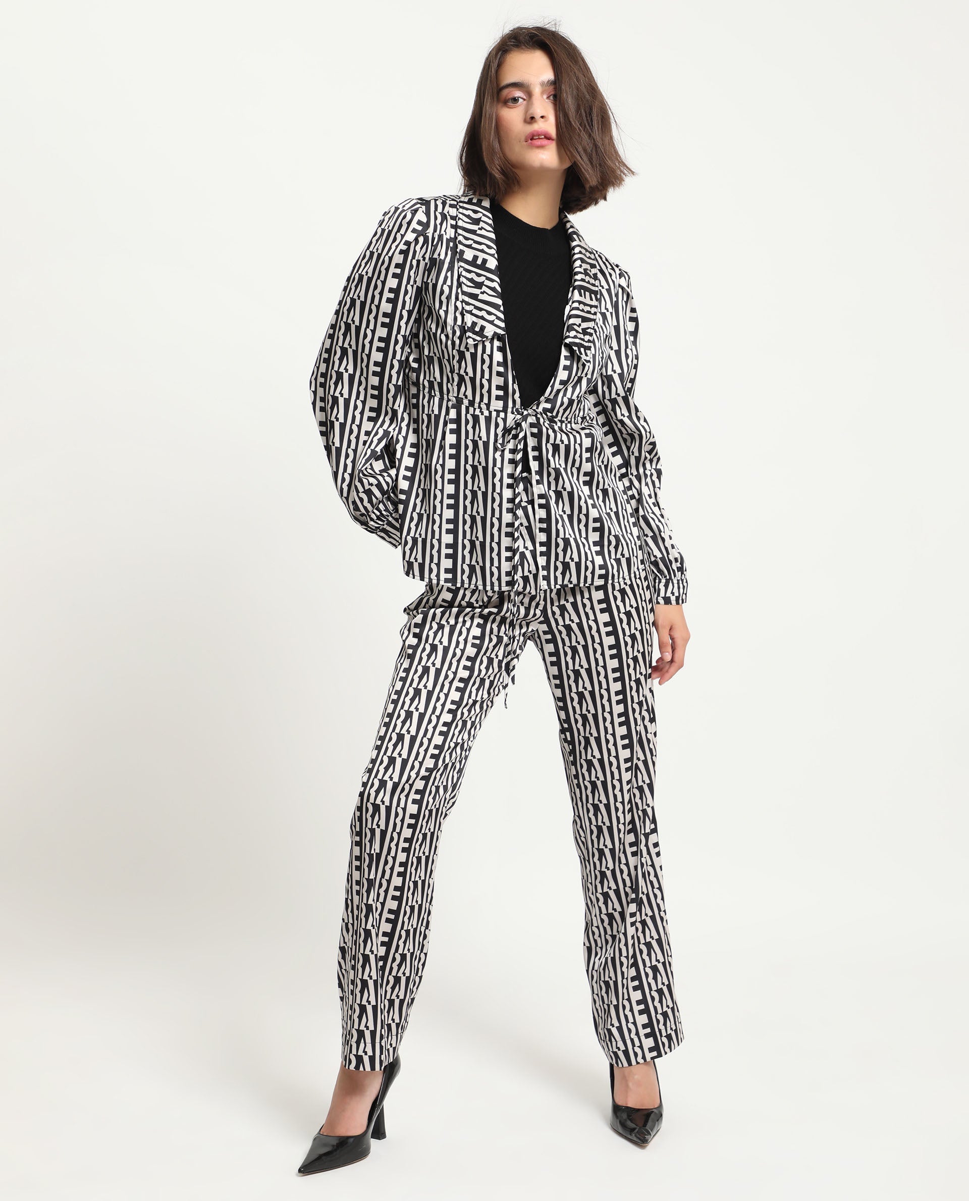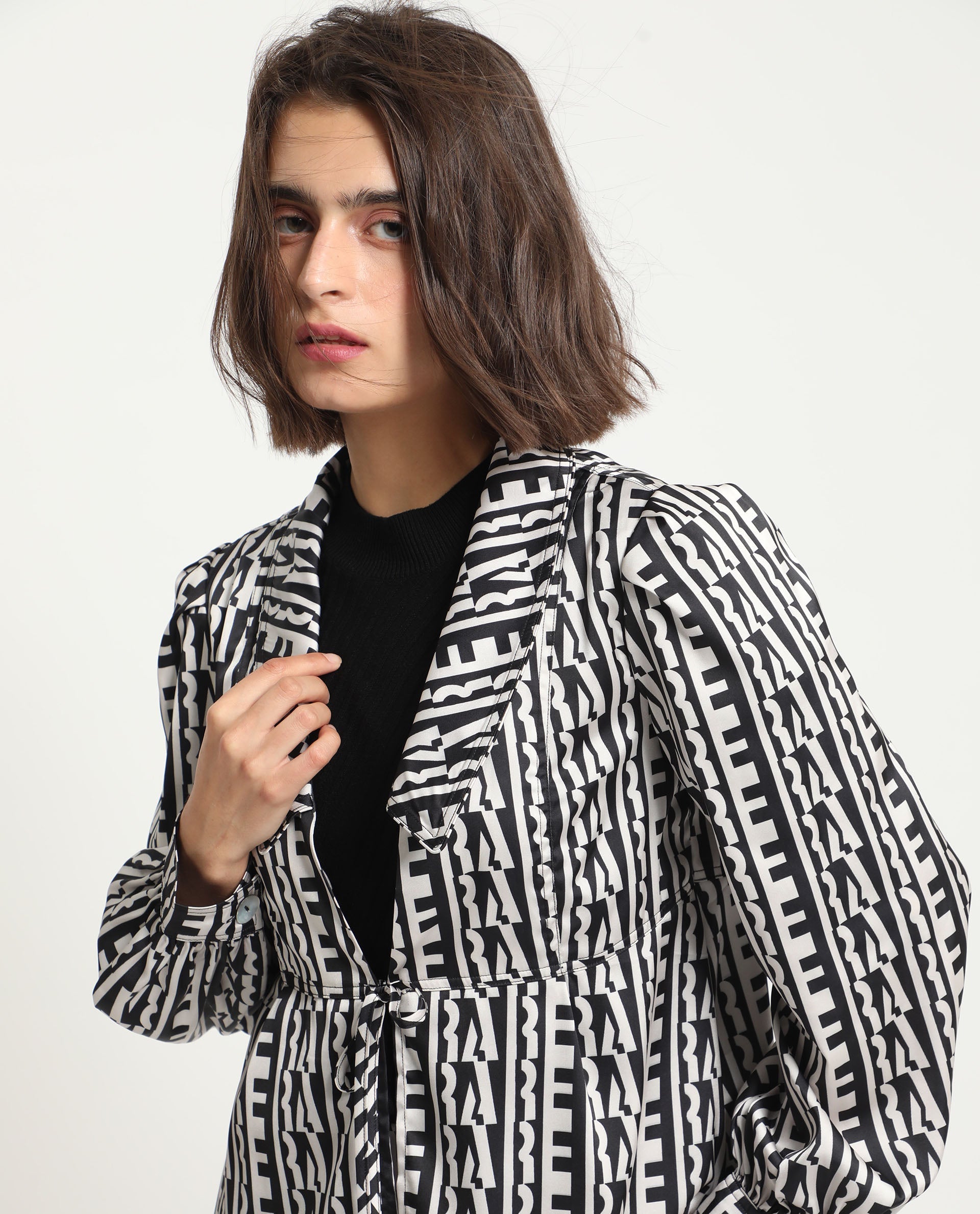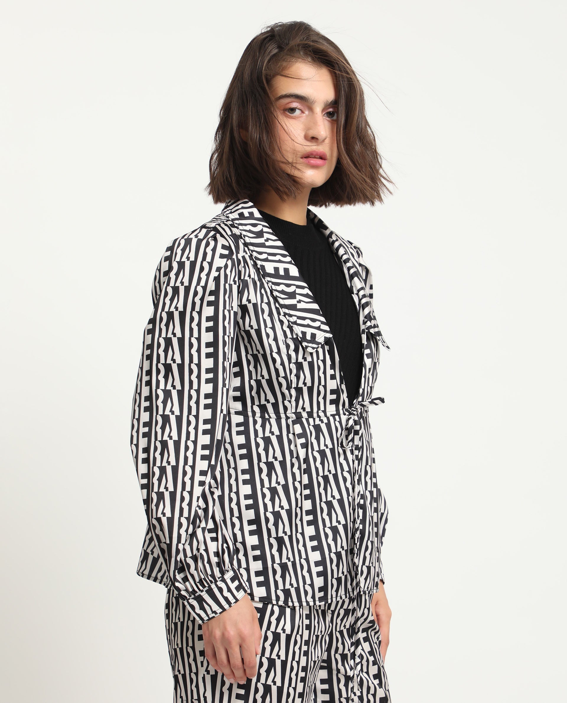 Rareism Women Atlanti Black Polyester Fabric Full Sleeves Tie-Up Closure Collared Neck Relaxed Fit Geometric Print Top