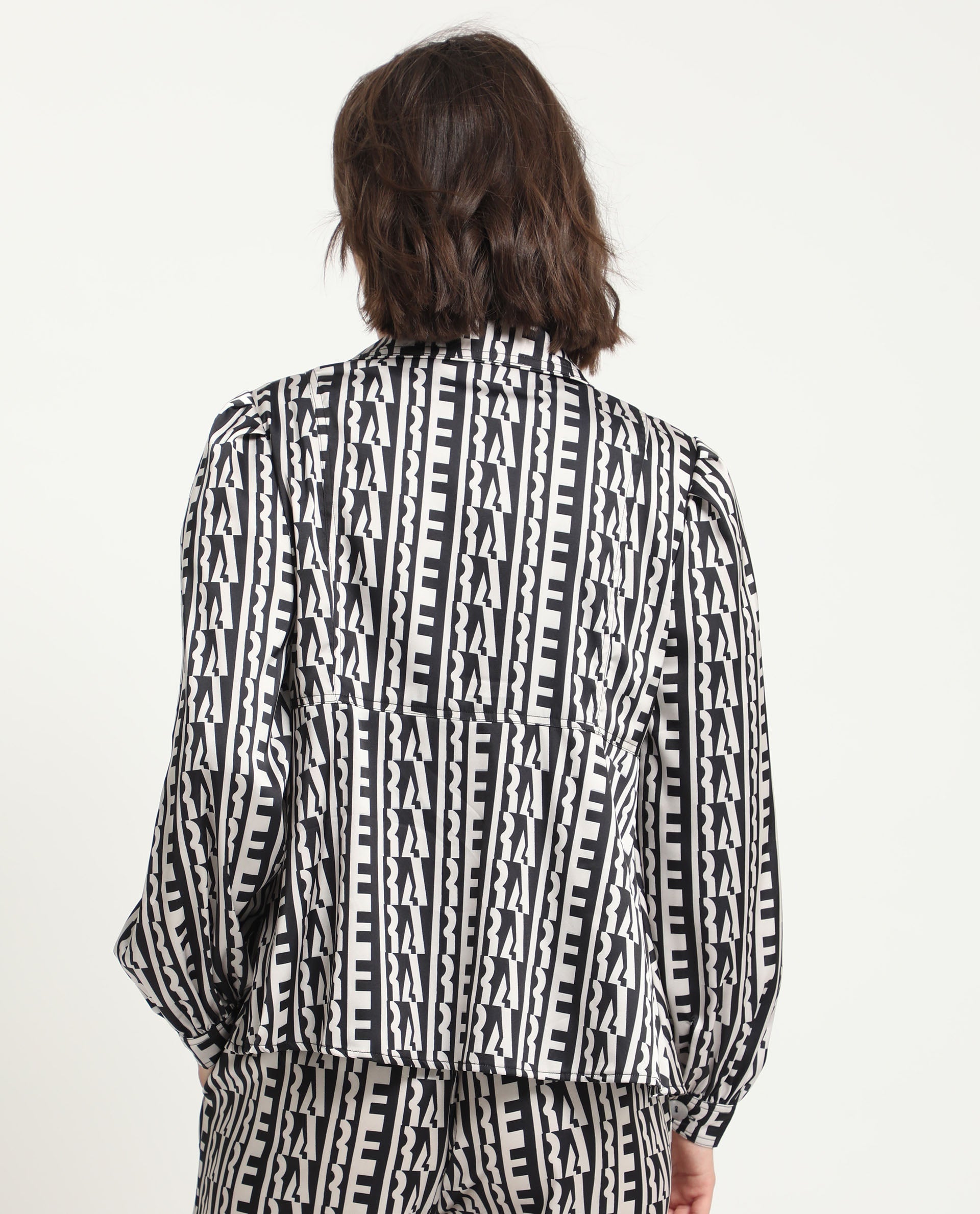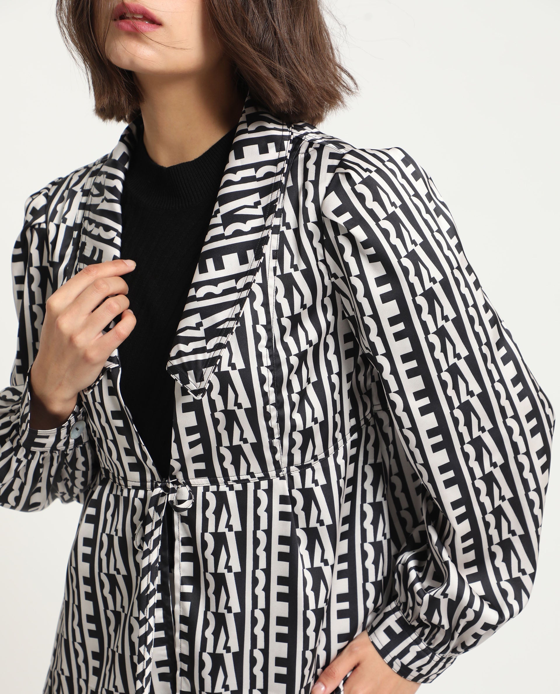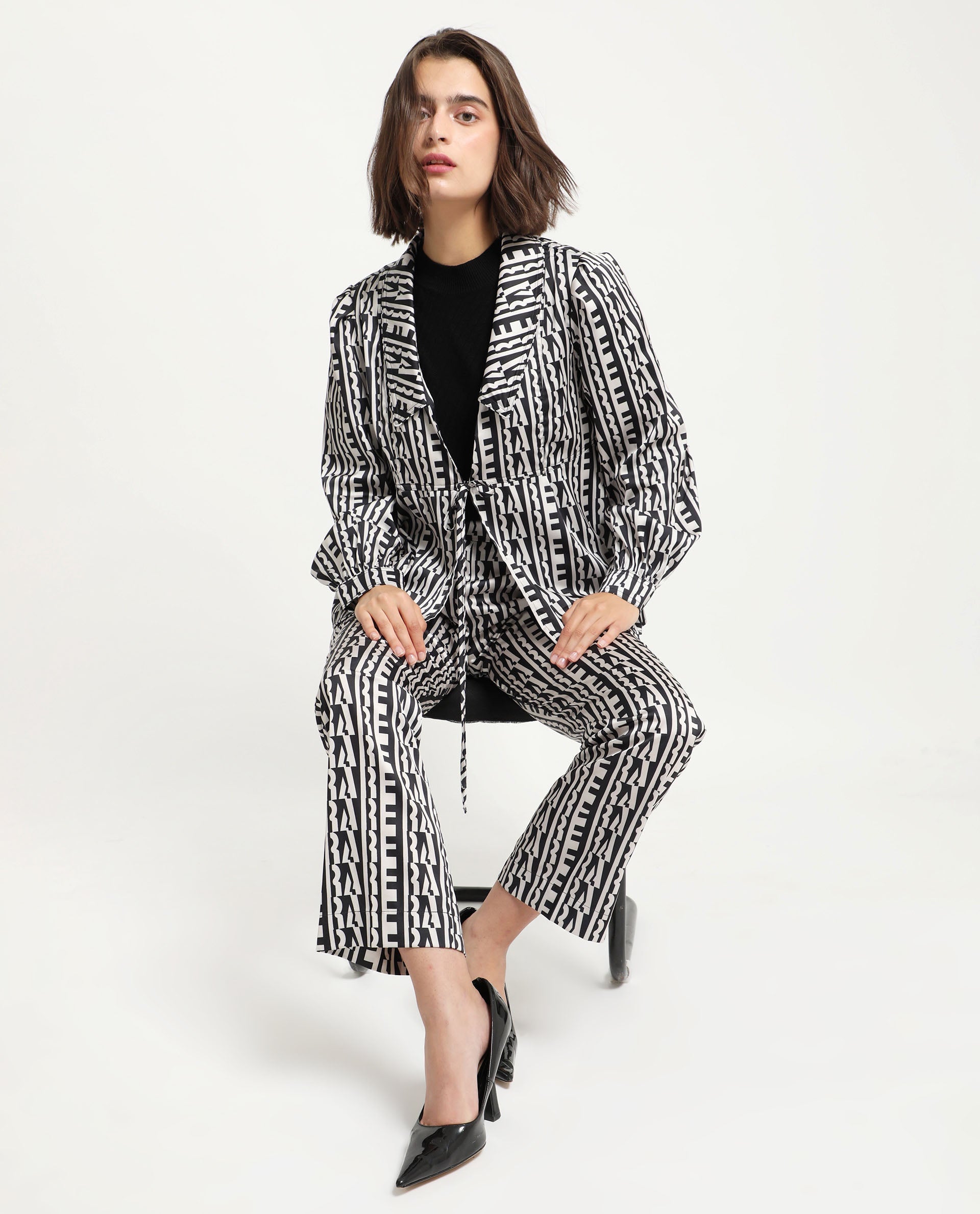 Rareism Women Atlanti Black Polyester Fabric Full Sleeves Tie-Up Closure Collared Neck Relaxed Fit Geometric Print Top