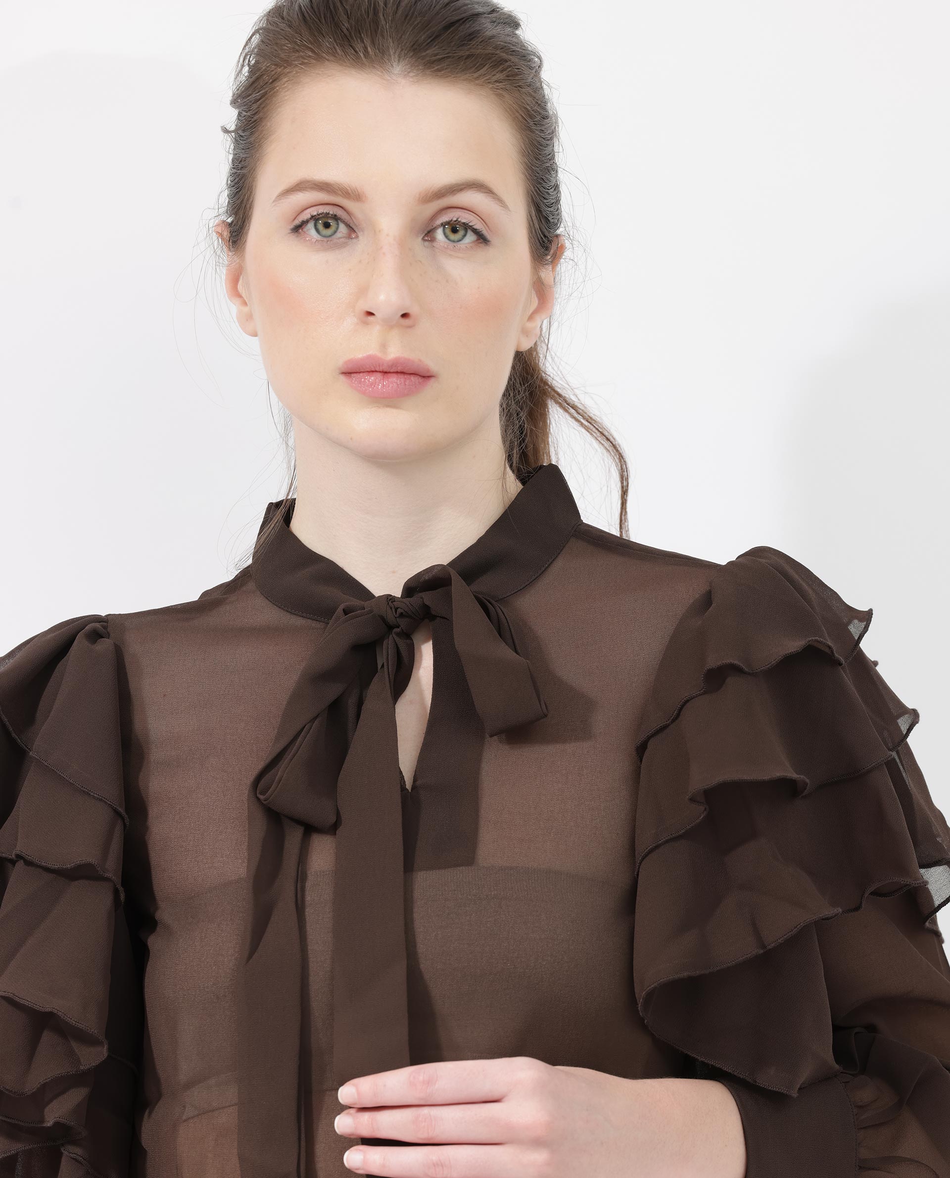 3. Full sleeves with layered ruffles at the shoulder create a romantic and feminine look.