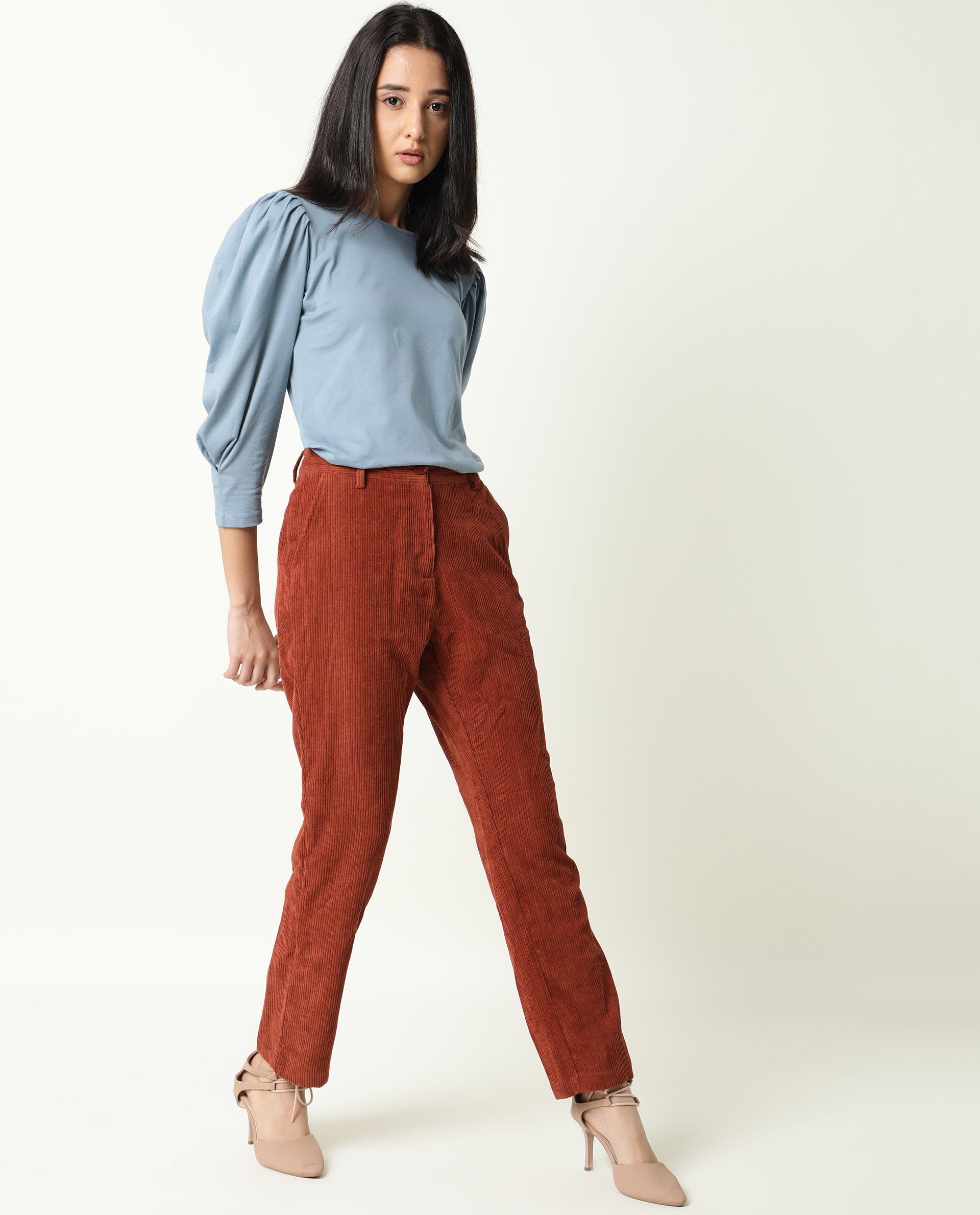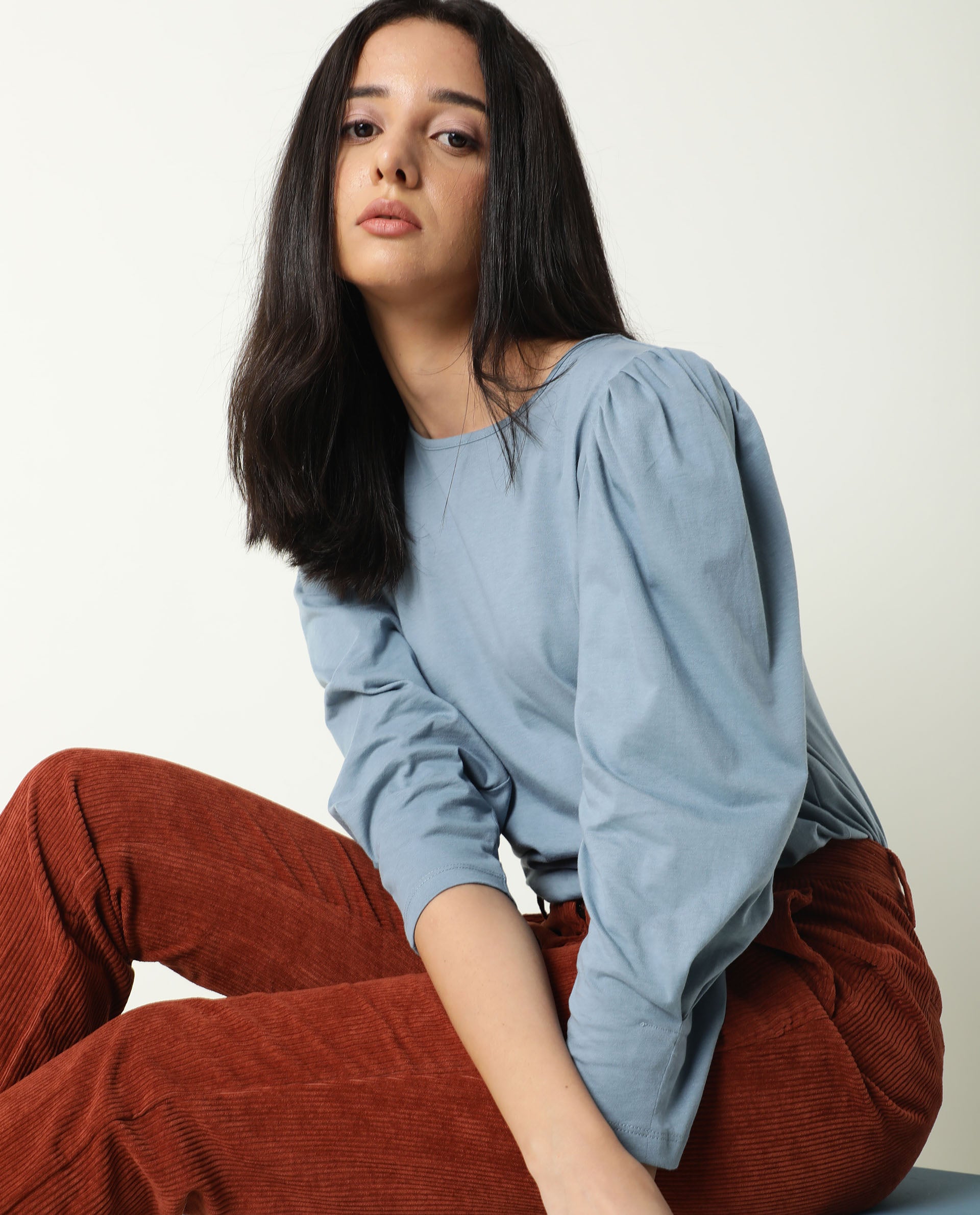 Rareism Women Ballerina Blue Cotton Fabric Regular Fit Knee Length Boat Neck 3/4Th Sleeves Solid Top