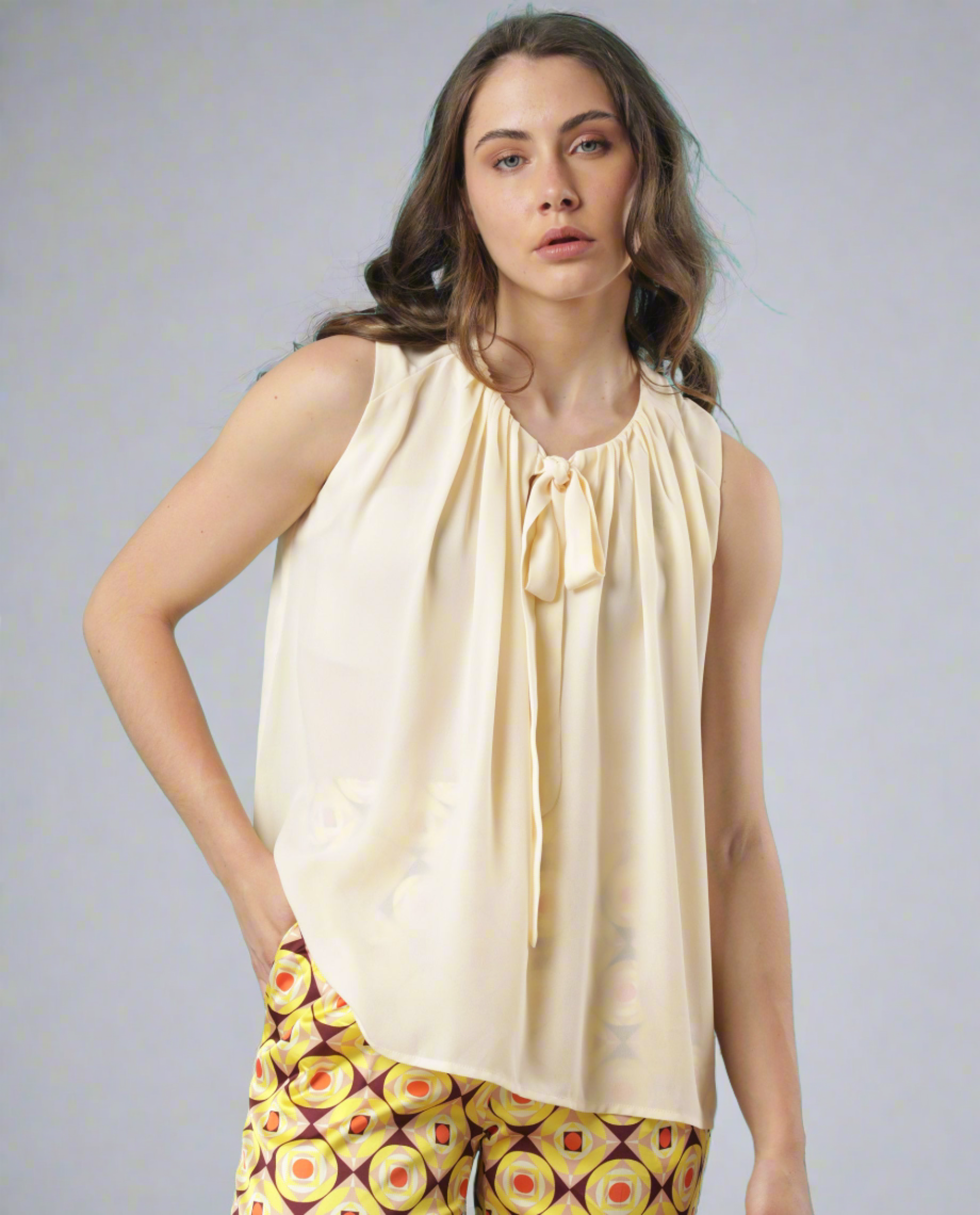 Experience chic comfort in our Sleeveless Top featuring a flowing gathered neckline and a front pull-in tie-up for added style.