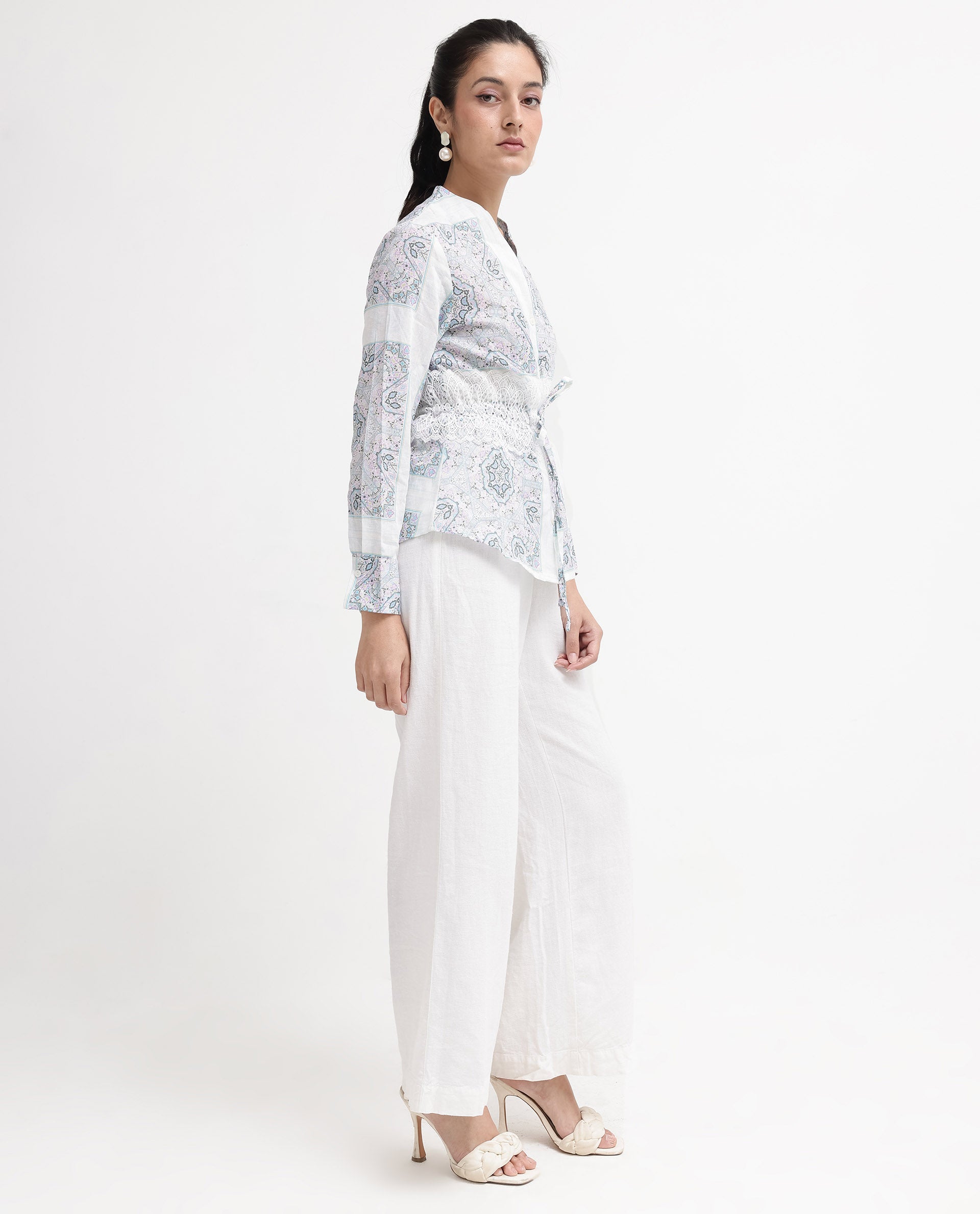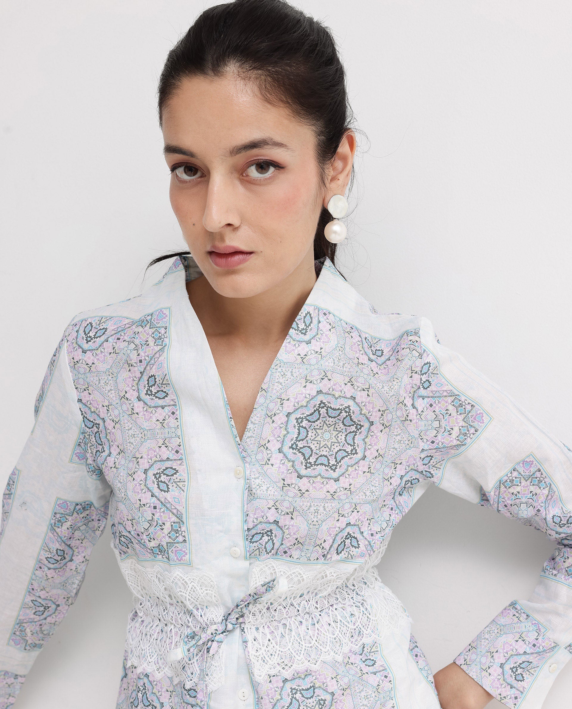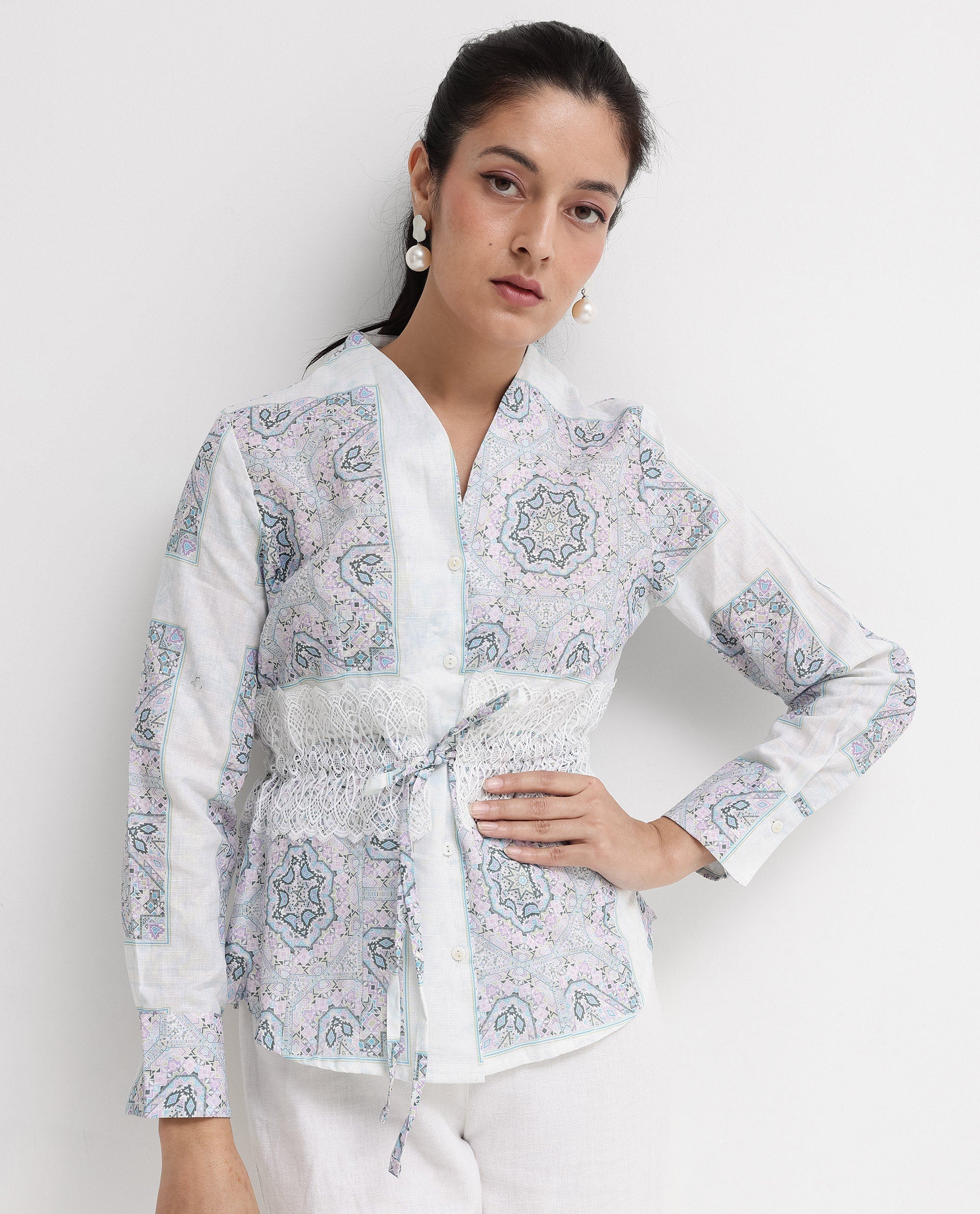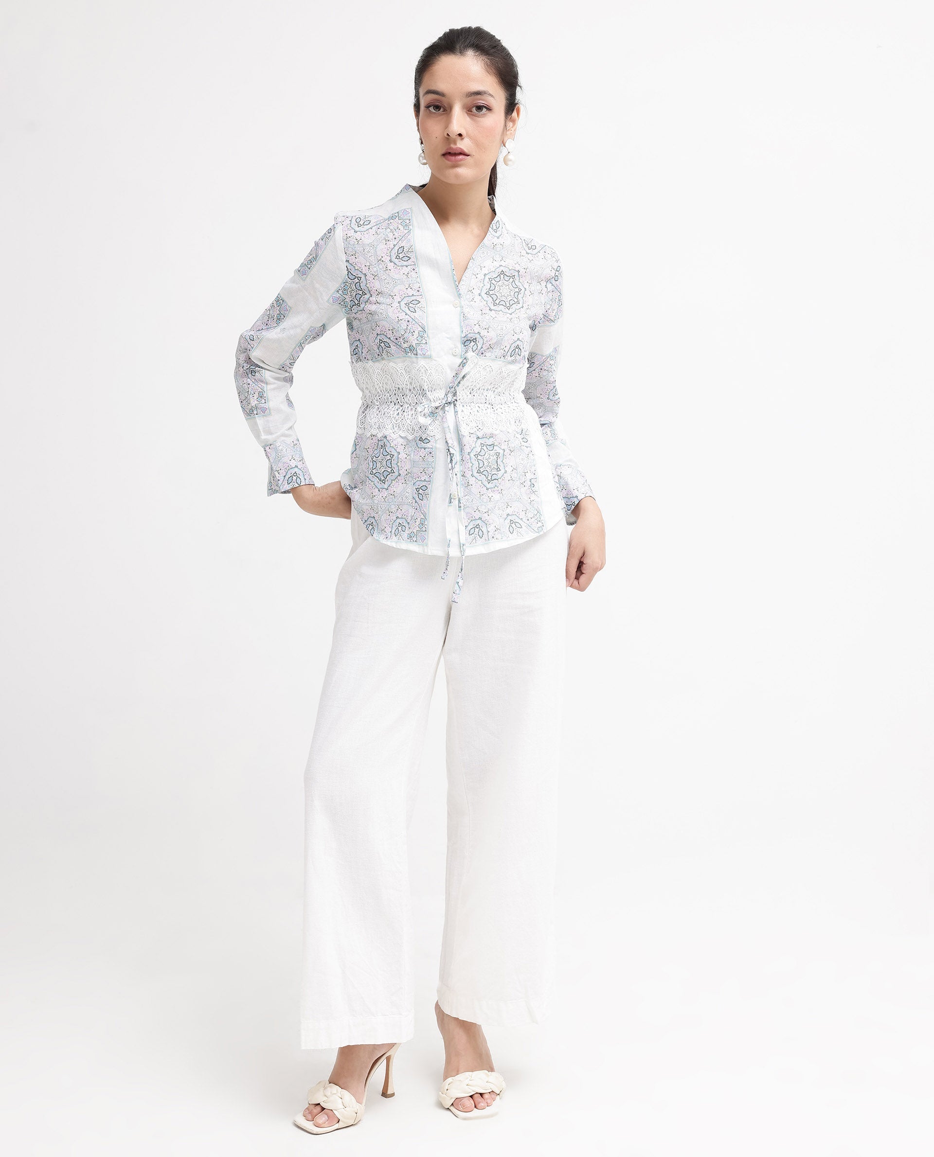 Rareism Women Chanteo Light Multi Cuffed Sleeve V-Neck Button Abstract Print Top
