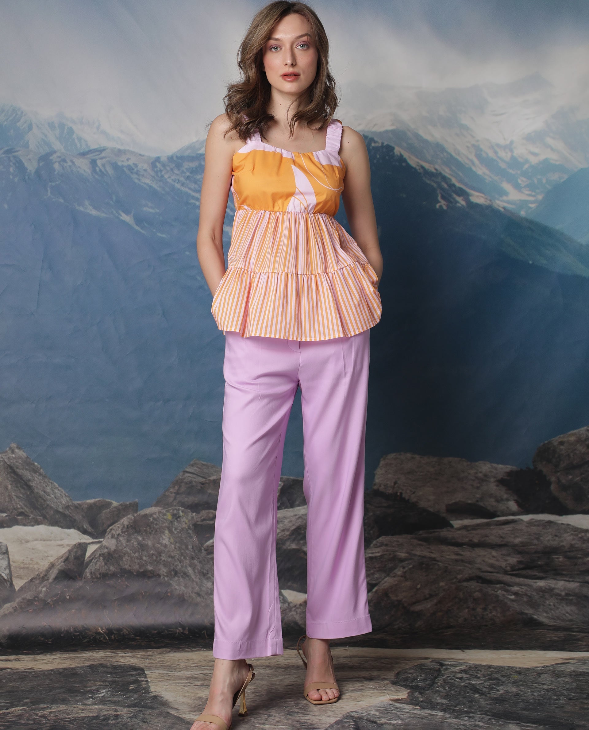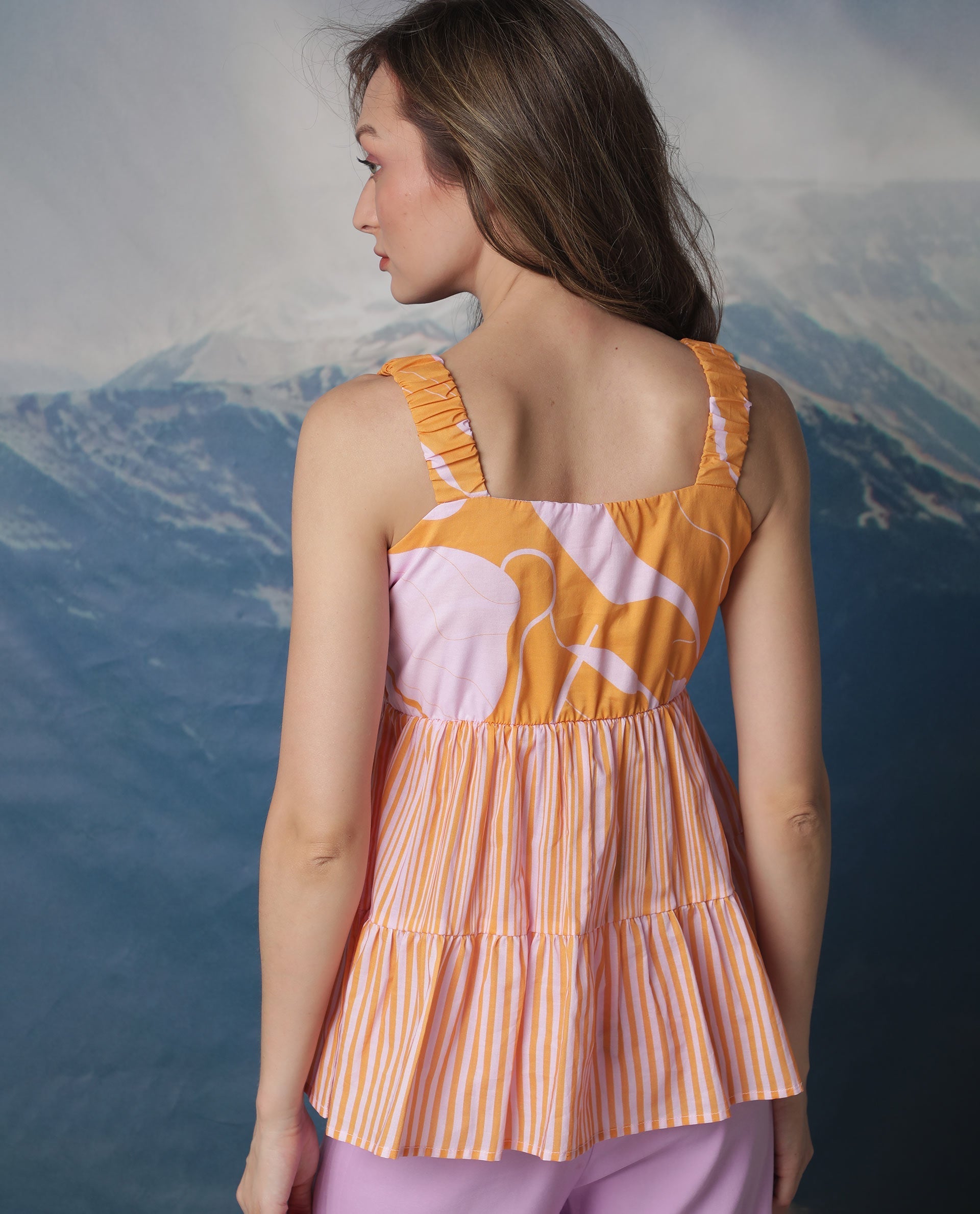 Elevate your wardrobe with our Tiered Square Neck Top, boasting wide elastic straps and a captivating mix-and-match print of abstracts and stripes for a truly eclectic look.