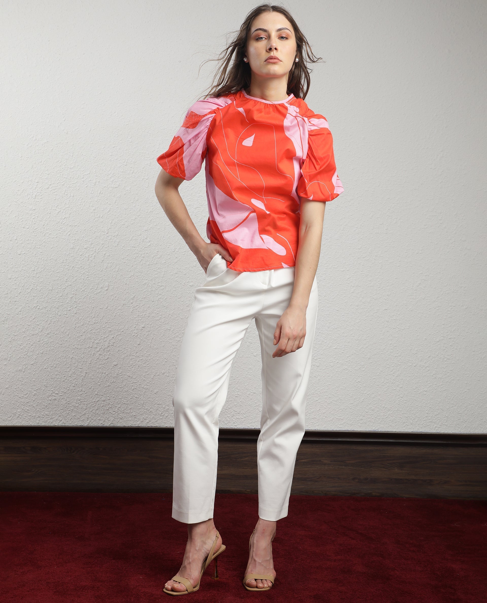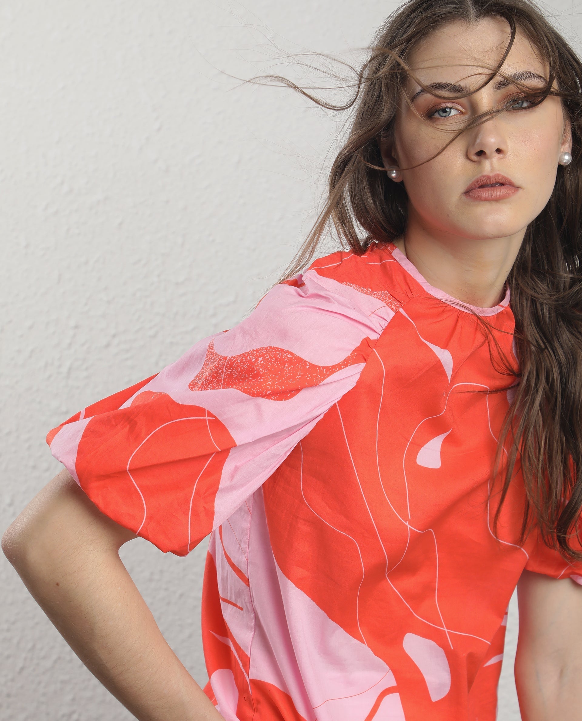 1. Breathable cotton blend construction for comfort. 2. Stylish balloon sleeves with voluminous puff detailing. 3. Round neck and raglan cut for a flattering fit. 4. Back keyhole and button fastening for added flair. 5. Features a statement abstract print for a bold look. 6. Crafted from lightweight cotton fabric for ease of wear. Pair with high-waisted jeans and sandals for a casual daytime look. Dress up with a midi skirt and heels for a stylish evening ensemble. Layer under a denim jacket for a trendy yet relaxed vibe. Complete the outfit with minimal accessories to let the abstract print shine.