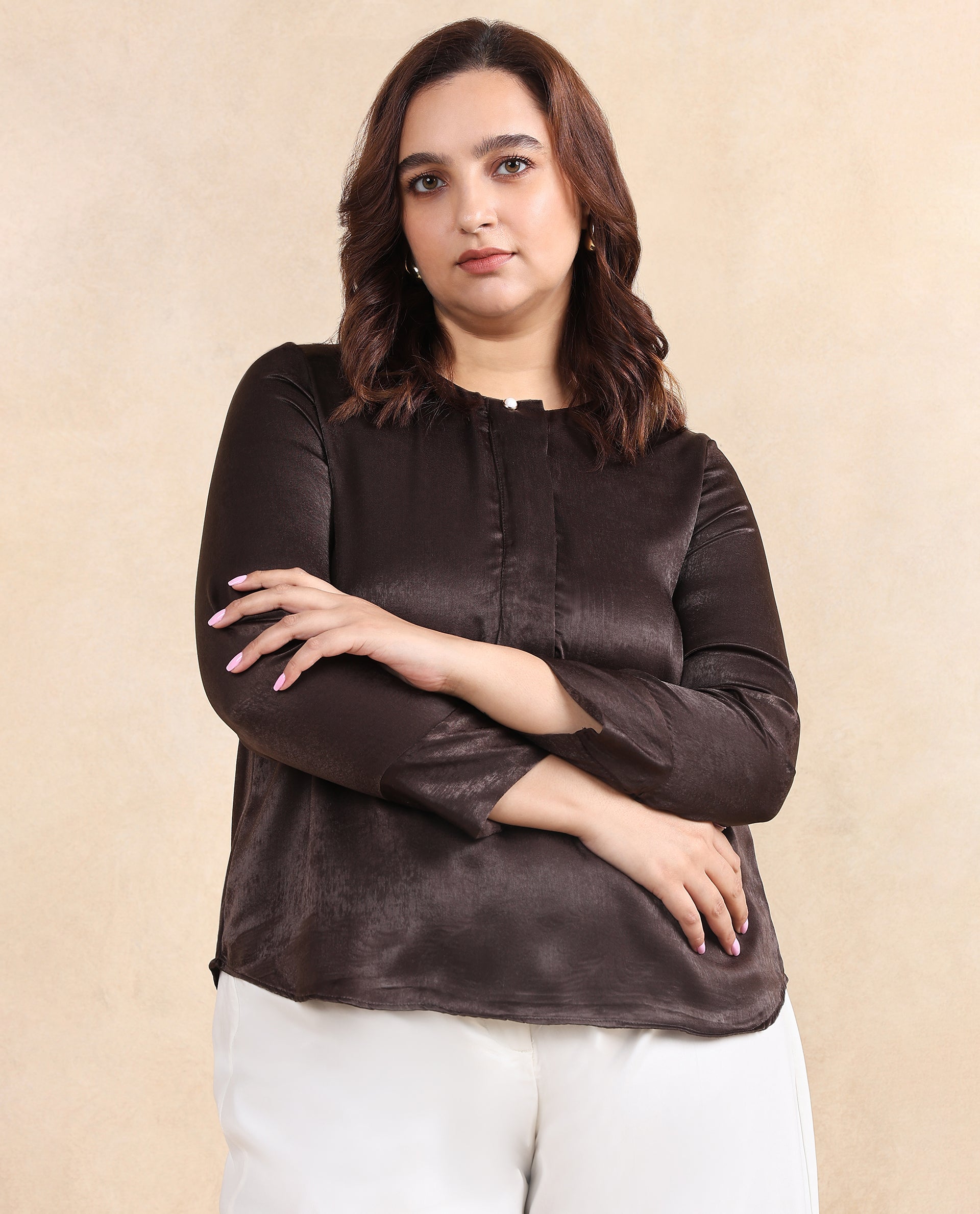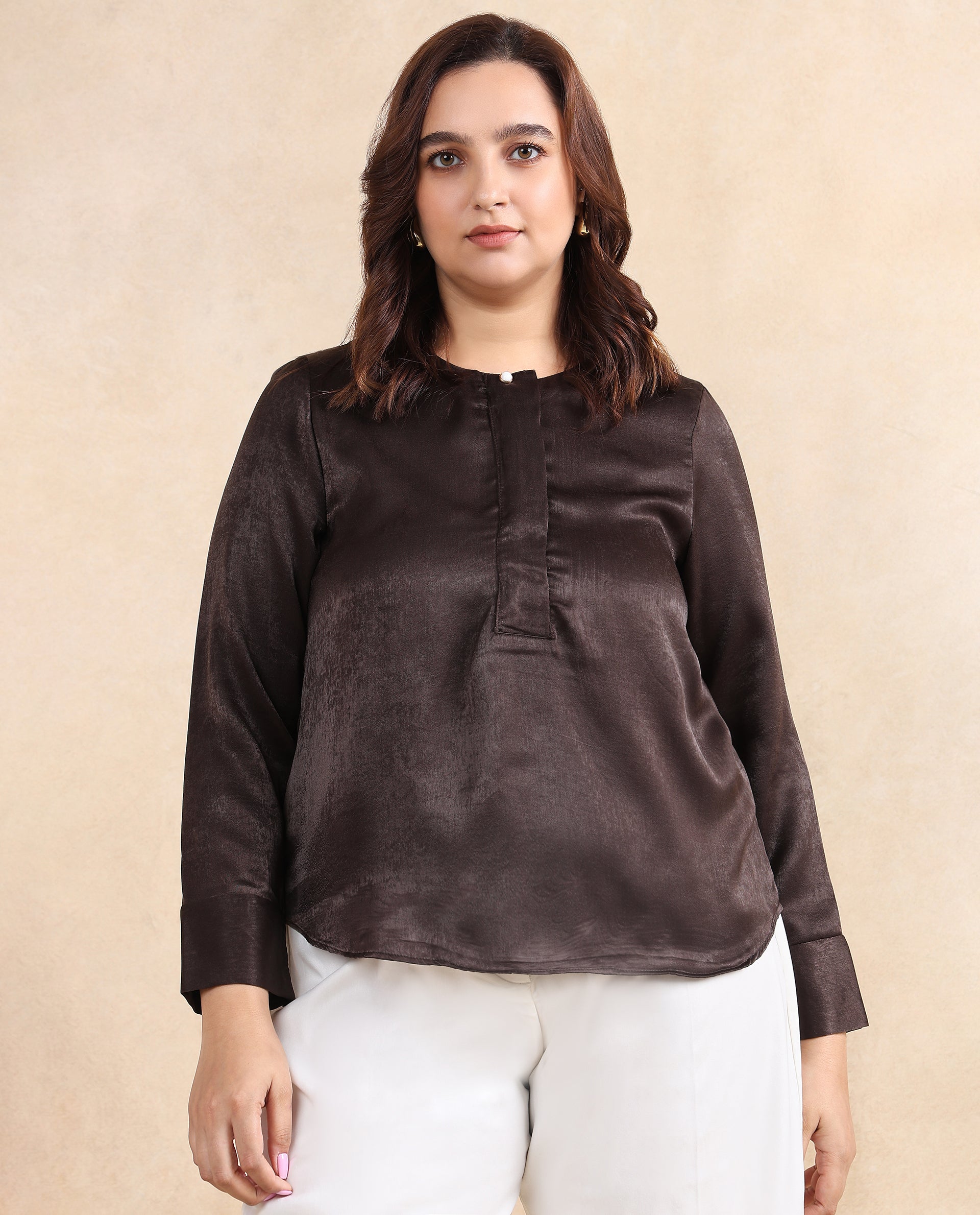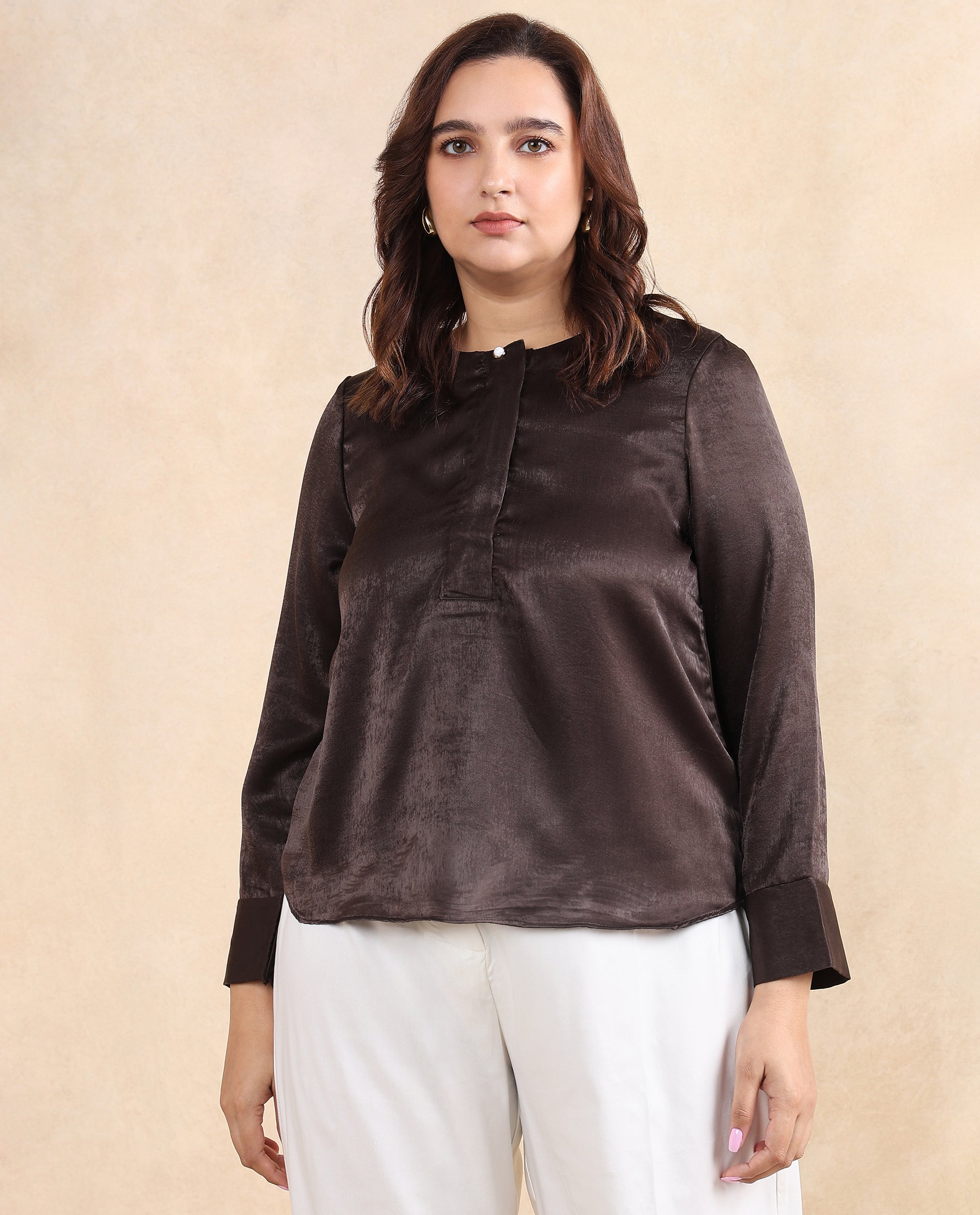 Rareism Women Daxzo Brown Velvet Regular Sleeves Round Neck Button Closure Relaxed Fit Plain Top