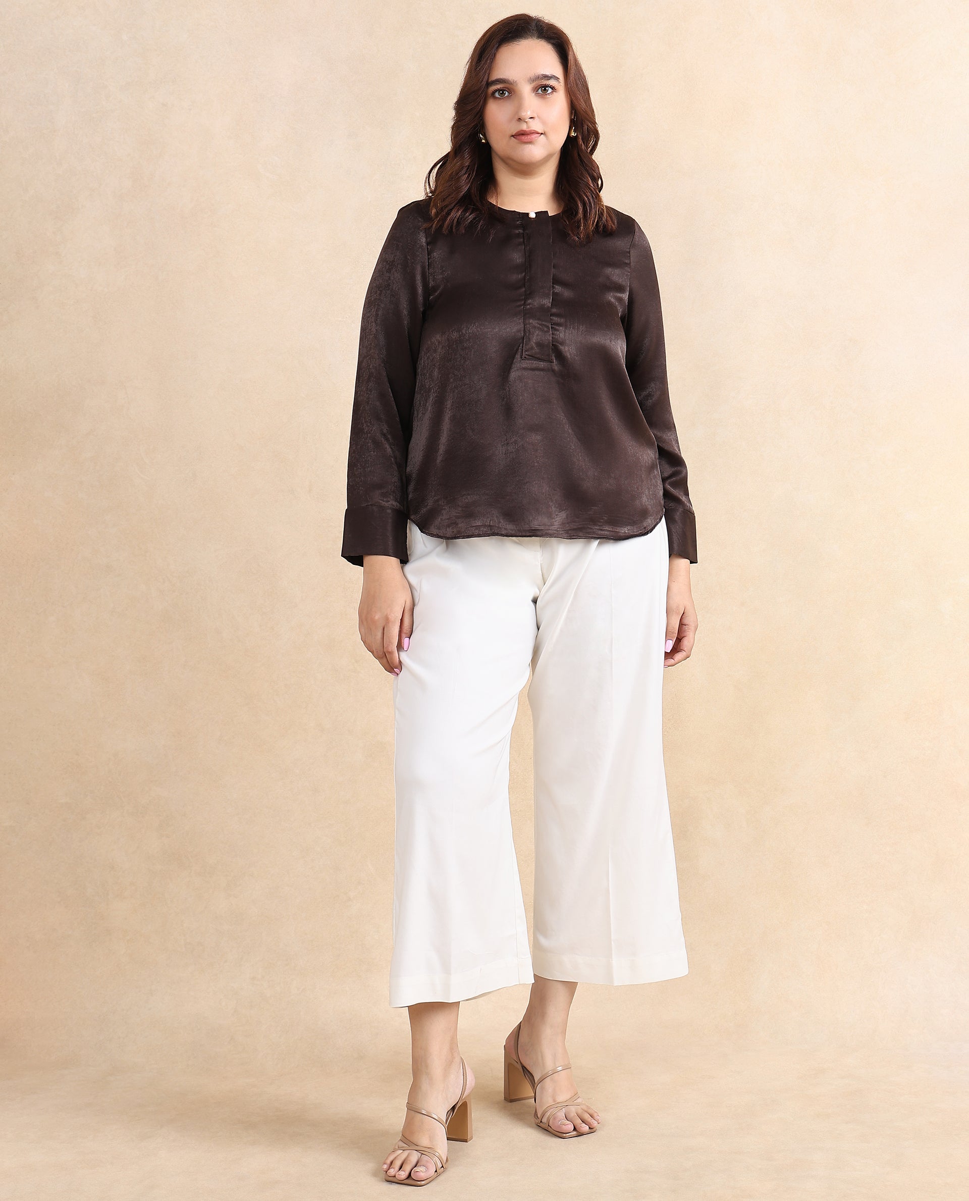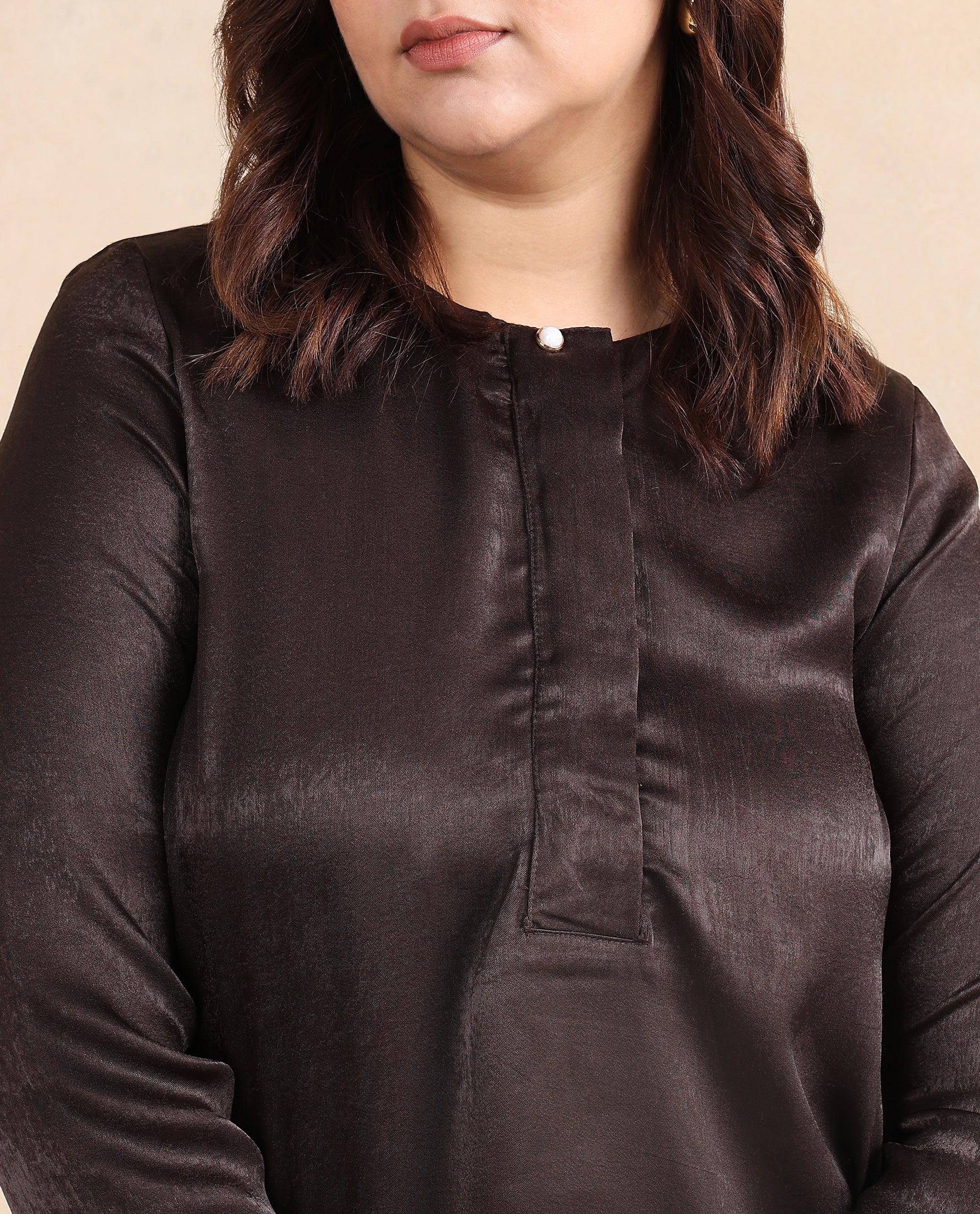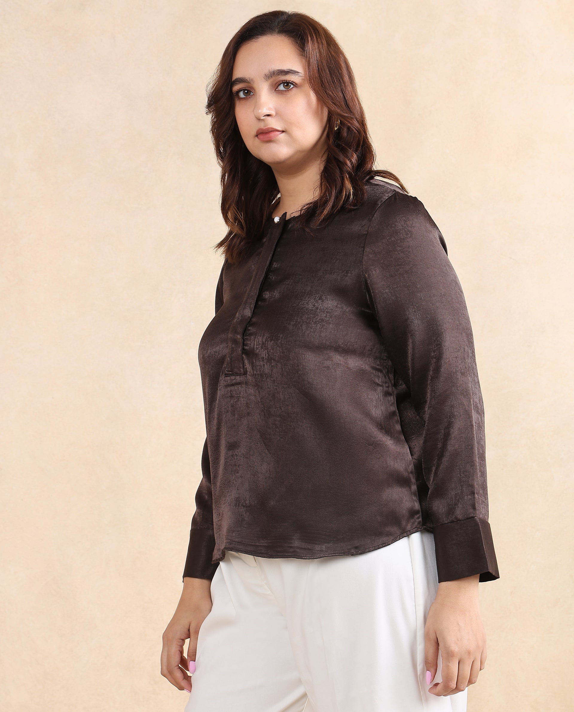 Rareism Women Daxzo Brown Velvet Regular Sleeves Round Neck Button Closure Relaxed Fit Plain Top