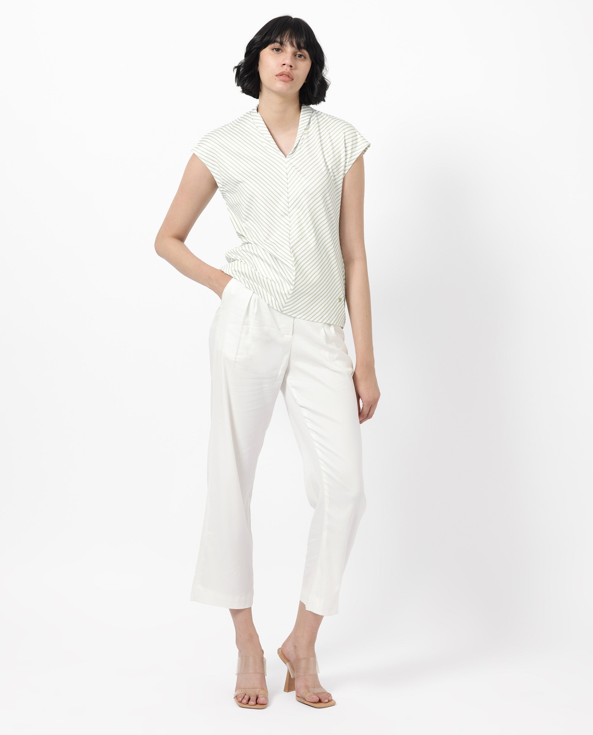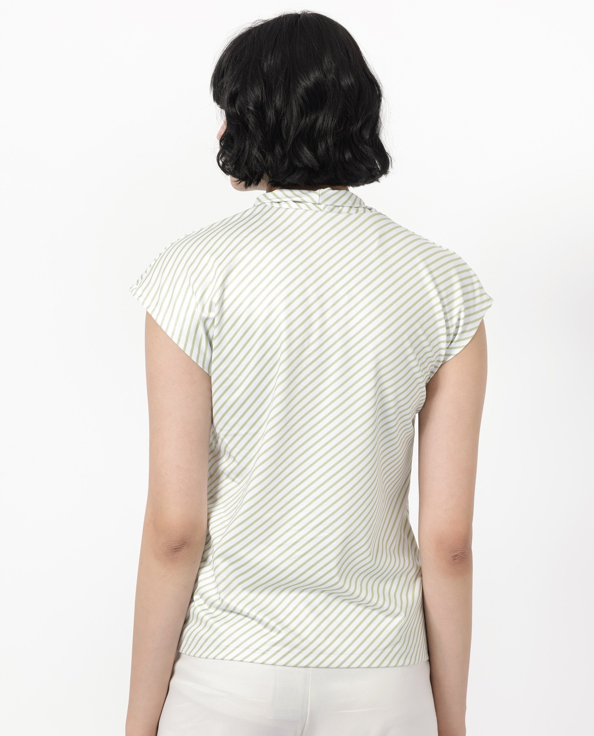 Rareism Women Deon Green Polyester Fabric V-Neck Sleeveless Regular Fit Striped Top