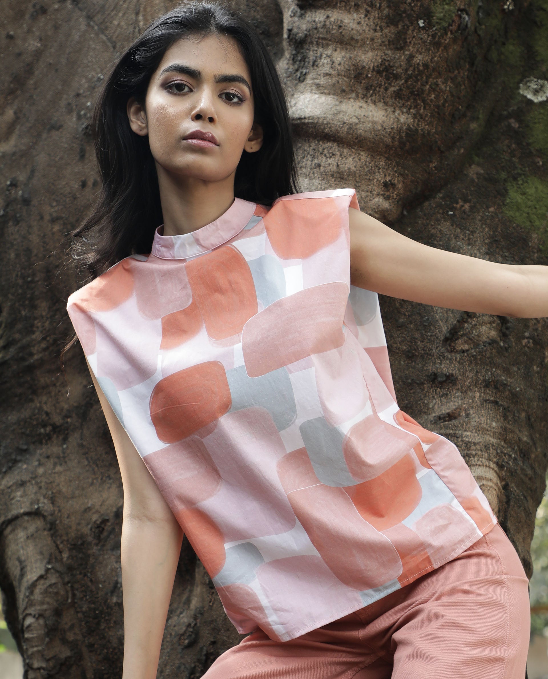 SHOULDER PADDED ABSTRACT PRINT BOXY TOP