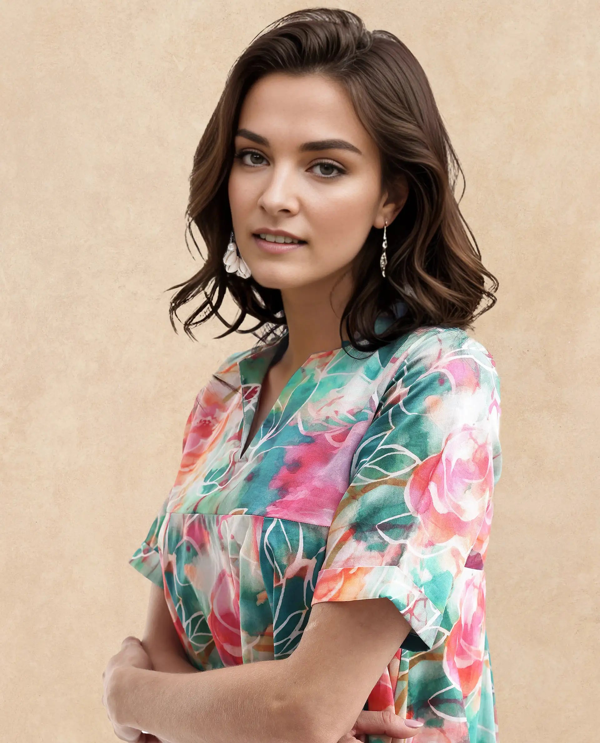 Discover the vibrant charm of our Floral Flare Boxy Fit Knee-Length Dress, perfect for casual outings. This women's Slit neck dress, crafted from premium cotton fabric, offers a comfortable fit and flare silhouette. The eye-catching multi-color floral print adds a touch of elegance, making it a must-have for your wardrobe. Designed with half sleeves and a regular woven sleeve style, this dress ensures a relaxed yet stylish look. Ideal for any casual occasion, its knee-length design provides a flattering fit. Elevate your fashion game with this trendy floral dress, combining comfort and style effortlessly.