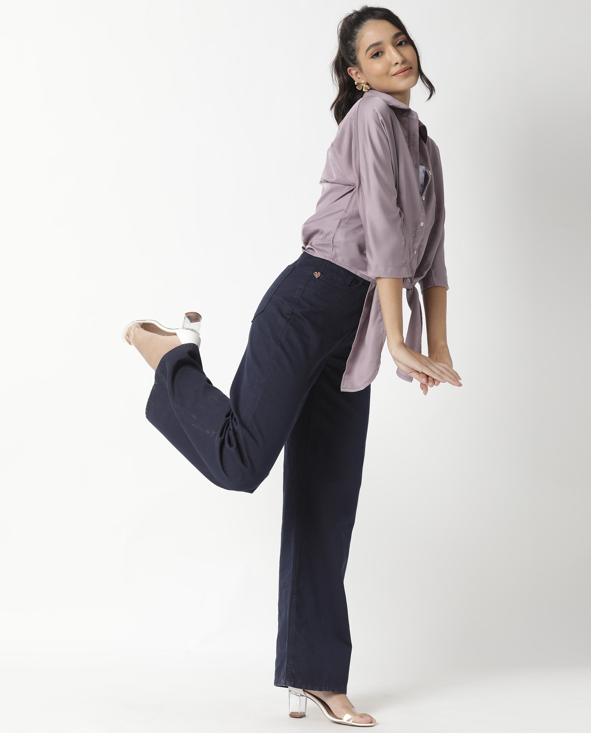 Rareism Women Euro Light Purple Polyester Fabric Tailored Fit Shirt Collar 3/4Th Sleeves Solid Top