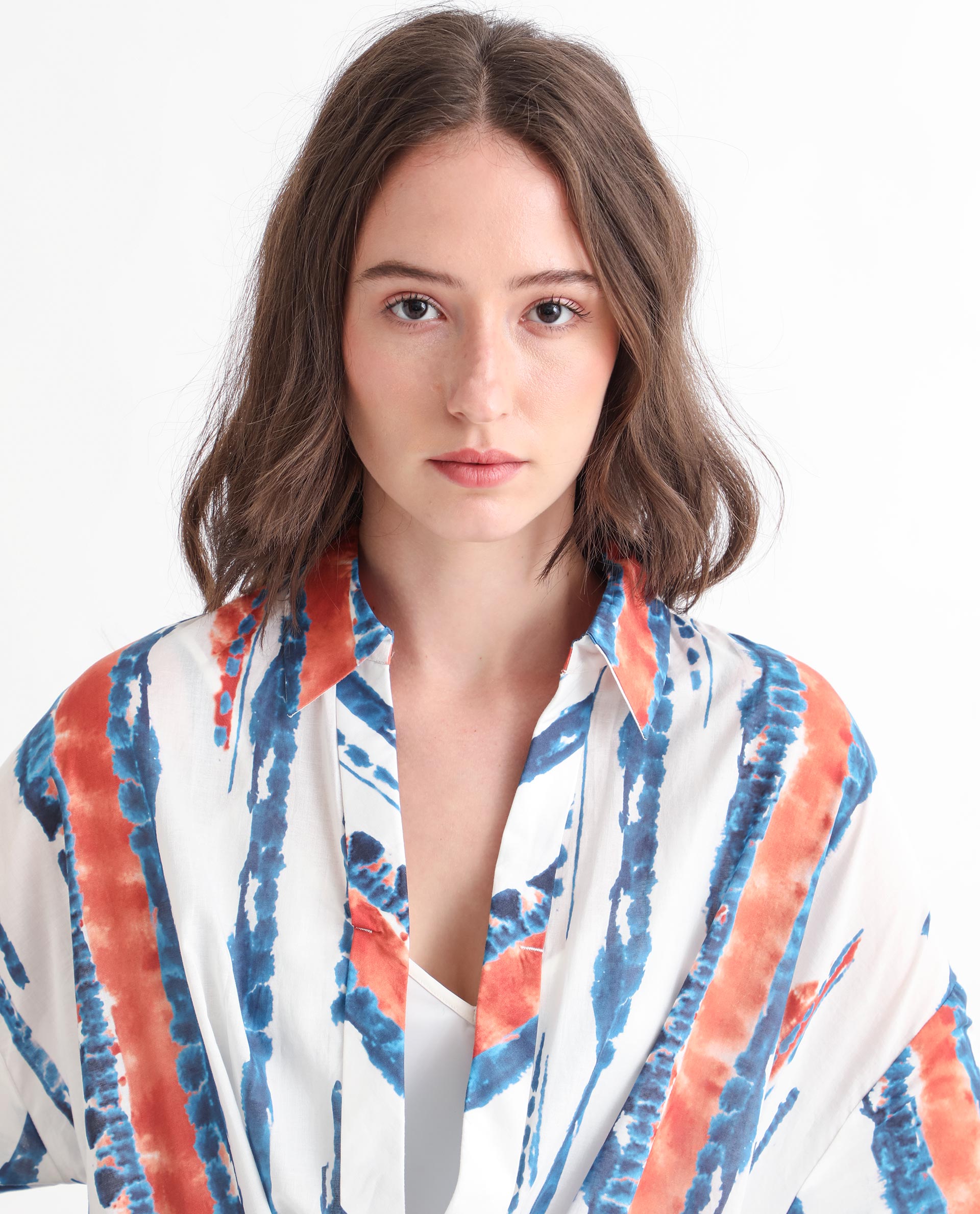 A printed top with V-neck and collar in full sleeves.