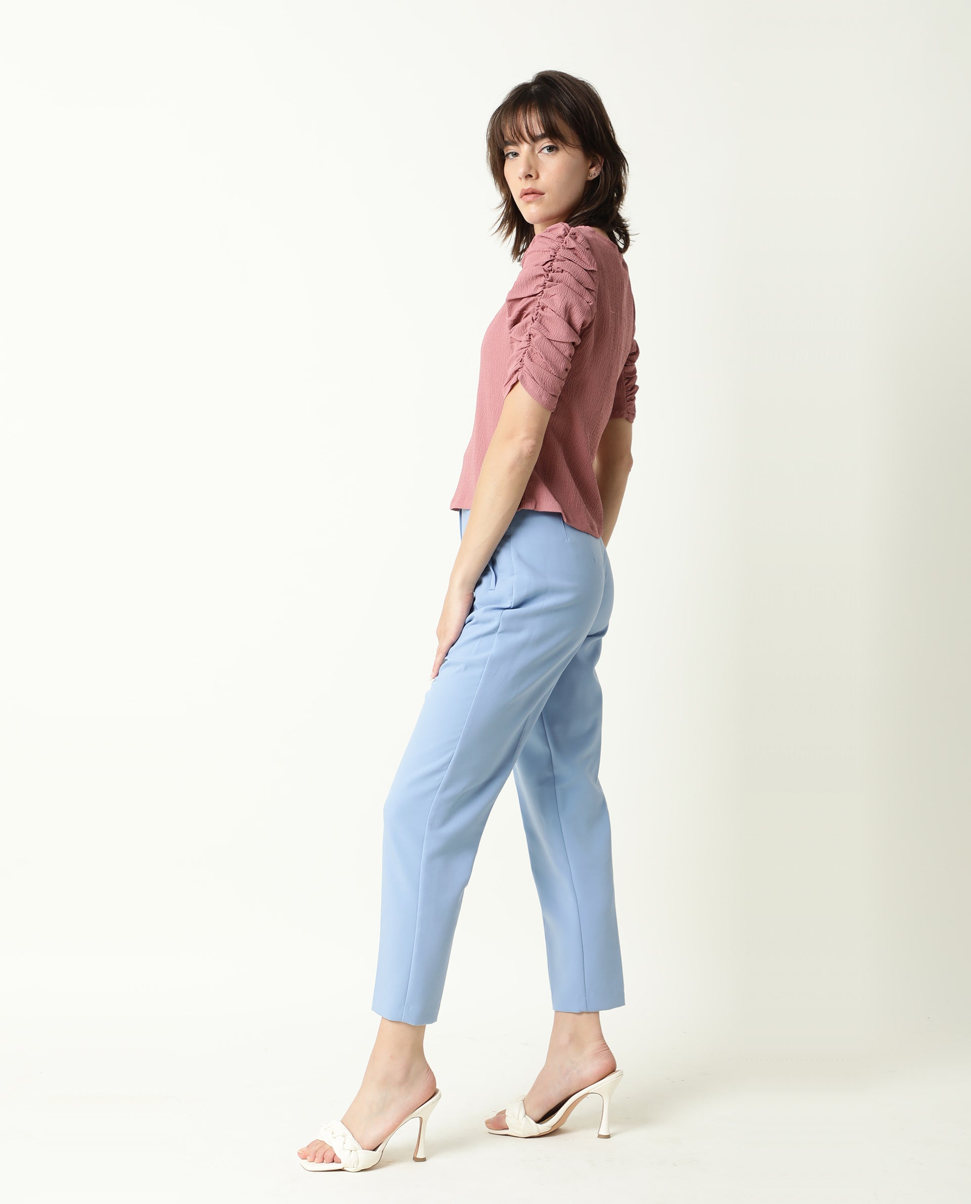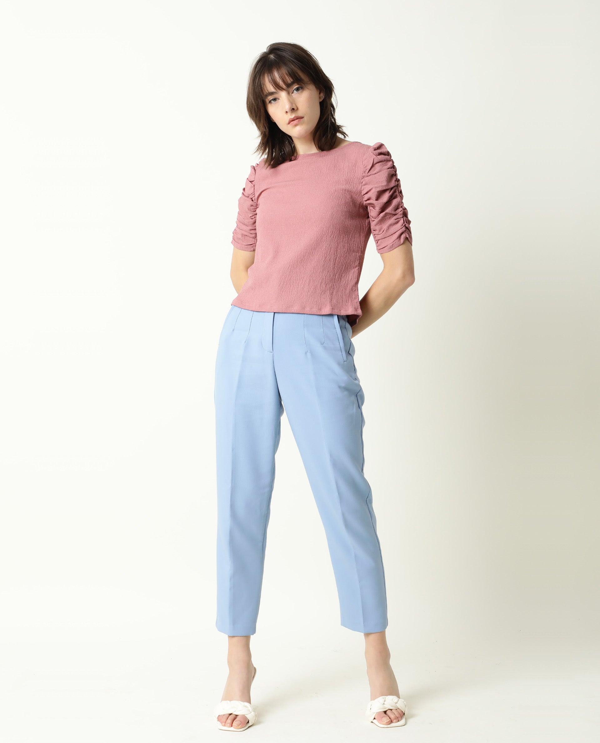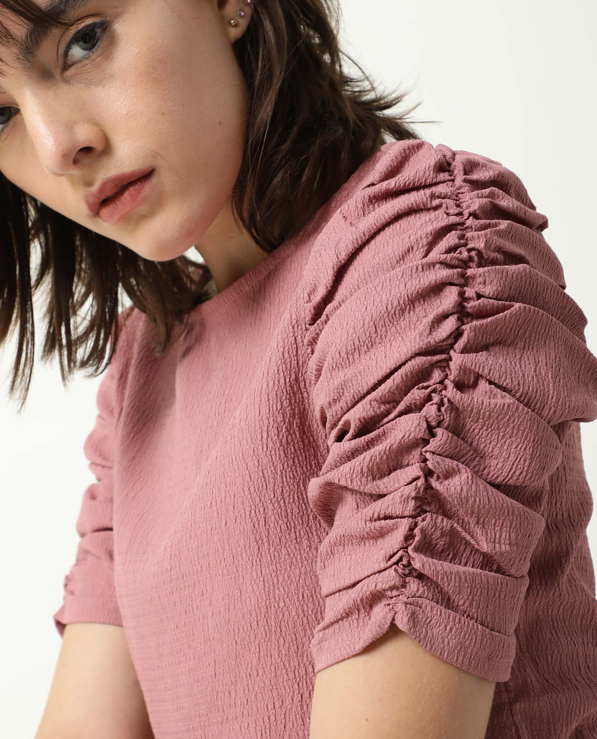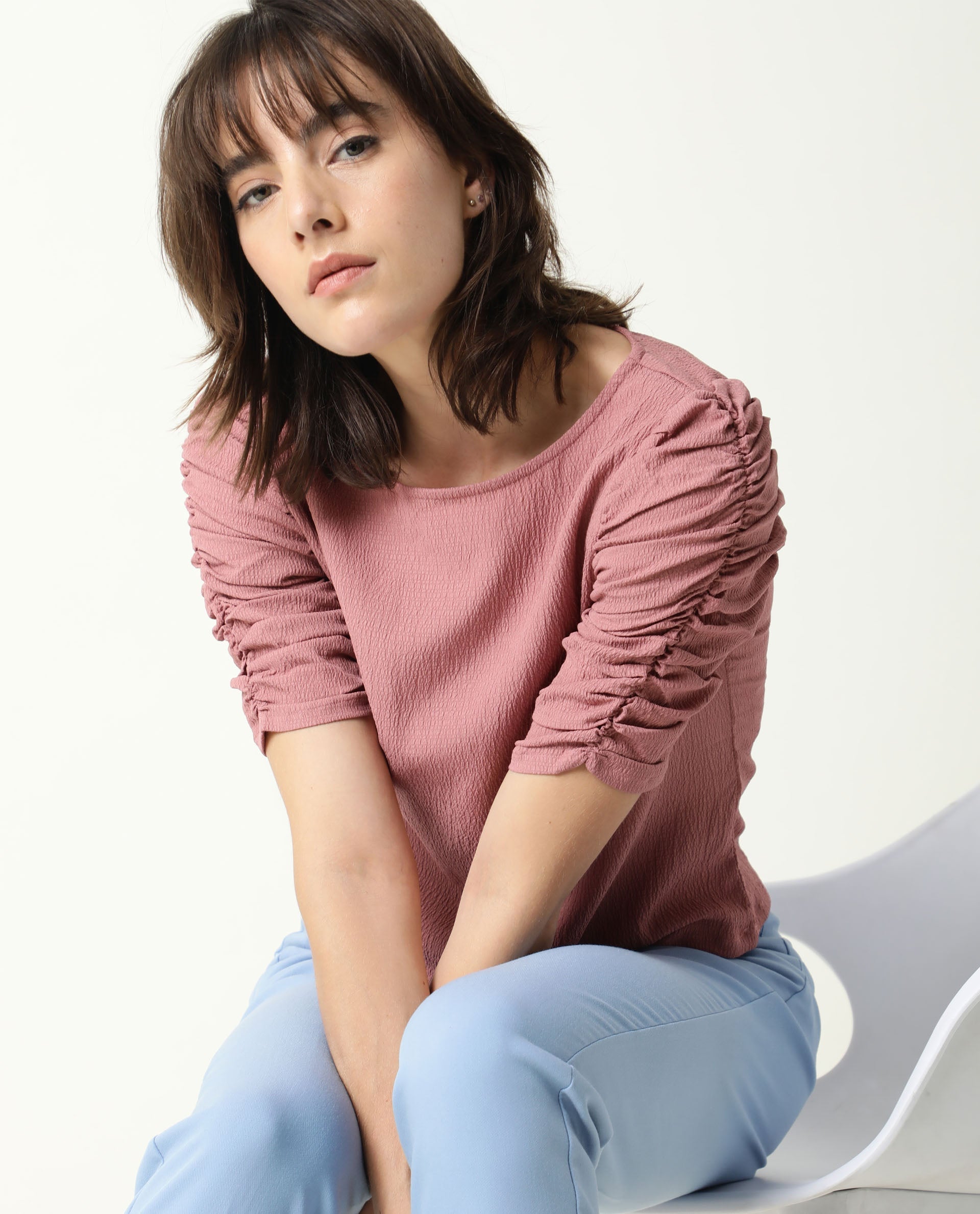 A contemporary style t-shirt top with designed frills on the sleeves.