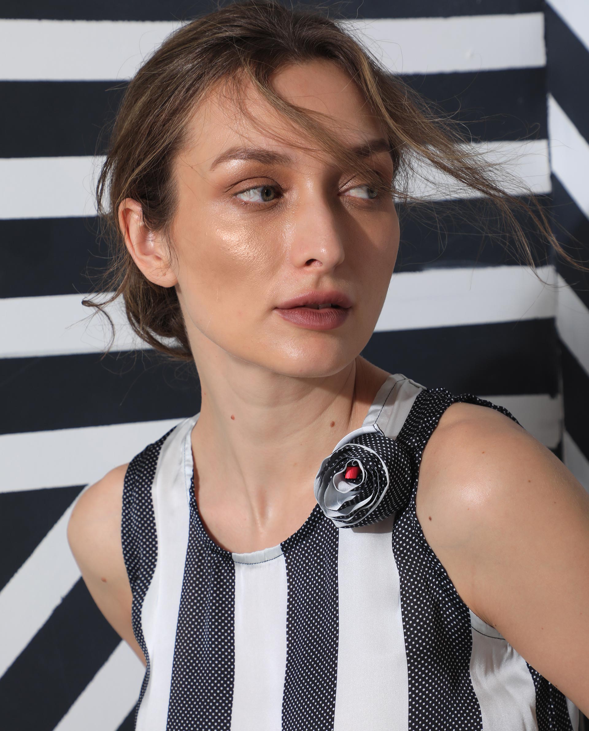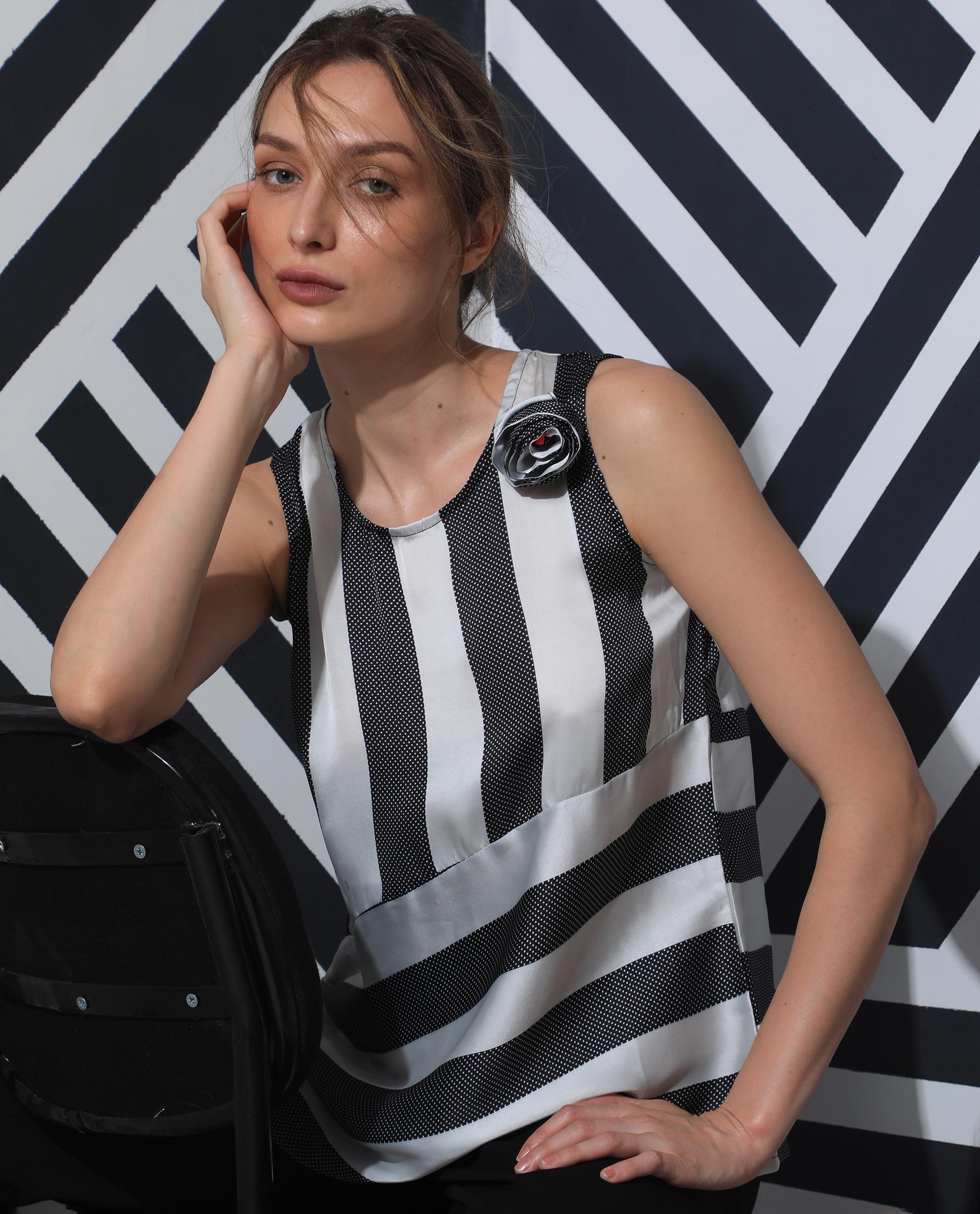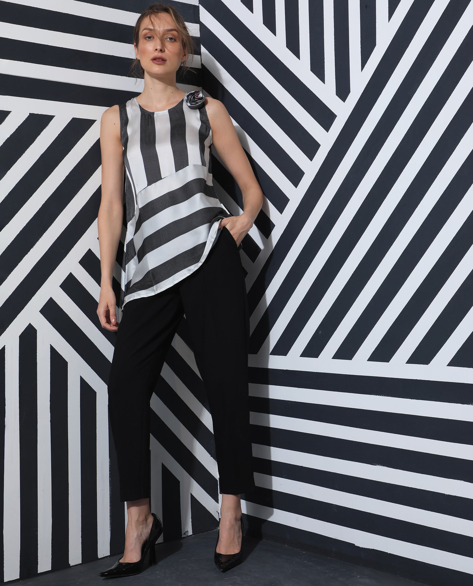 Introducing our New Age Sleeveless Top in a chic stripe print, featuring a round neck, a self-fabric rose brooch, and an asymmetric hem for a contemporary and stylish look.