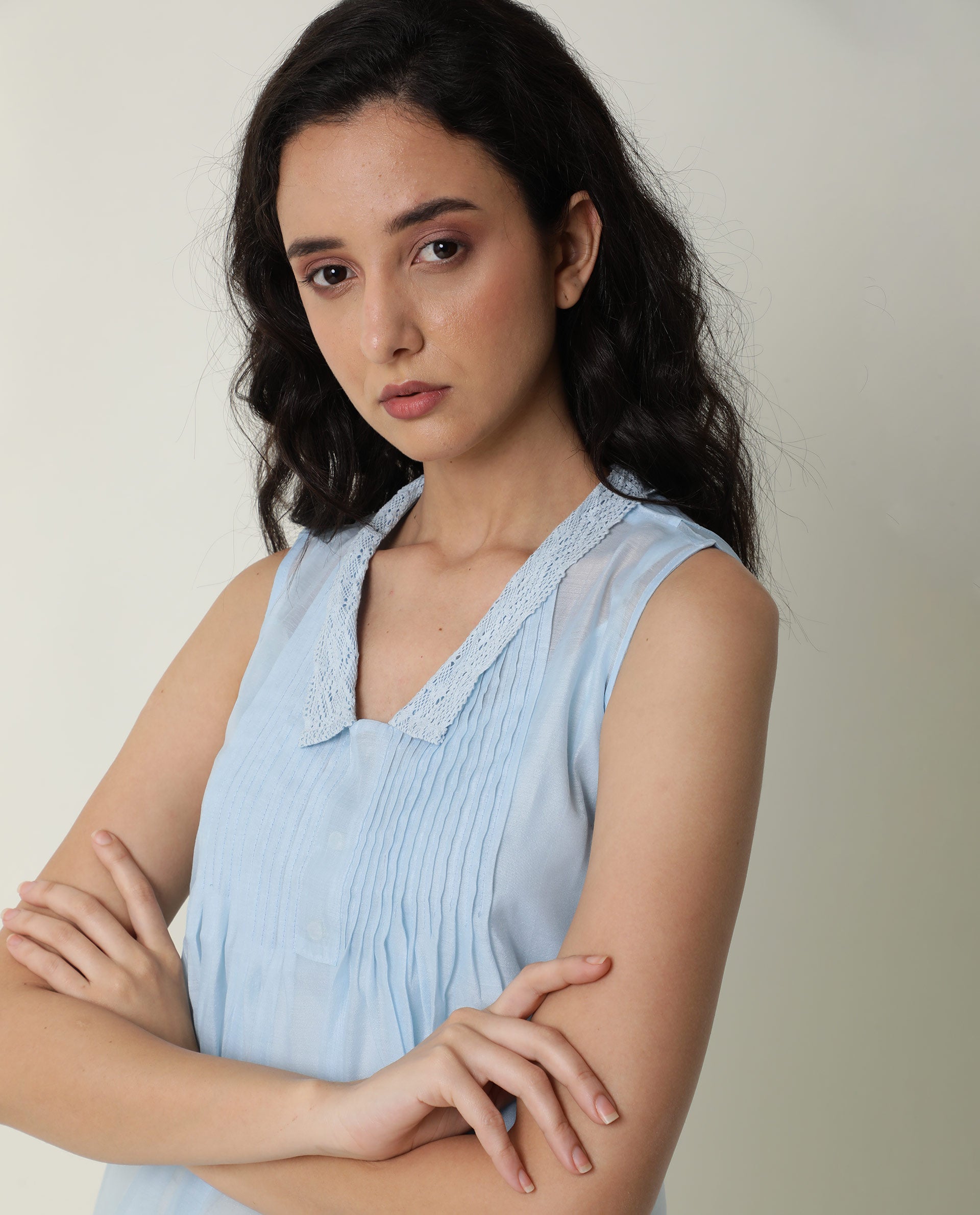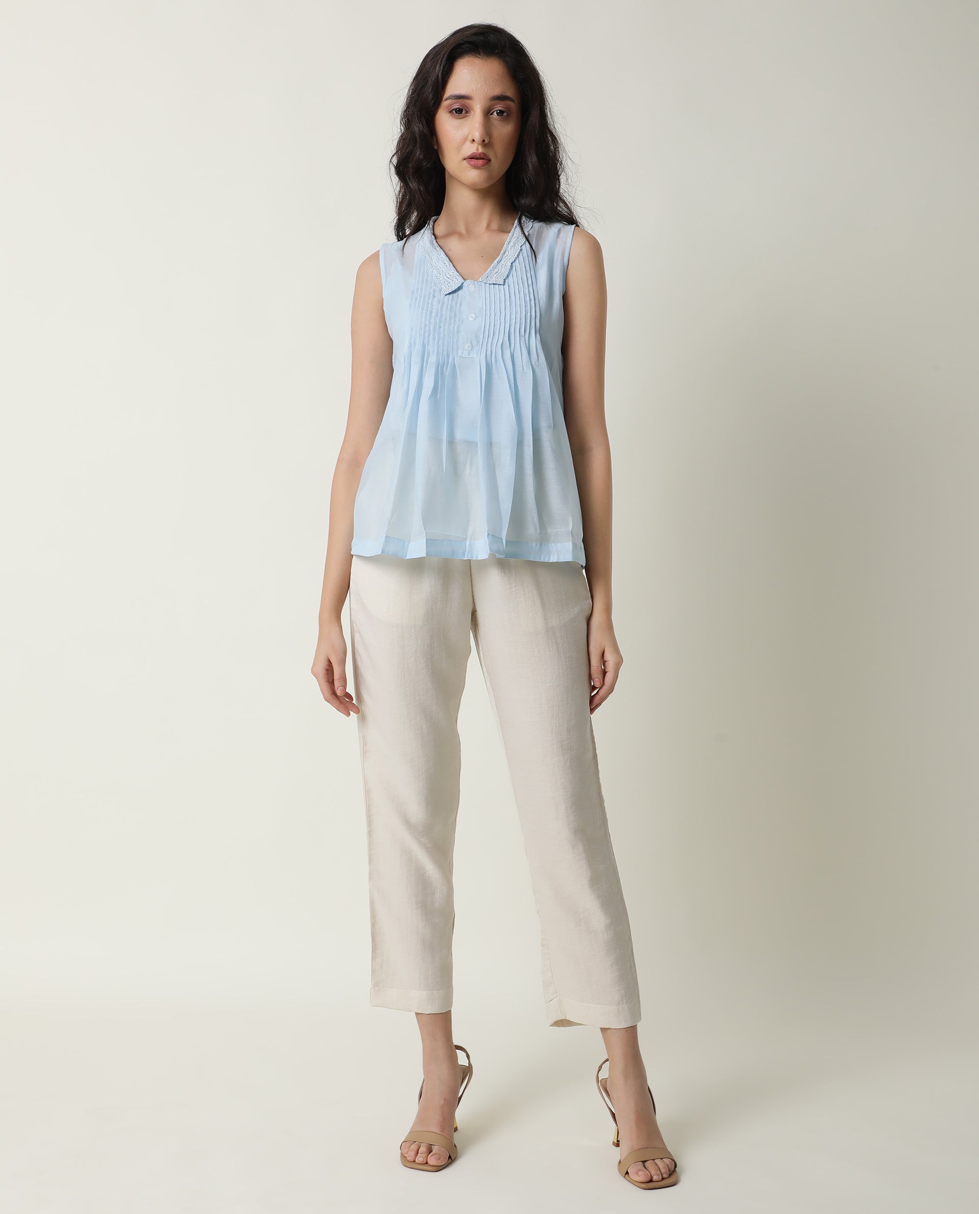 Rareism Women Leisure Blue Cotton Fabric Regular Fit V-Neck Sleeveless Solid Top