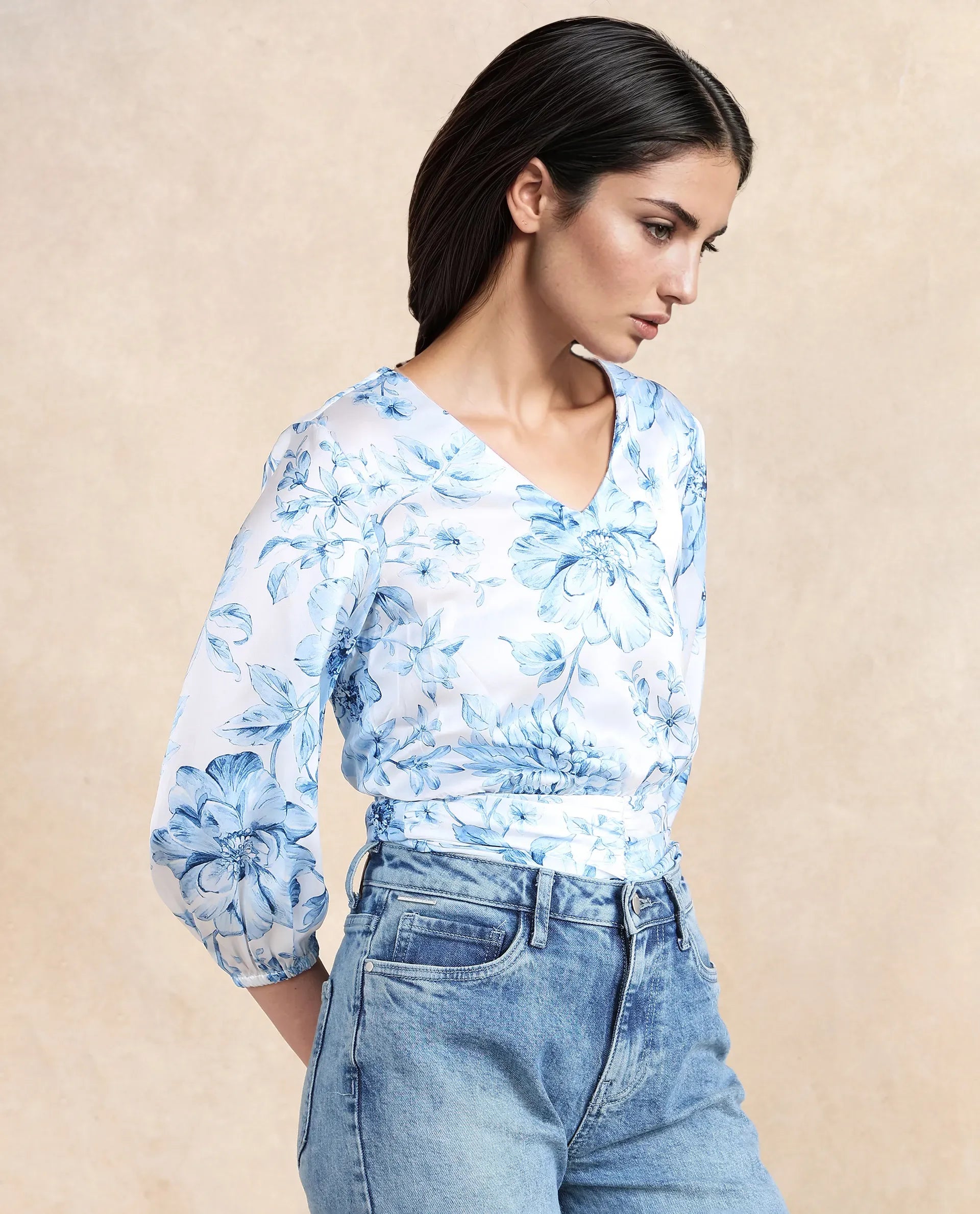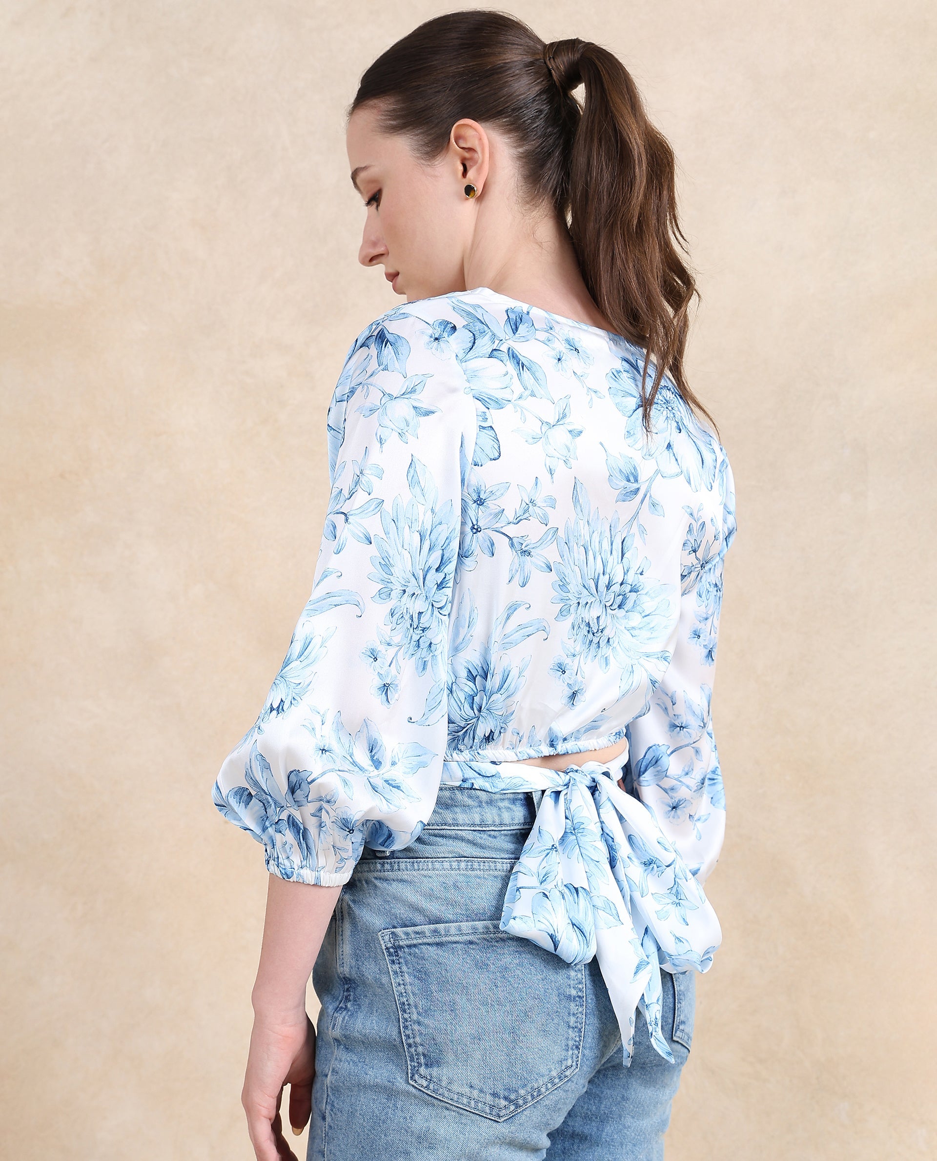 Rareism Women Milan Light Blue Bell Sleeves V-Neck Cropped Floral Print Top