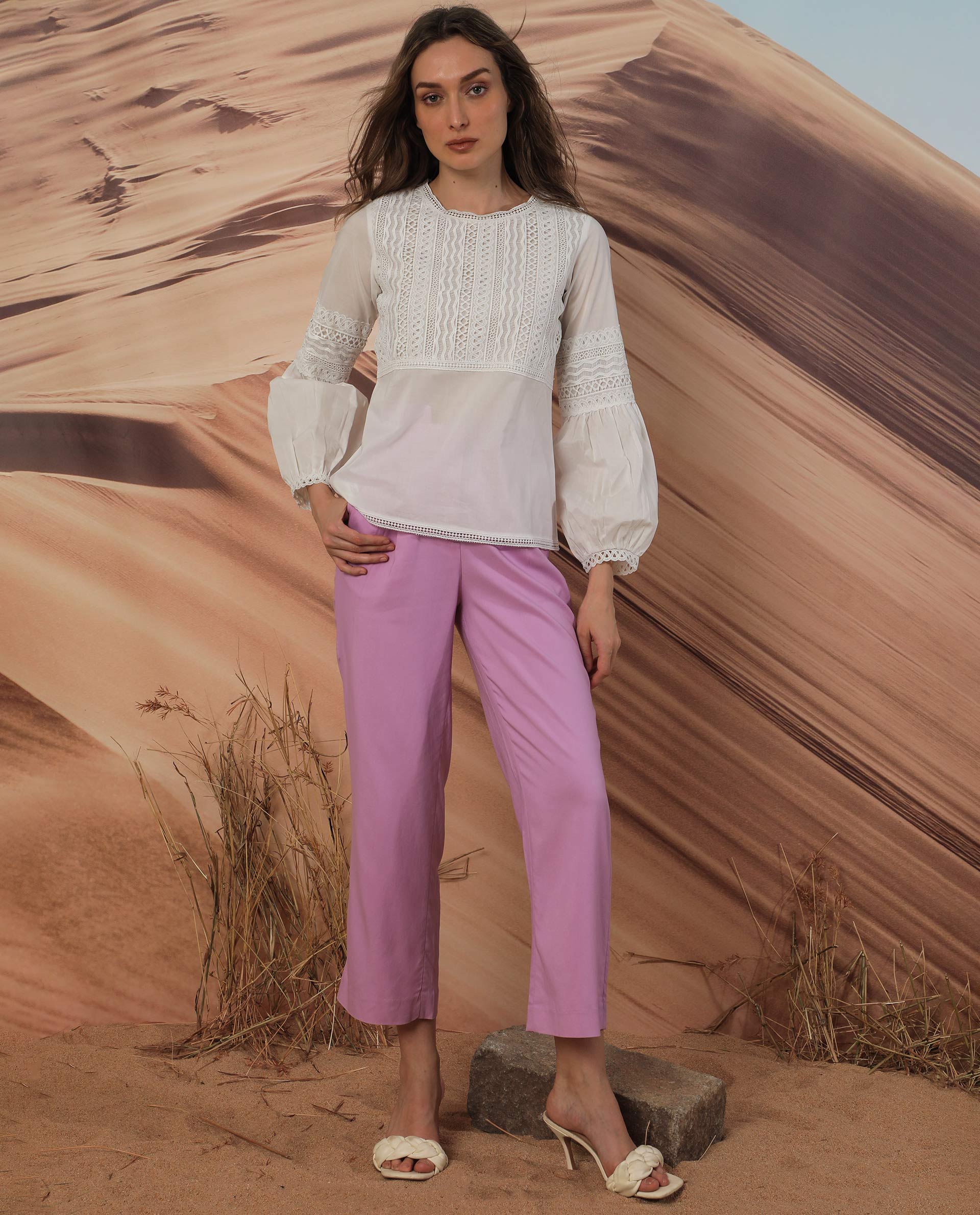 5. Crafted from breathable cotton fabric for comfort and versatility. Pair this lace-detailed blouse with high-waisted jeans and ankle boots for a chic daytime look. Transition seamlessly to evening by swapping jeans for a skirt and adding heels. Accessorize with dainty jewellery and a crossbody bag to complete the ensemble. Perfect for both casual outings and semi-formal occasions, this blouse offers effortless style and versatility.