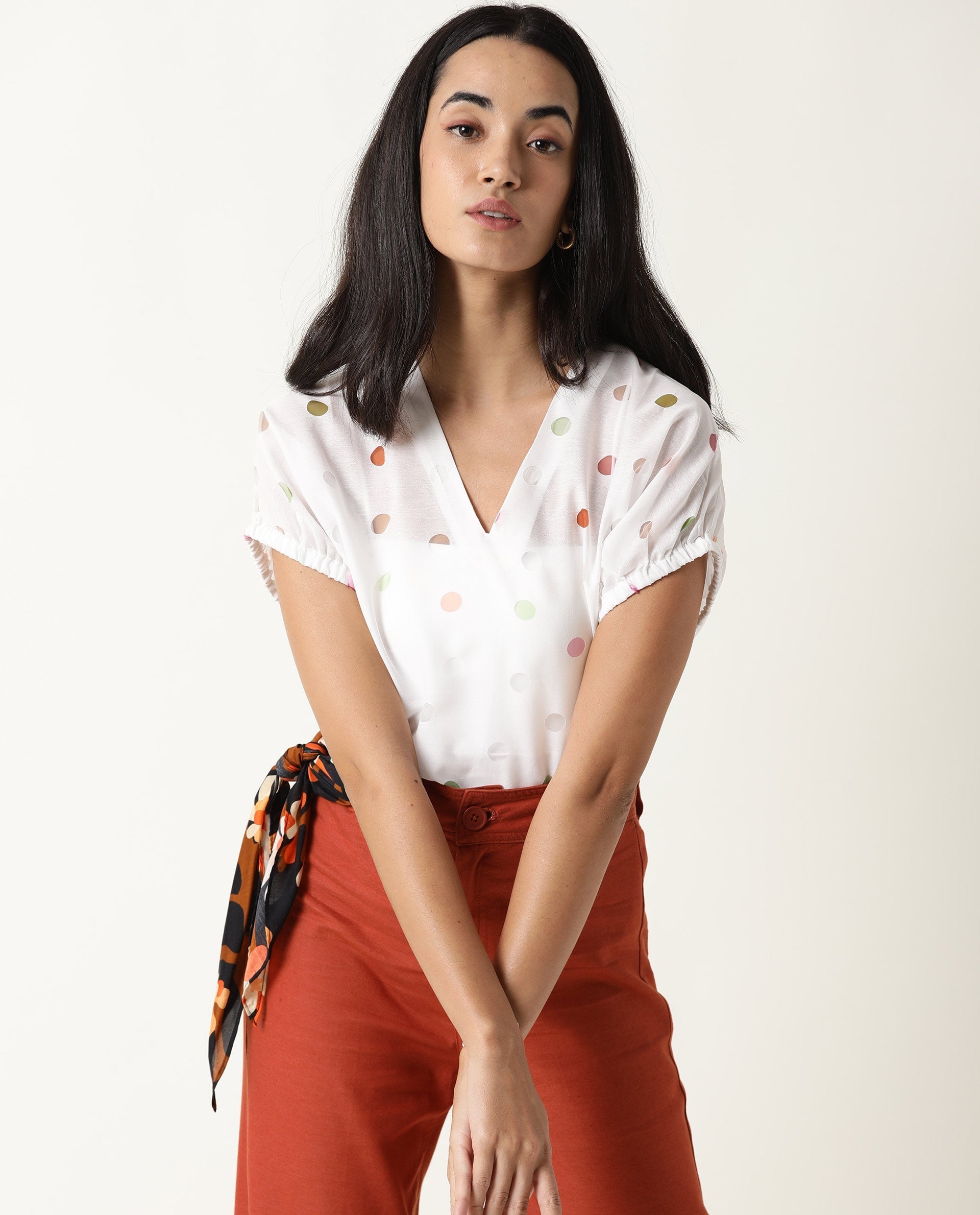 -A urban style relaxed fit top in polka dots all-over with v neck.