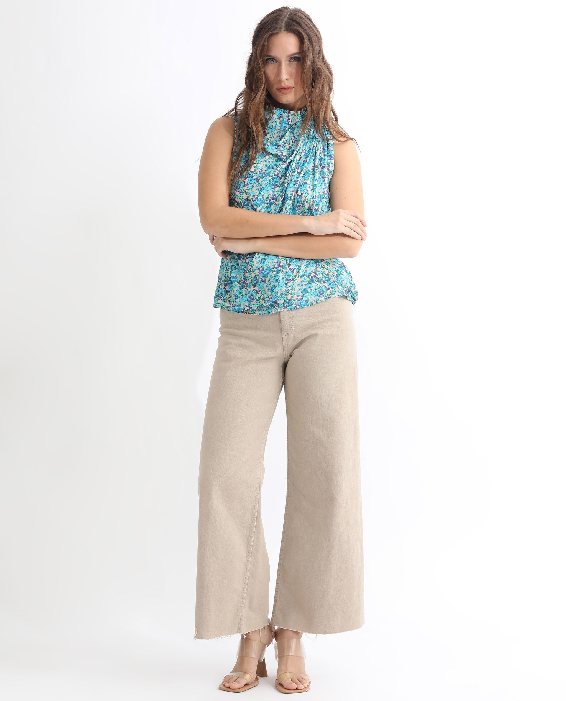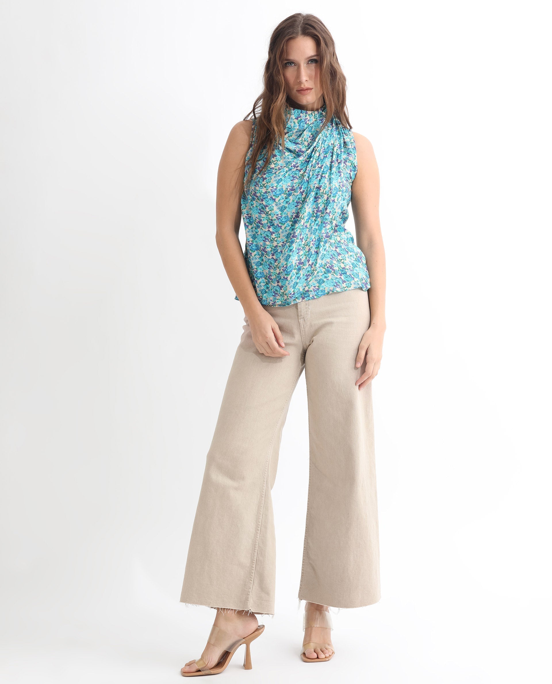Rareism Women Never Blue Cotton Silk Fabric Tailored Fit High Neck Sleeveless Floral Print Top