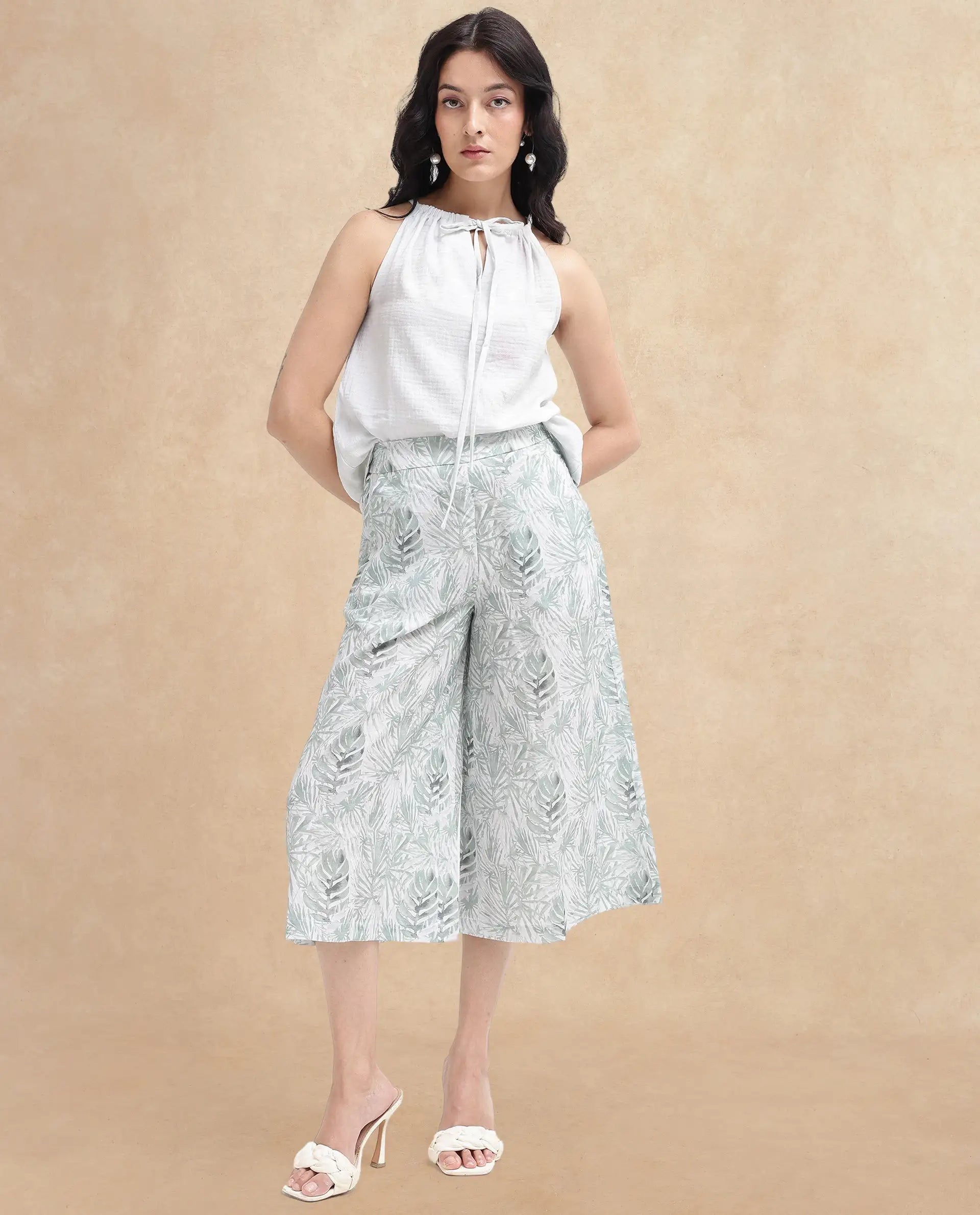 Rareism Women Oliya Off White Cotton Sleeveless Halter Neck Tropical Print Top