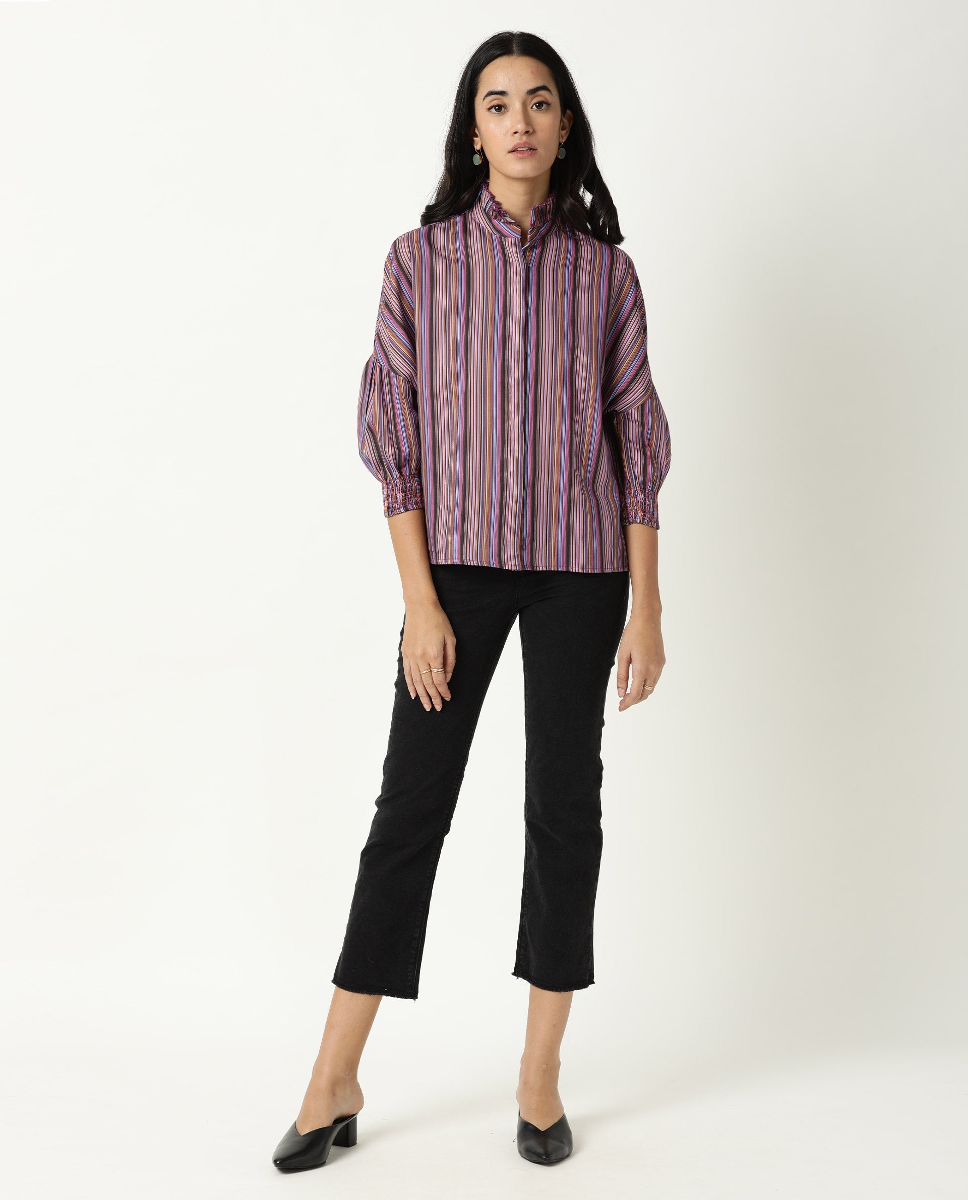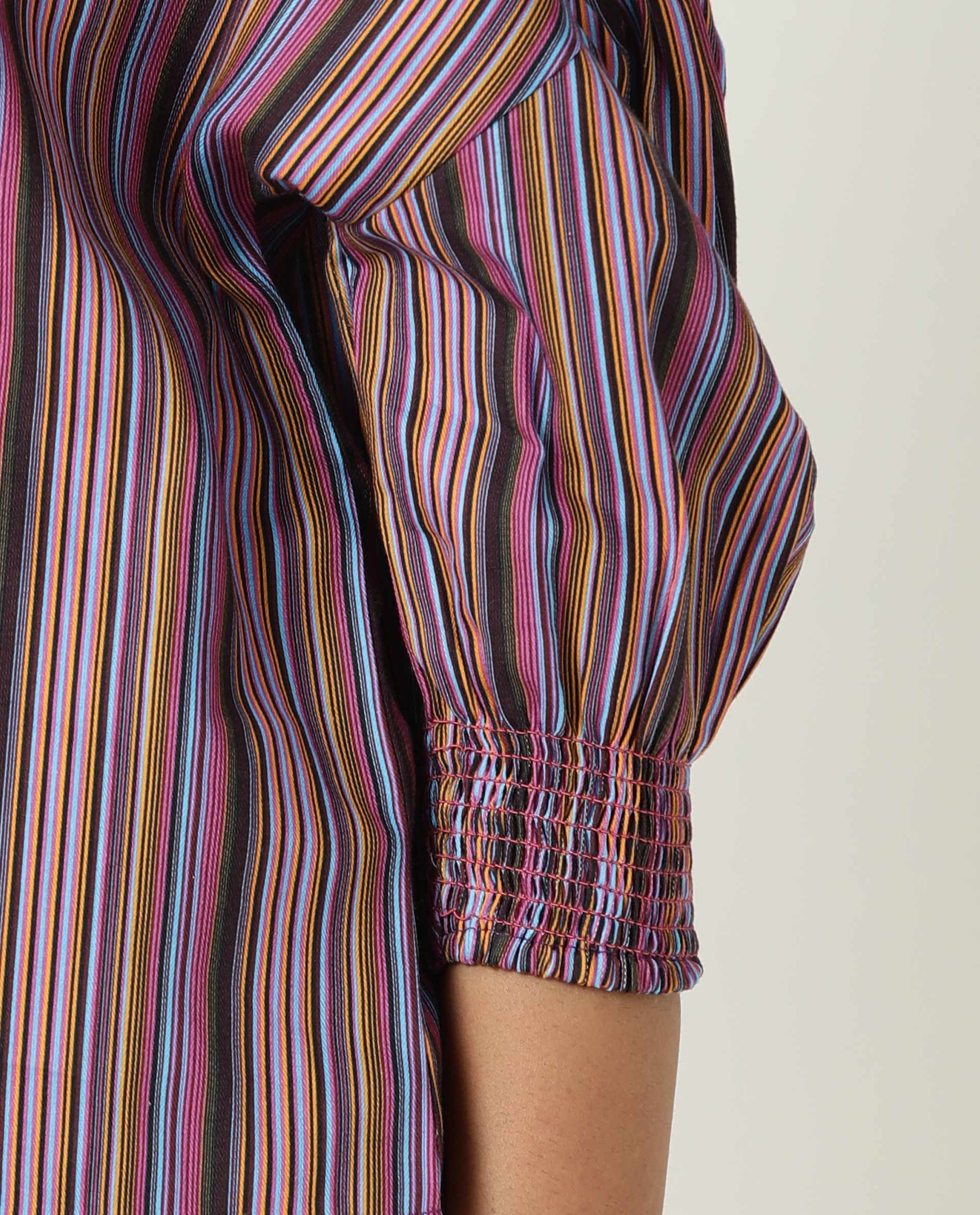 A relaxed with shirt top in strip print with ruffled neck