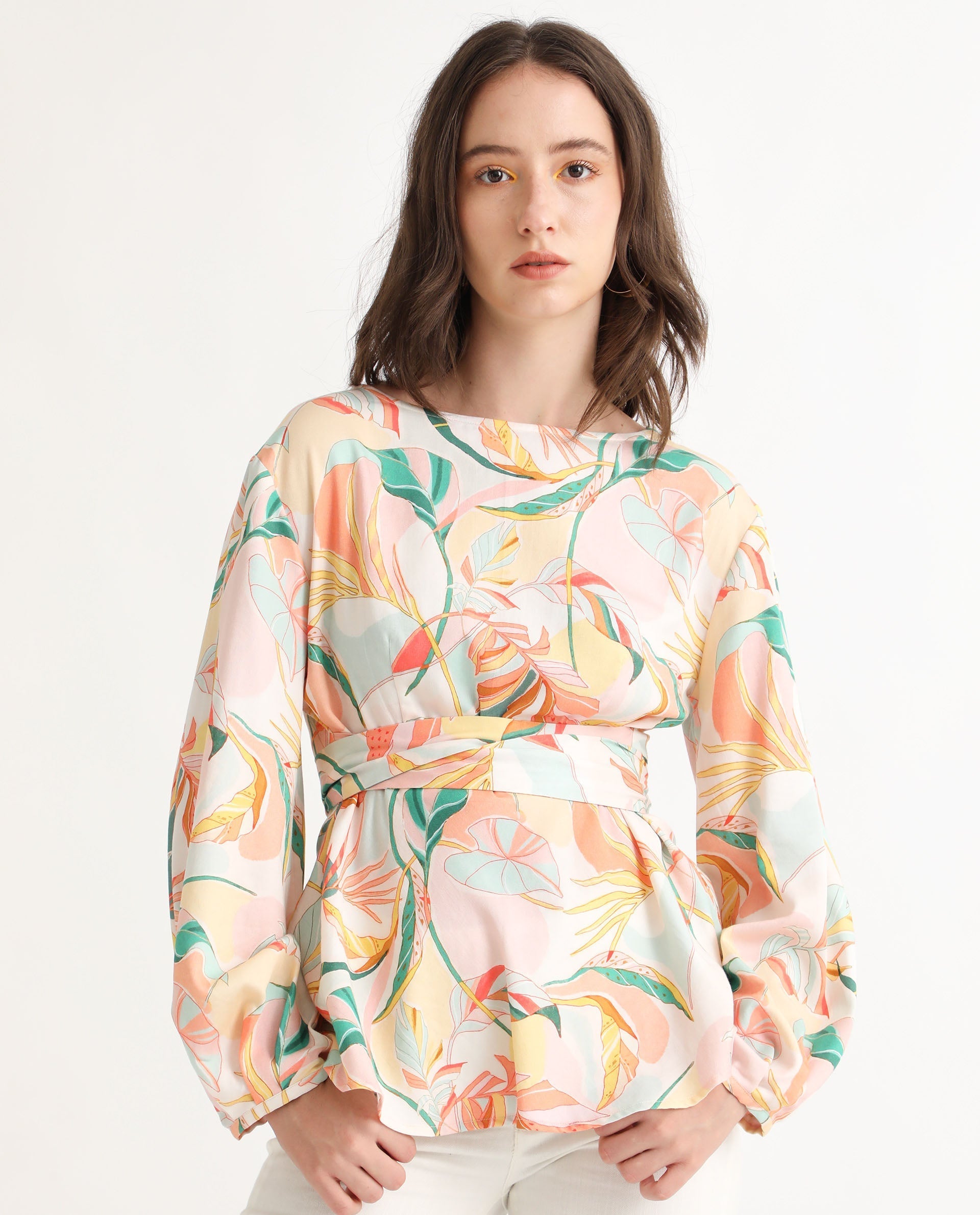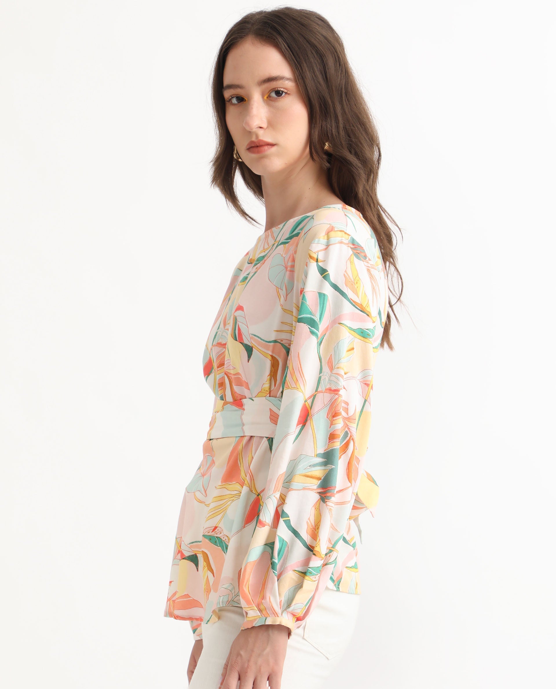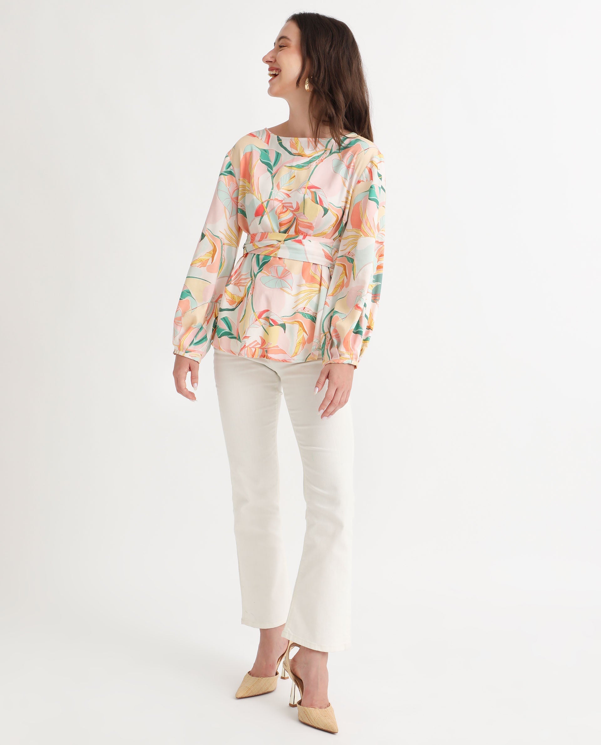 Introducing our Abstract Print Boat Neck Peplum Top, a stylish and versatile piece for your wardrobe. This top features a vibrant abstract print that adds a modern and eye-catching flair to the design. The boat neck neckline offers a stylish and flattering look, while the peplum silhouette creates a feminine and chic silhouette, accentuating your curves in all the right places. Full sleeves provide coverage and elegance, making this top suitable for both casual and dressy occasions. The tie-up detail at the waist adds definition and versatility, allowing you to adjust the fit to your preference. Designed in a regular fit, this top ensures comfort and ease of movement, making it perfect for all-day wear. Whether paired with jeans for a casual outing or dressed up with trousers for a night out, this abstract print peplum top is sure to become a staple in your wardrobe.