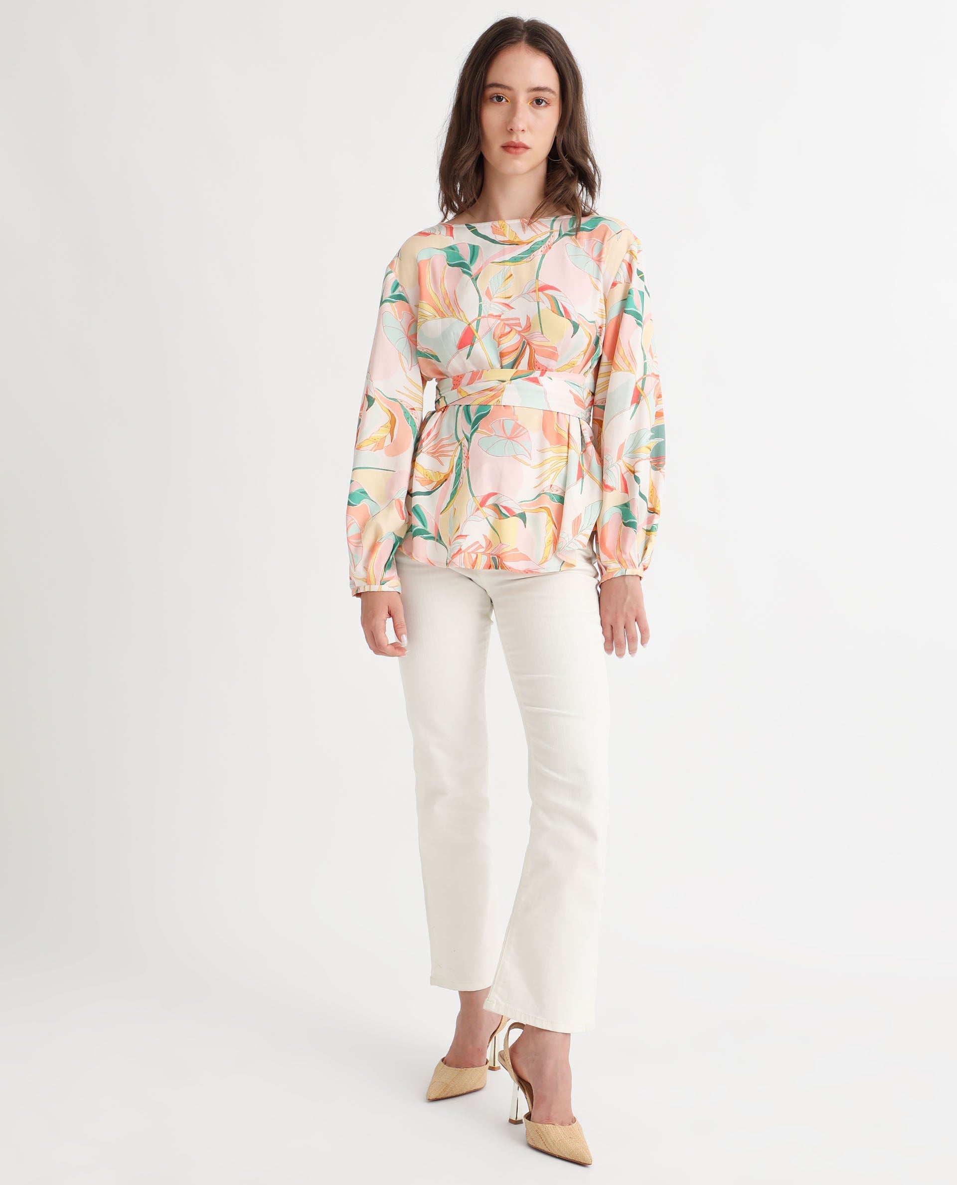 Rareism Women Rolina Multi Cotton Fabric Full Sleeves Boat Neck Regular Fit Abstract Print Top